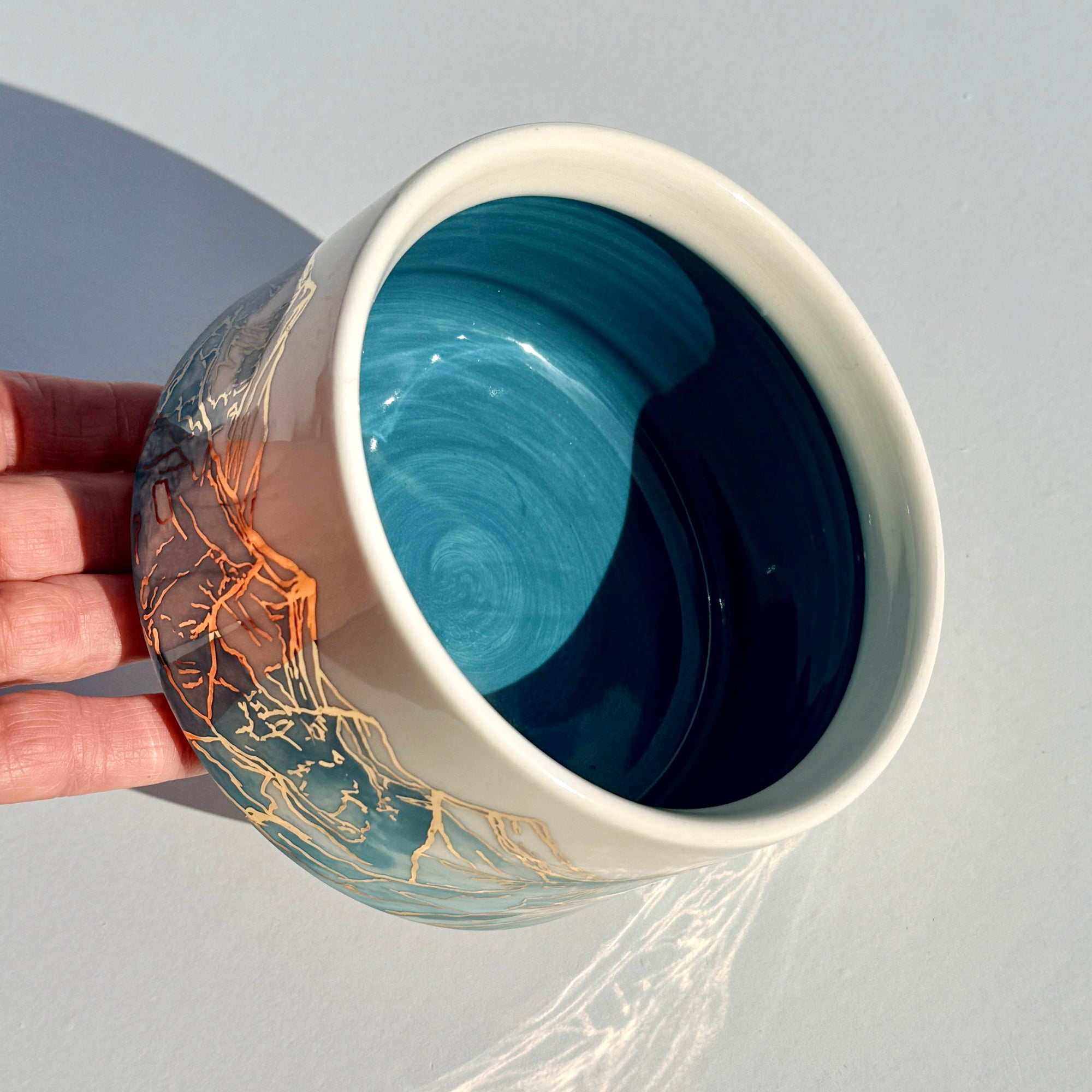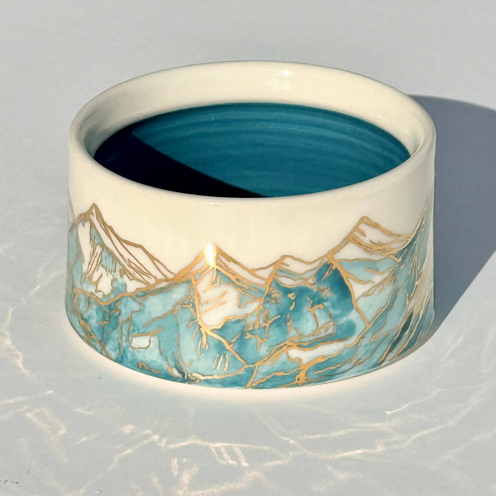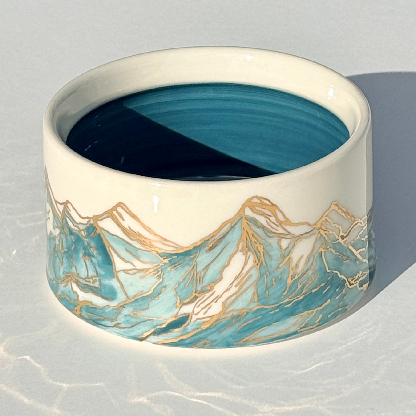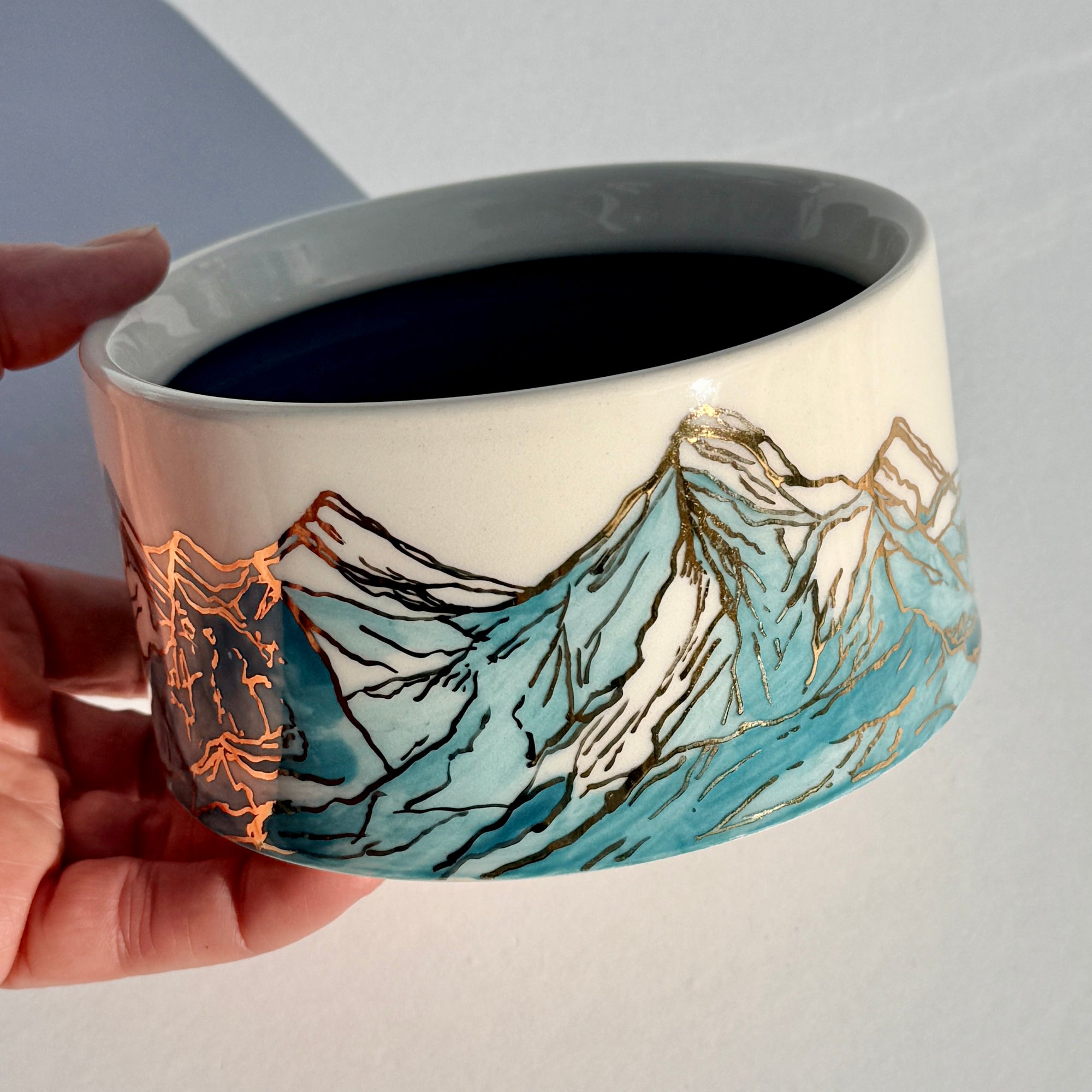 The sparkle on the blue mountains on this bowl is 24k gold! The gold is applied to the glazed piece and then it is fired an additional time.