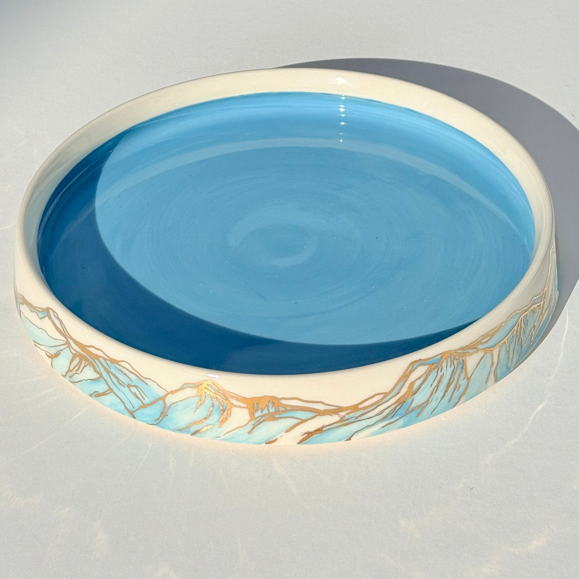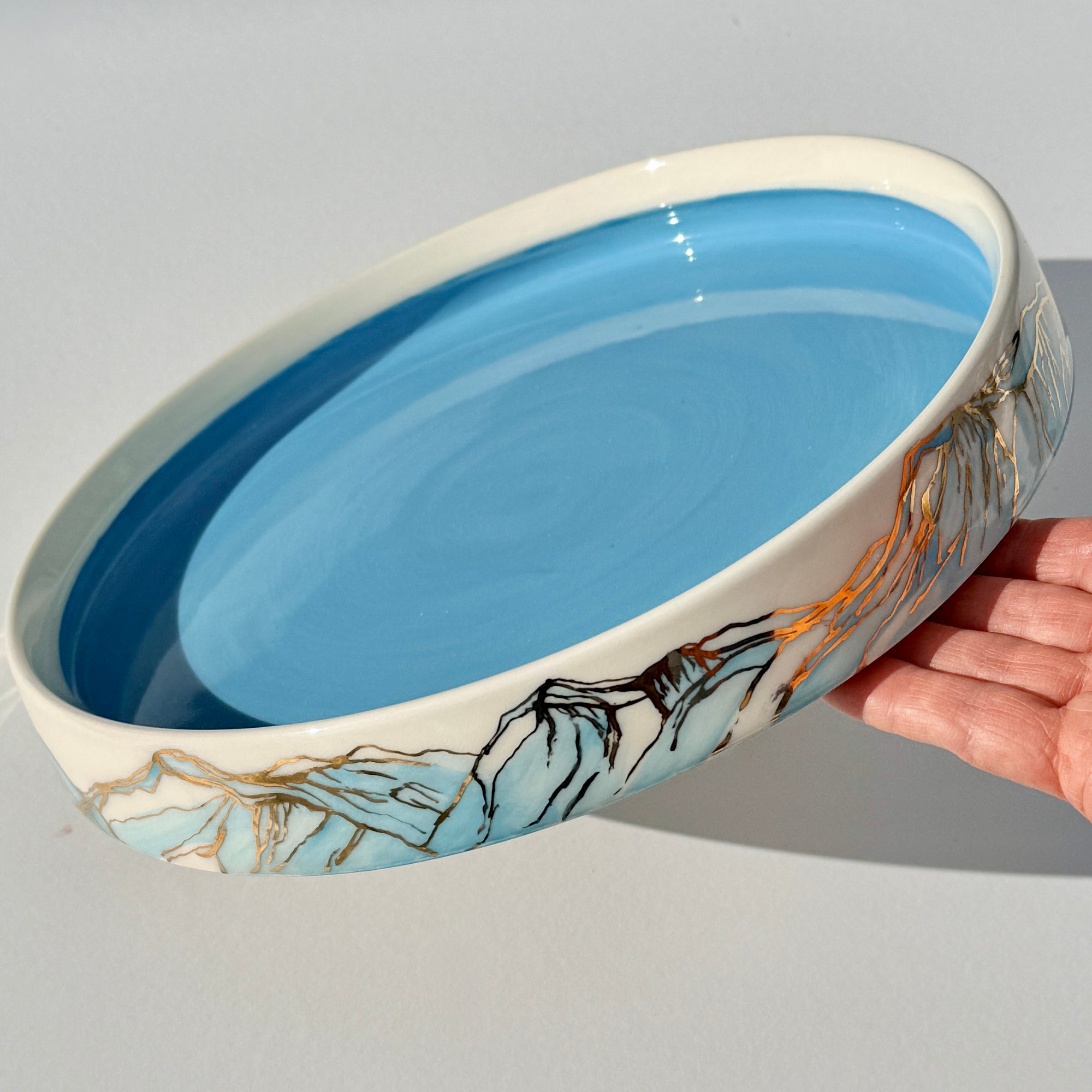 The sparkle on the blue mountains on this platter is 24k gold! The gold is applied to the glazed piece and then it is fired an additional time.