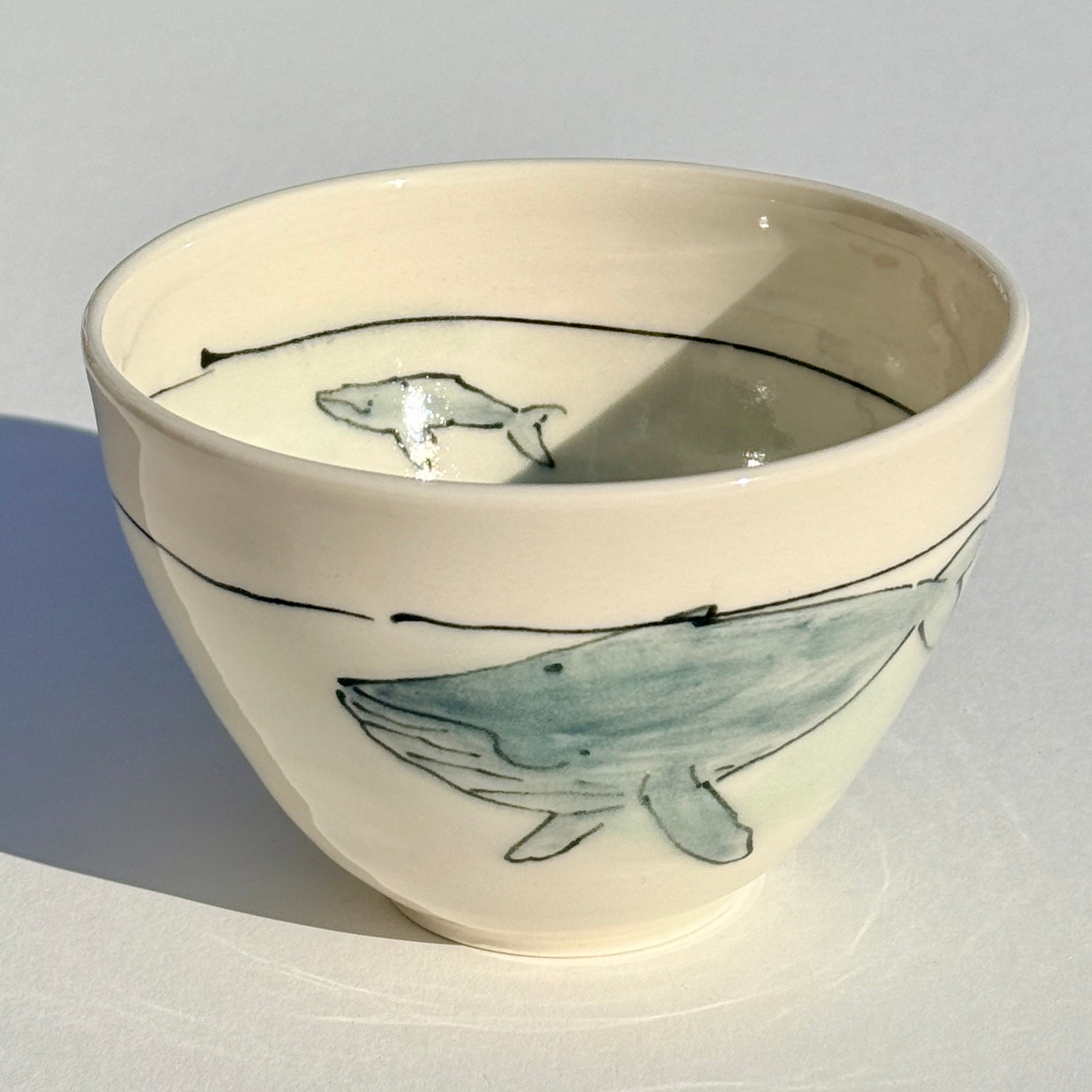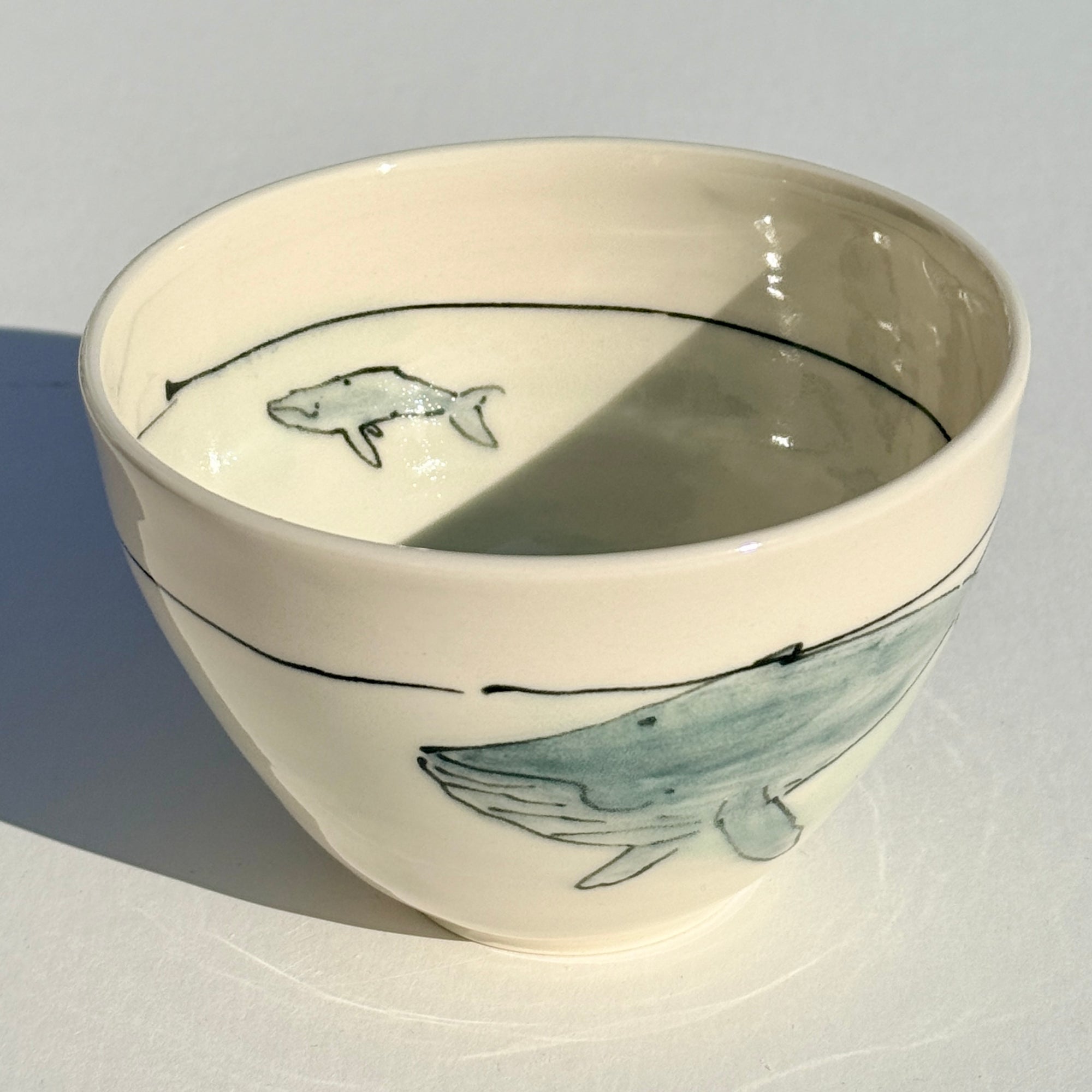 This bowl features a whale on both the inside and outside.About 13 centimetres wide and 9 centimetres tall.
