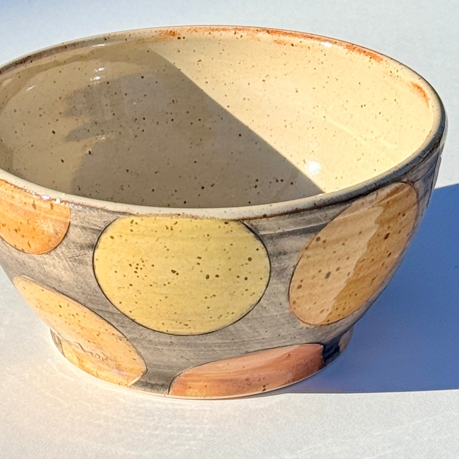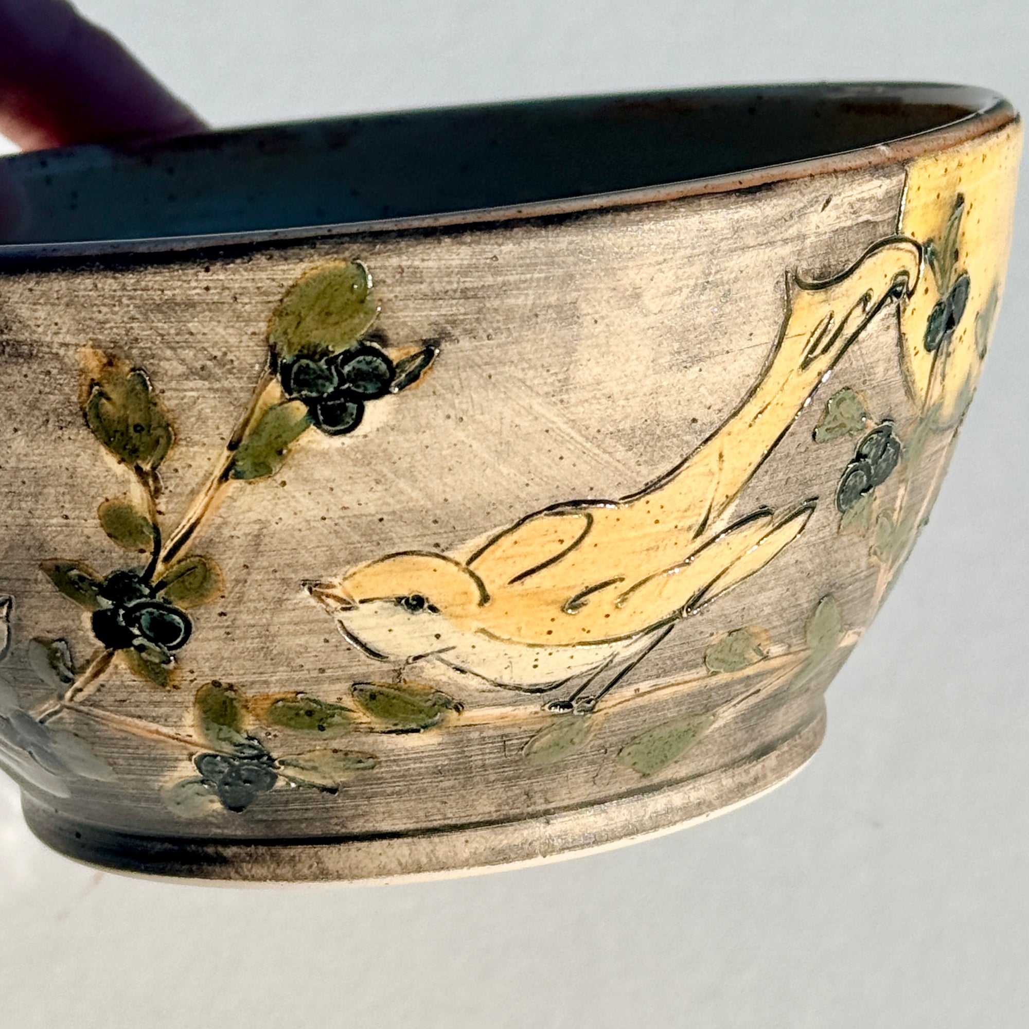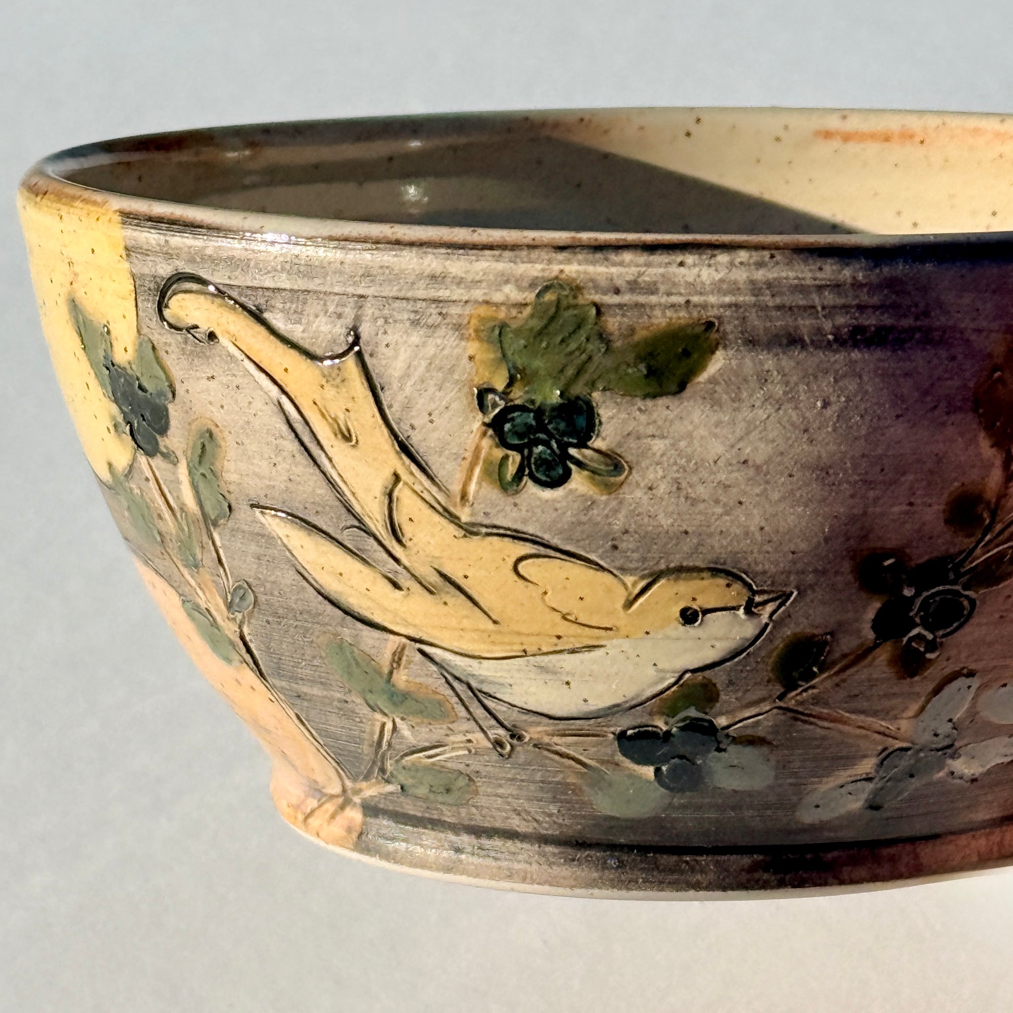 Bowl with birds, juniper branches, and colourful circles on a black background and a speckled tan interior.