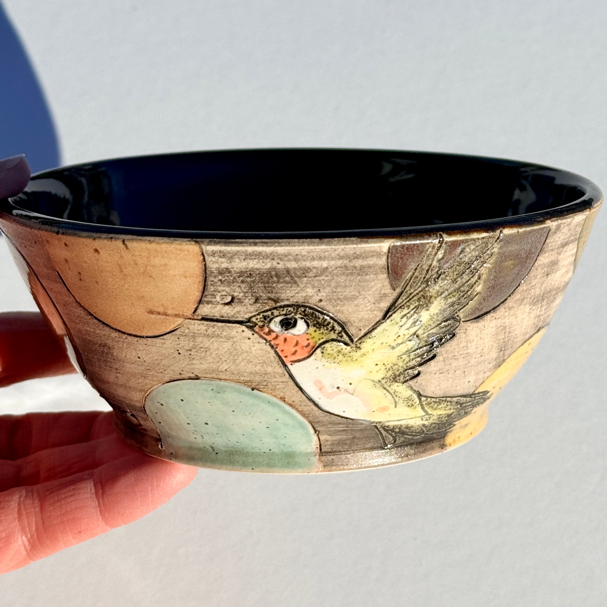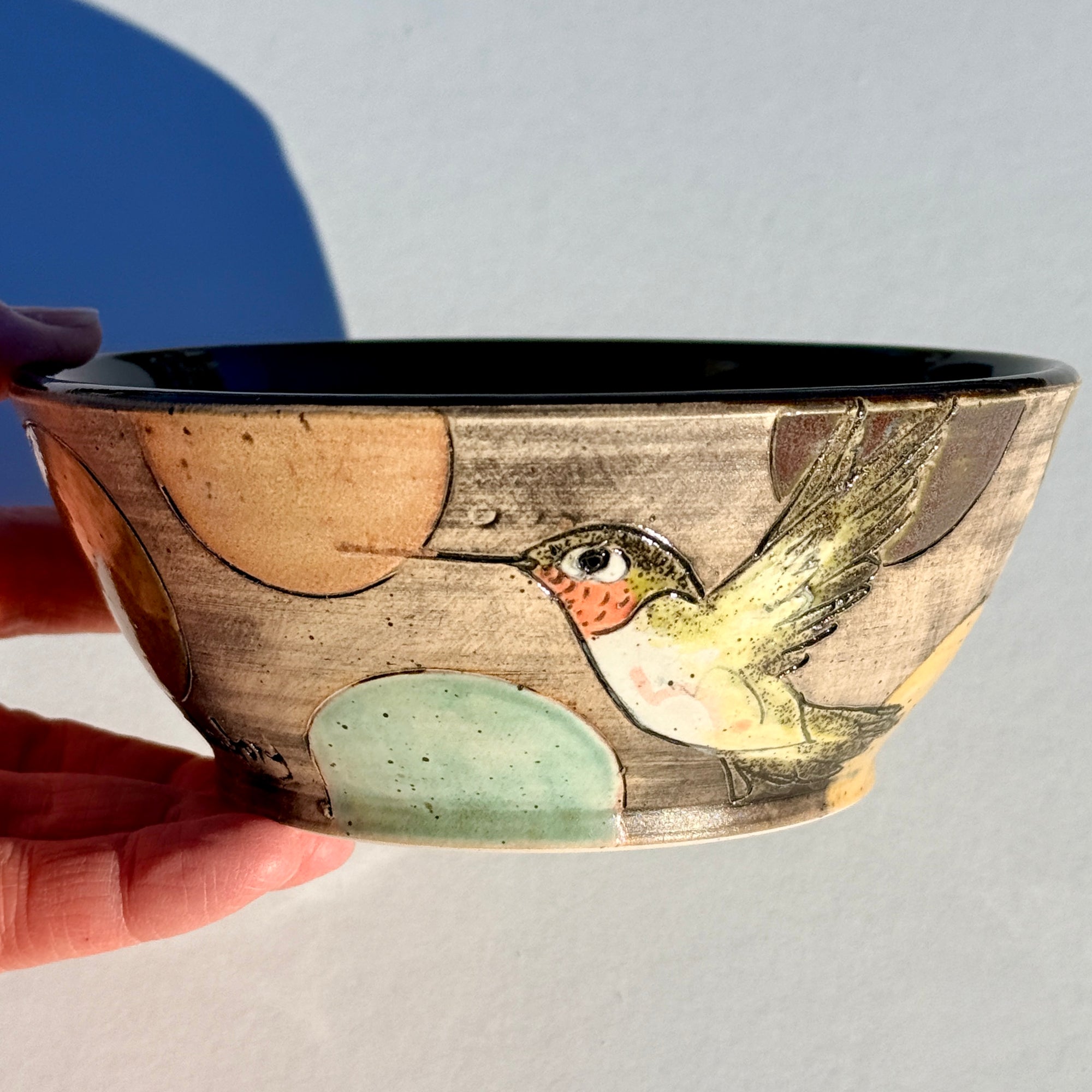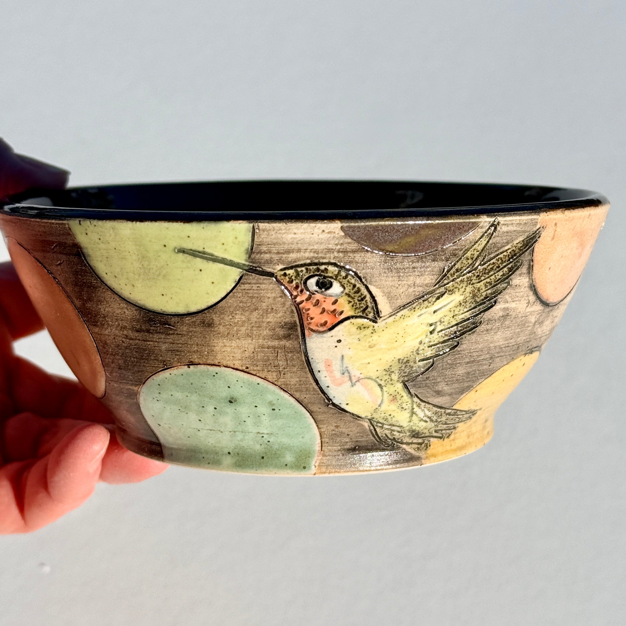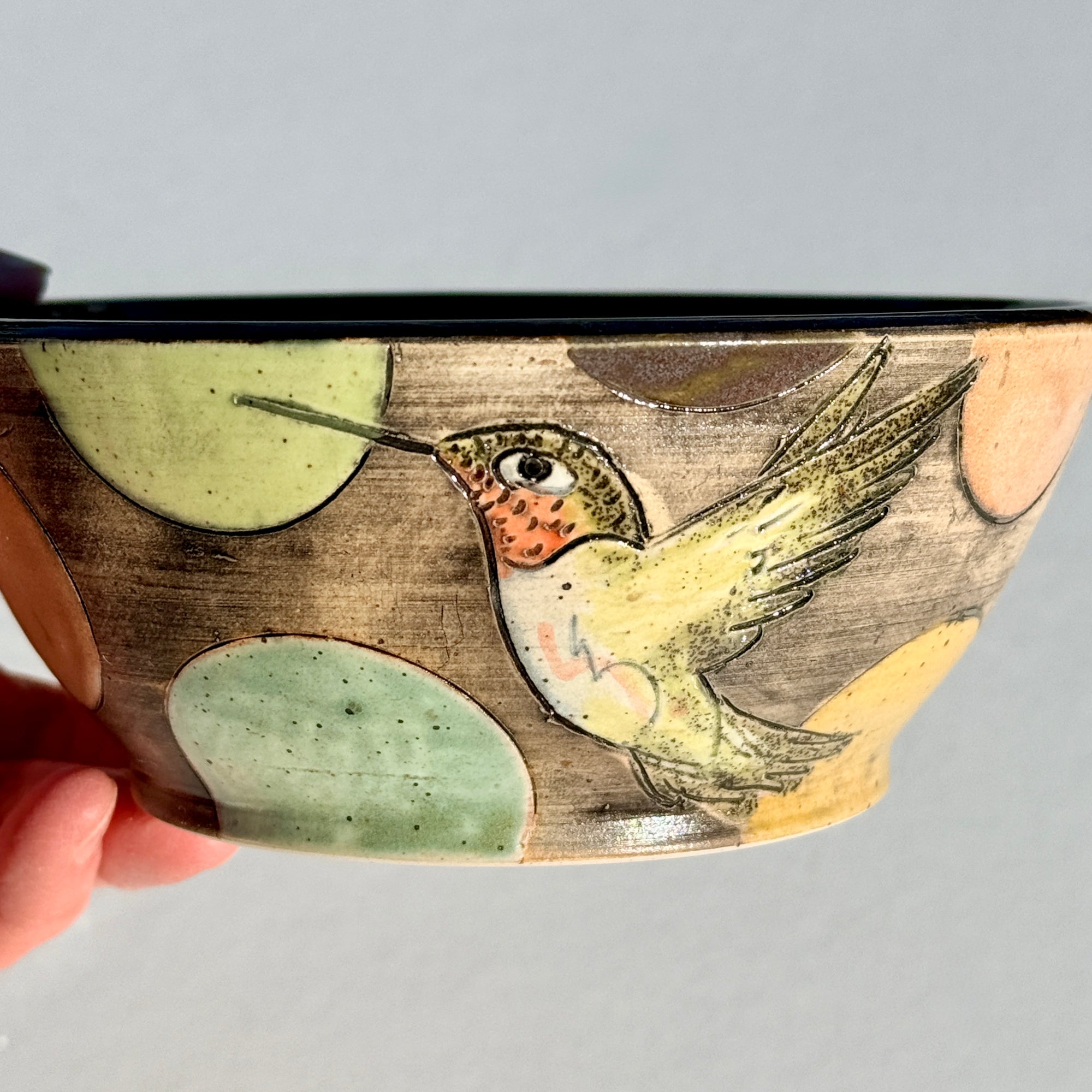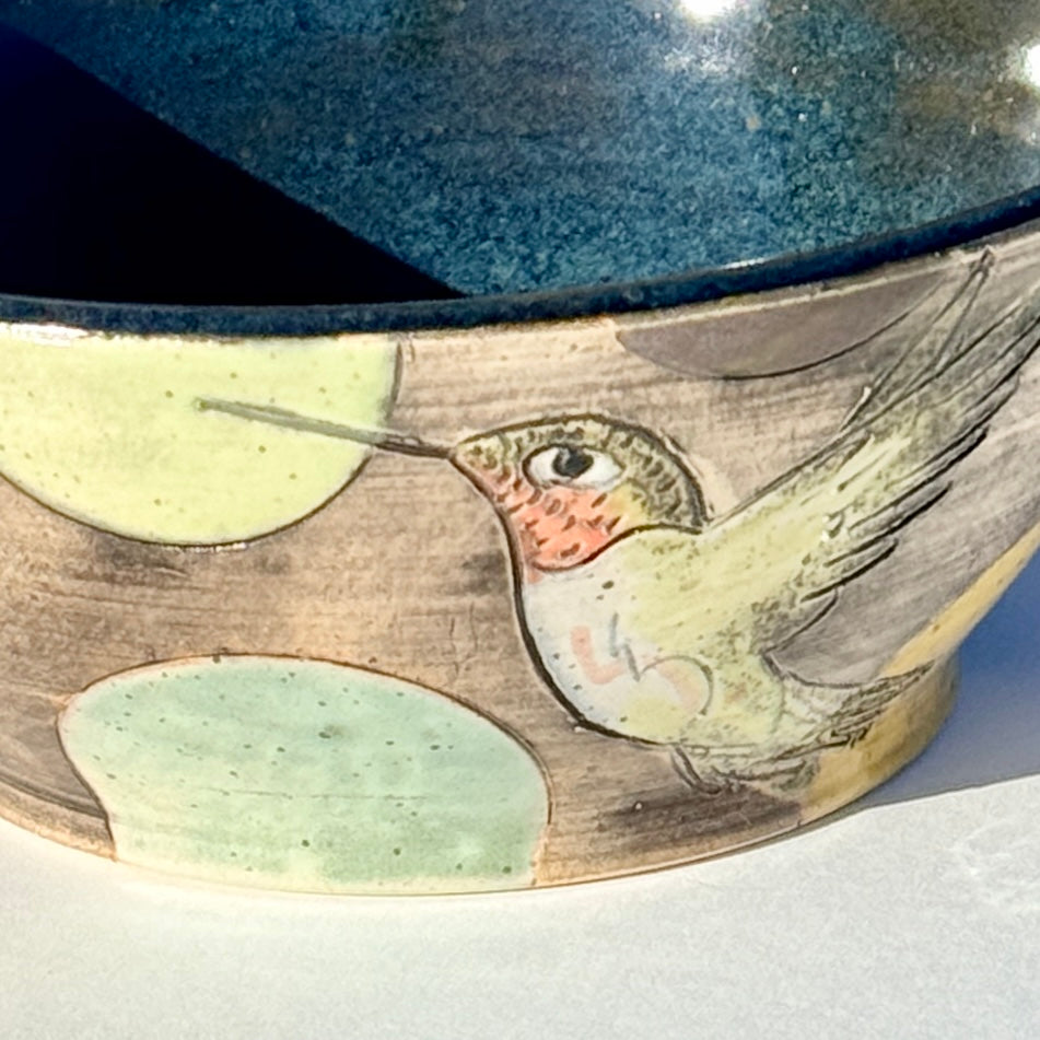 Bowl with hummingbirds and colourful circles on a black background.