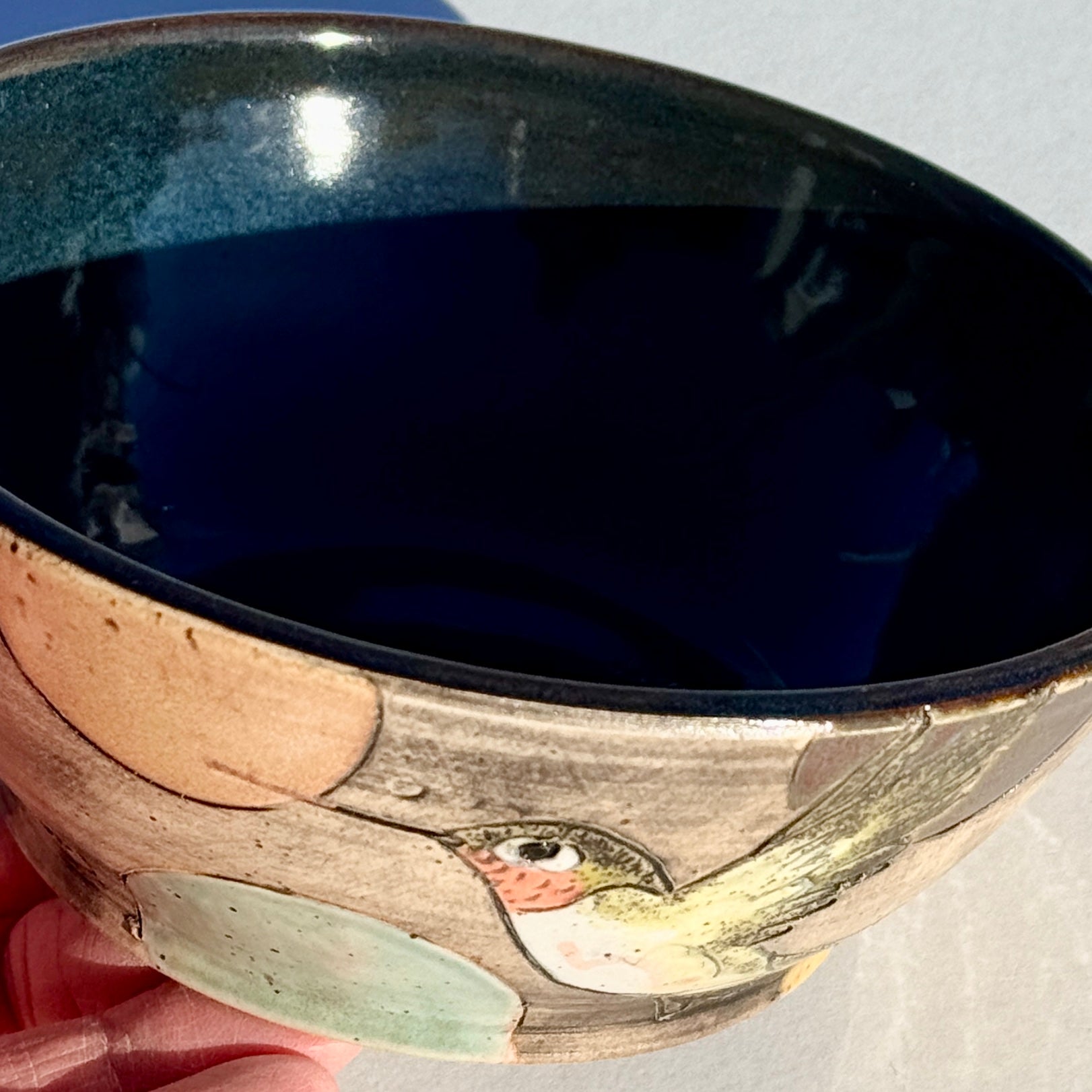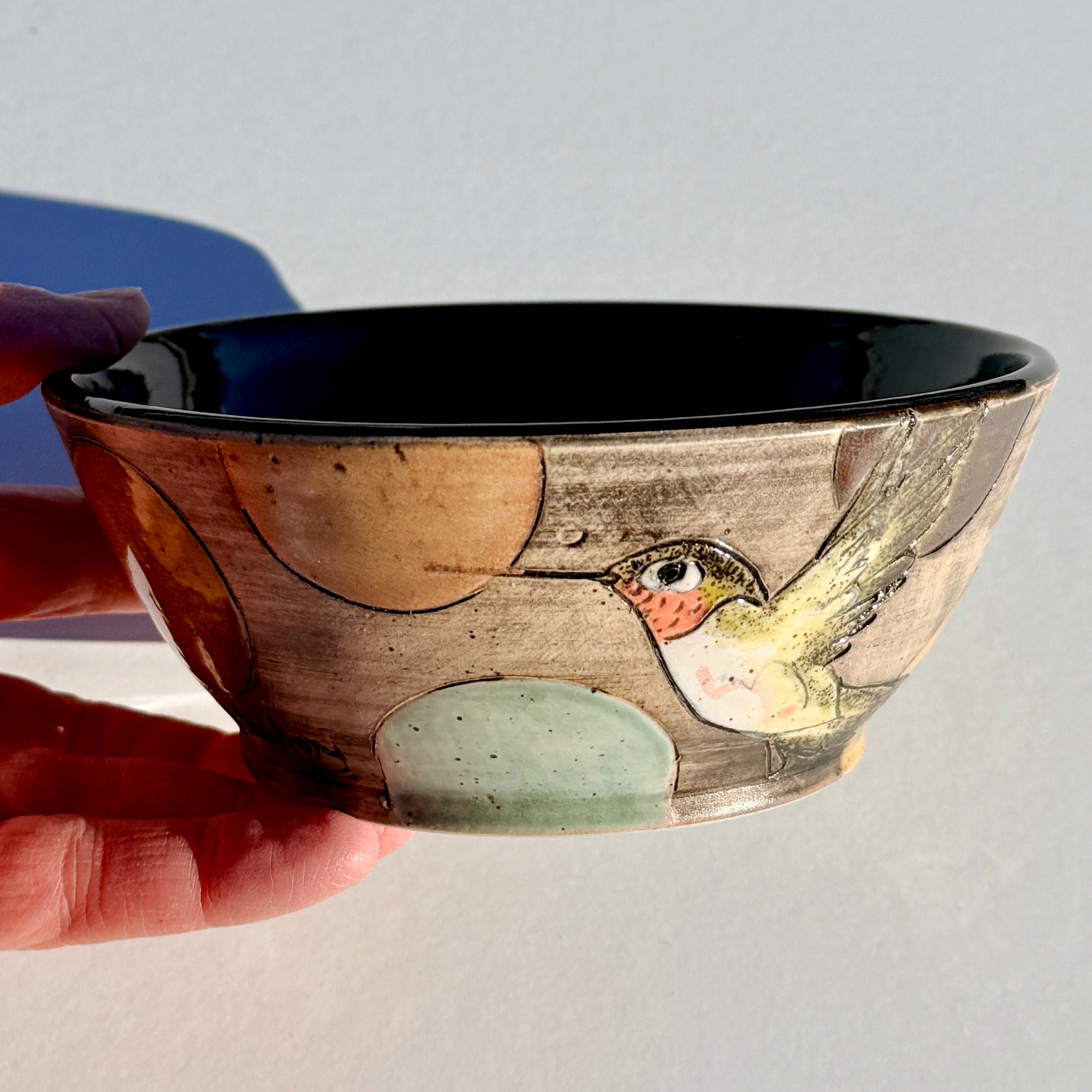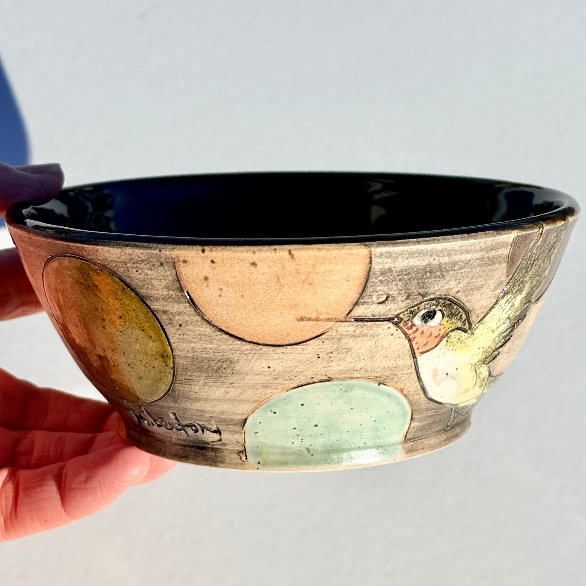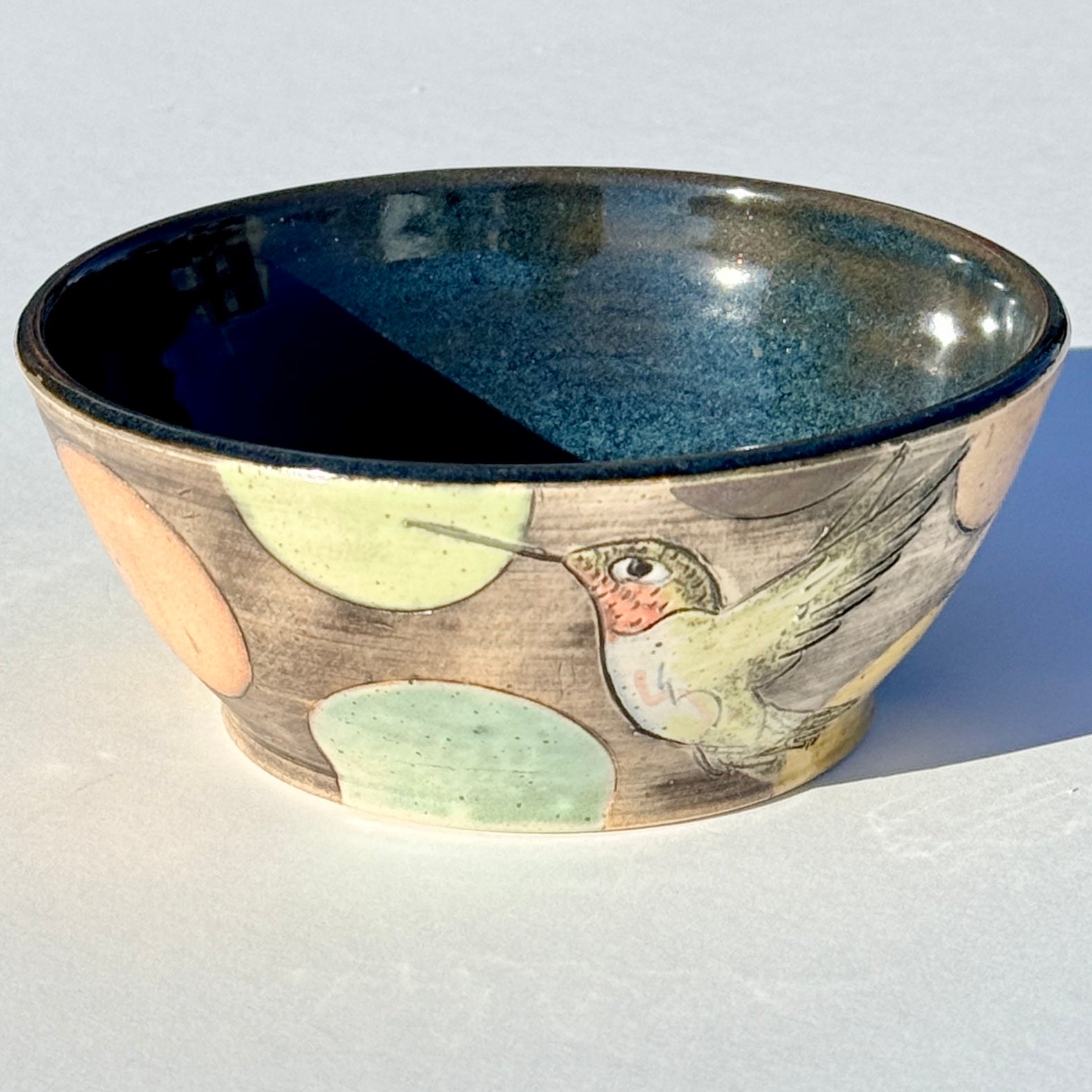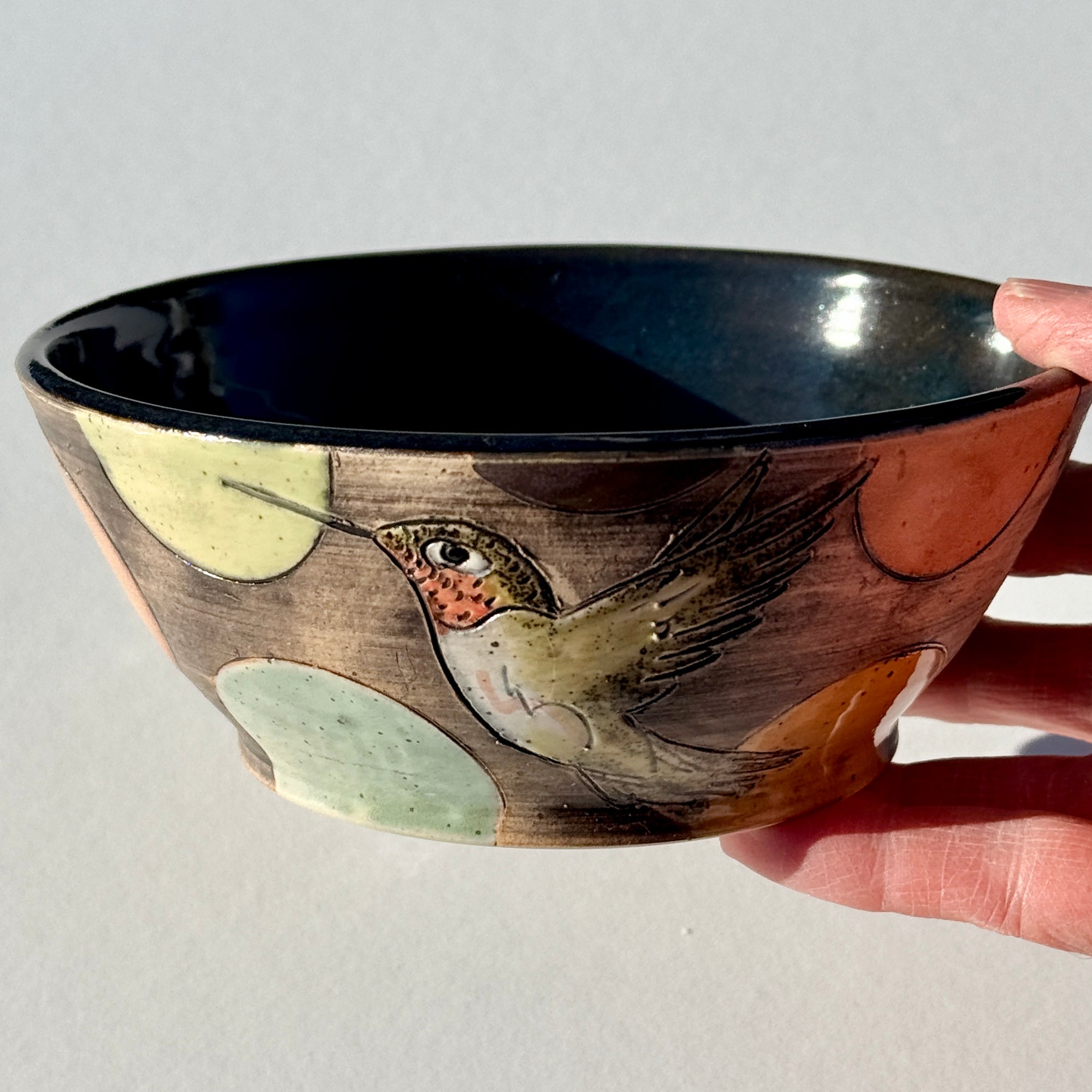 Bowl with hummingbirds and colourful circles on a black background.