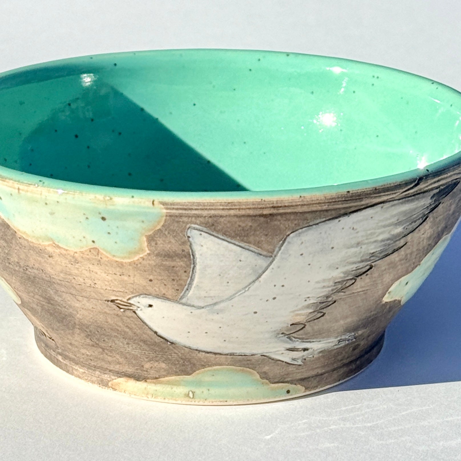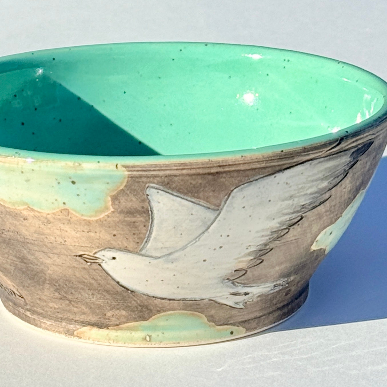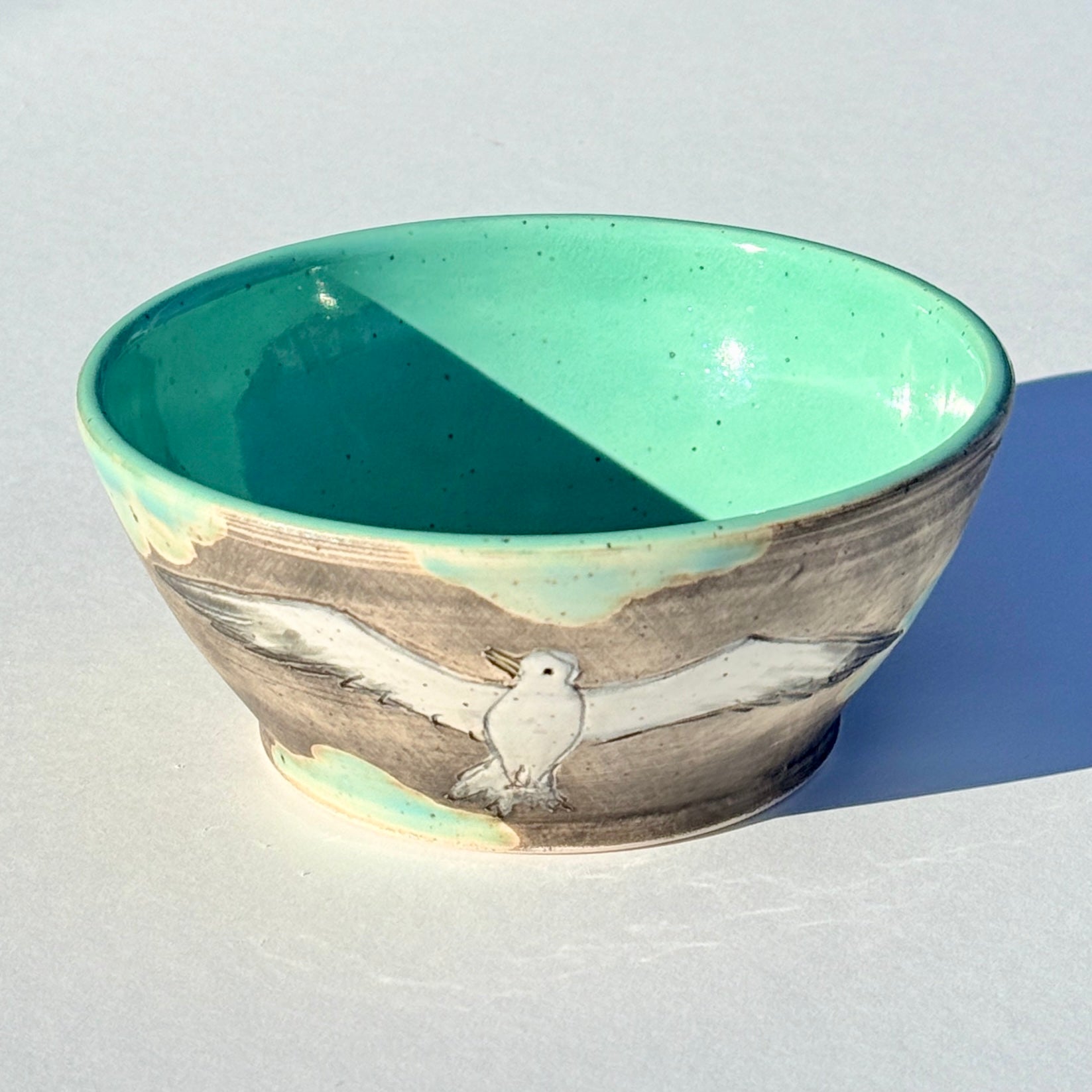 Bowl with seagulls and colourful circles on a black background with teal interior.