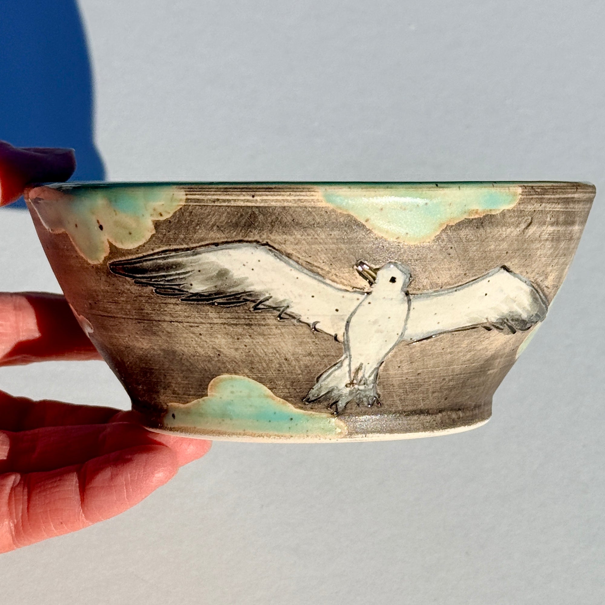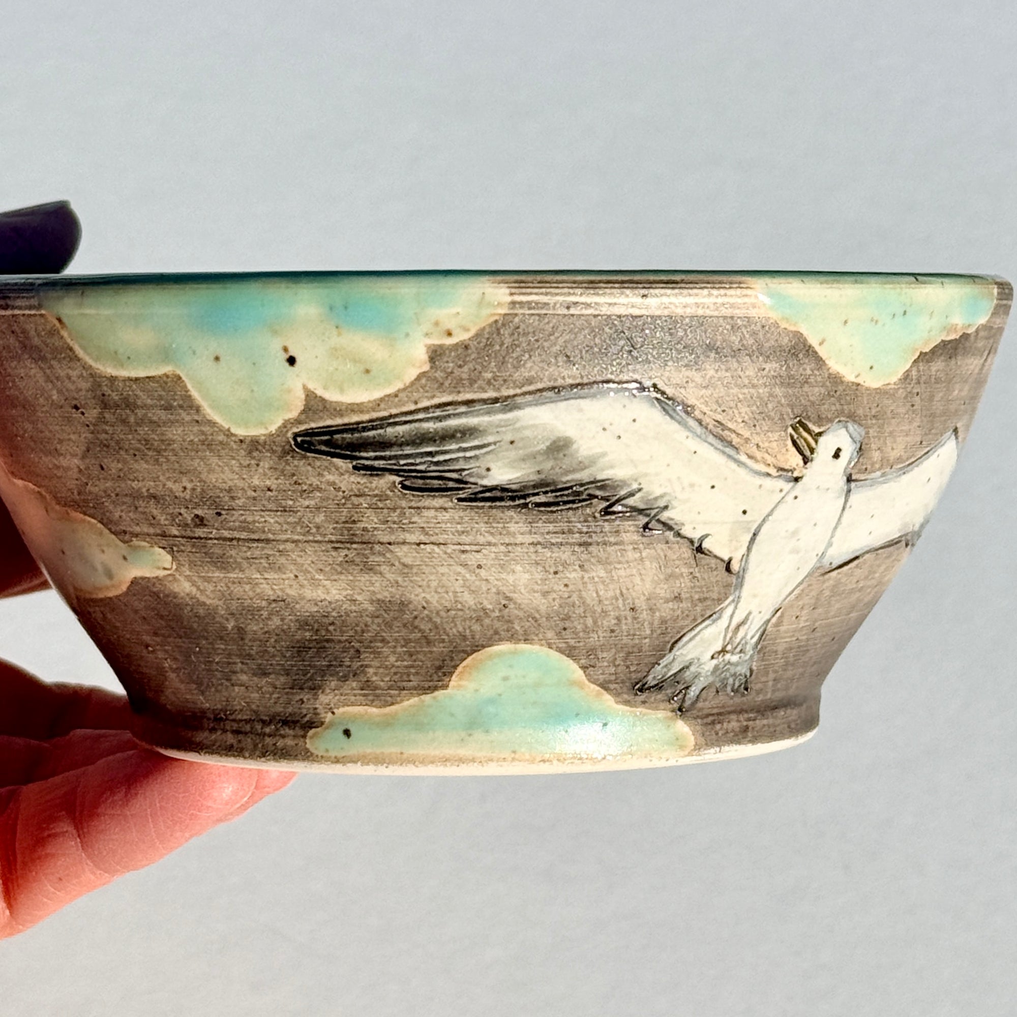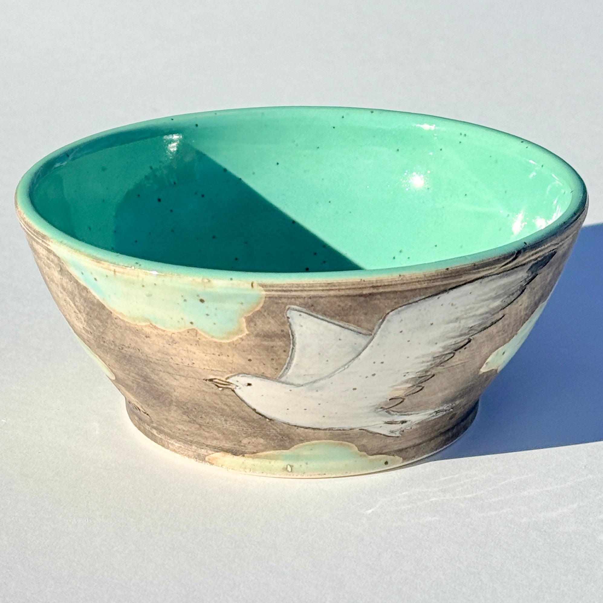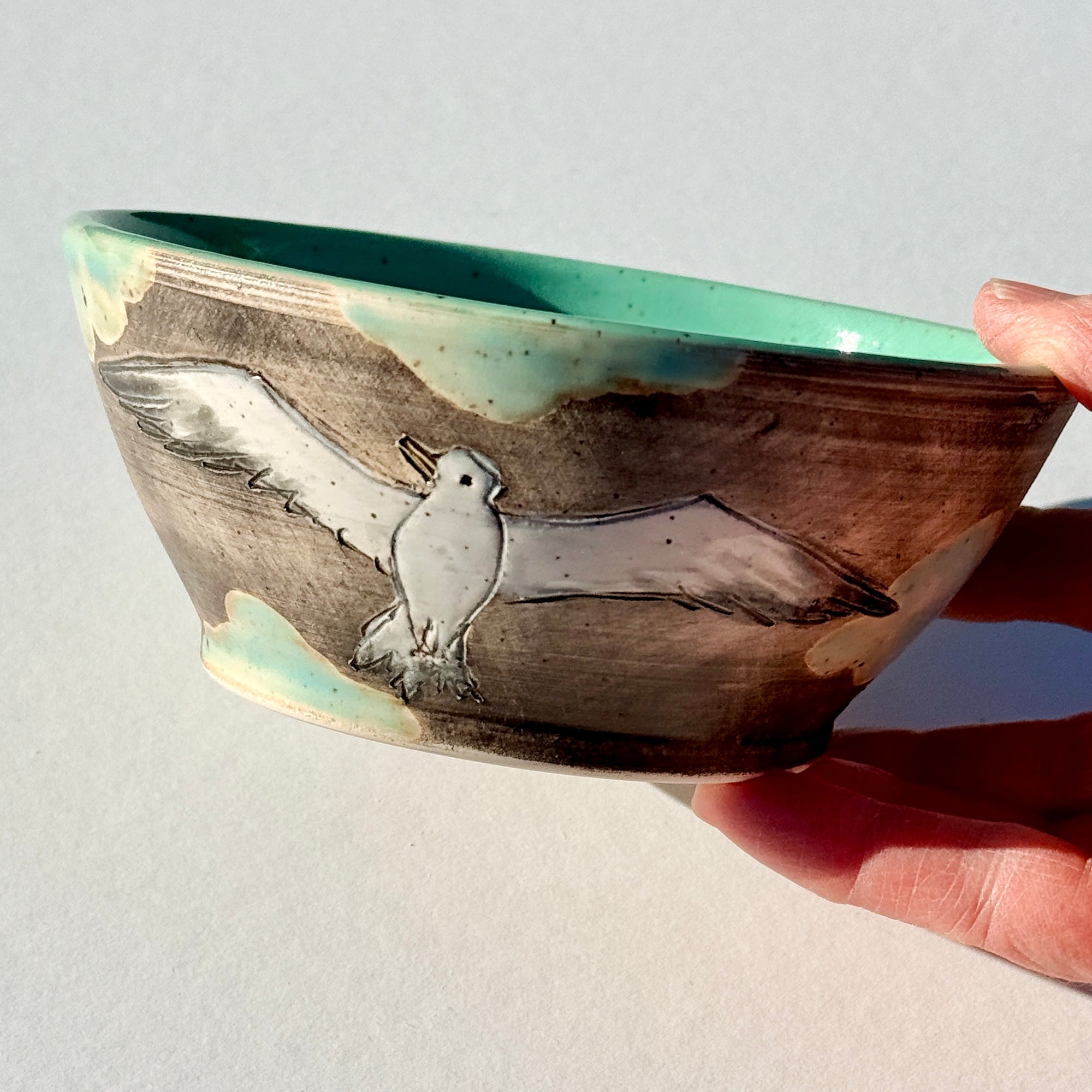 Bowl with seagulls and colourful circles on a black background with teal interior.