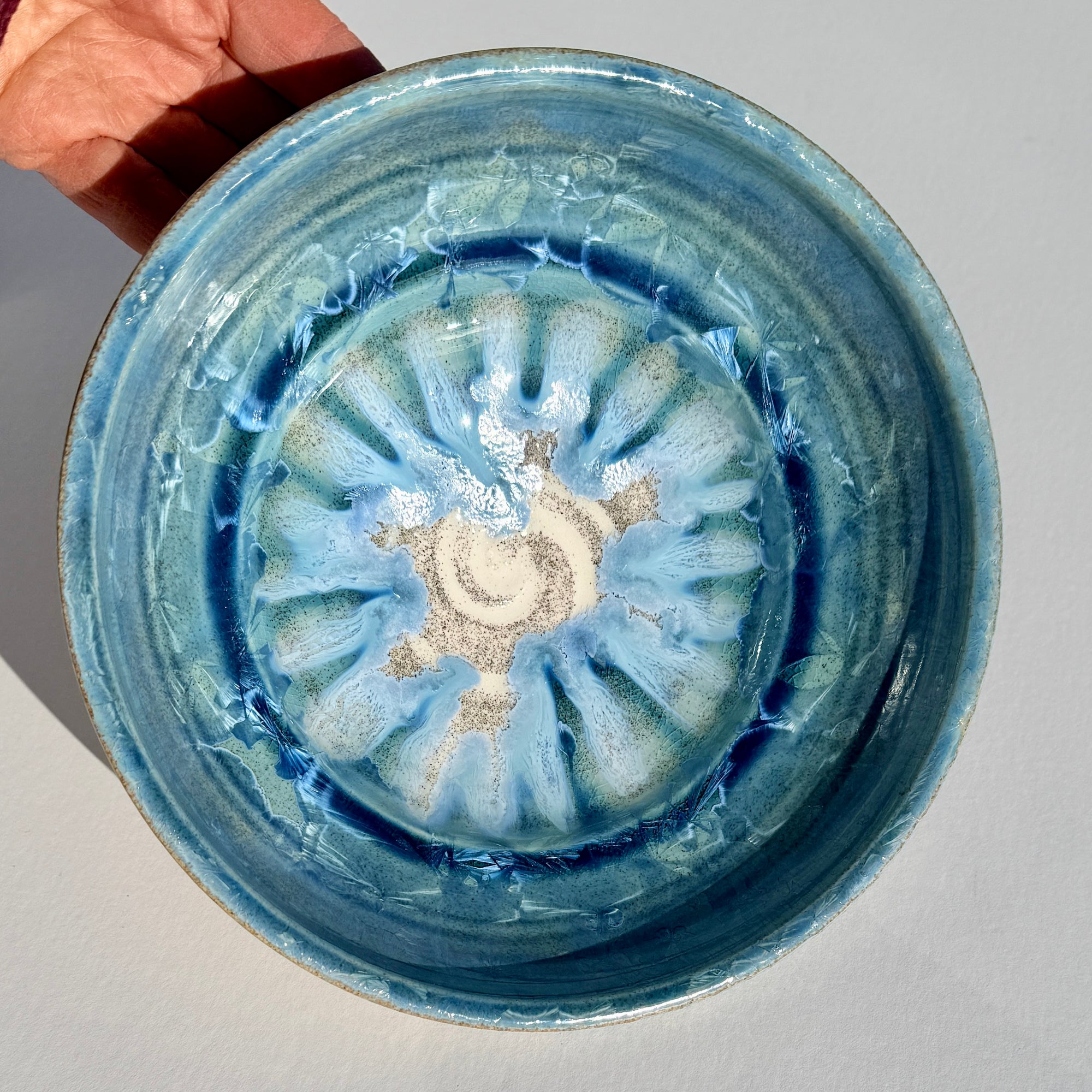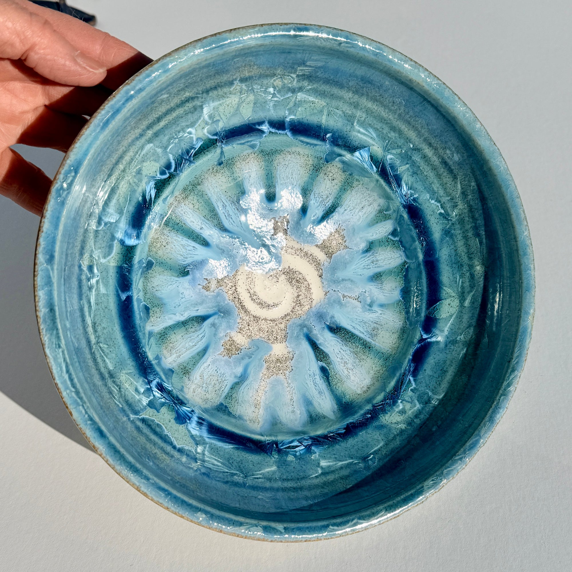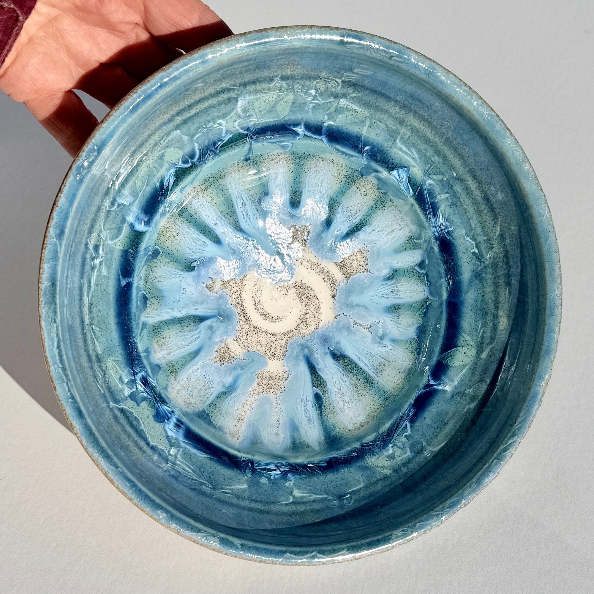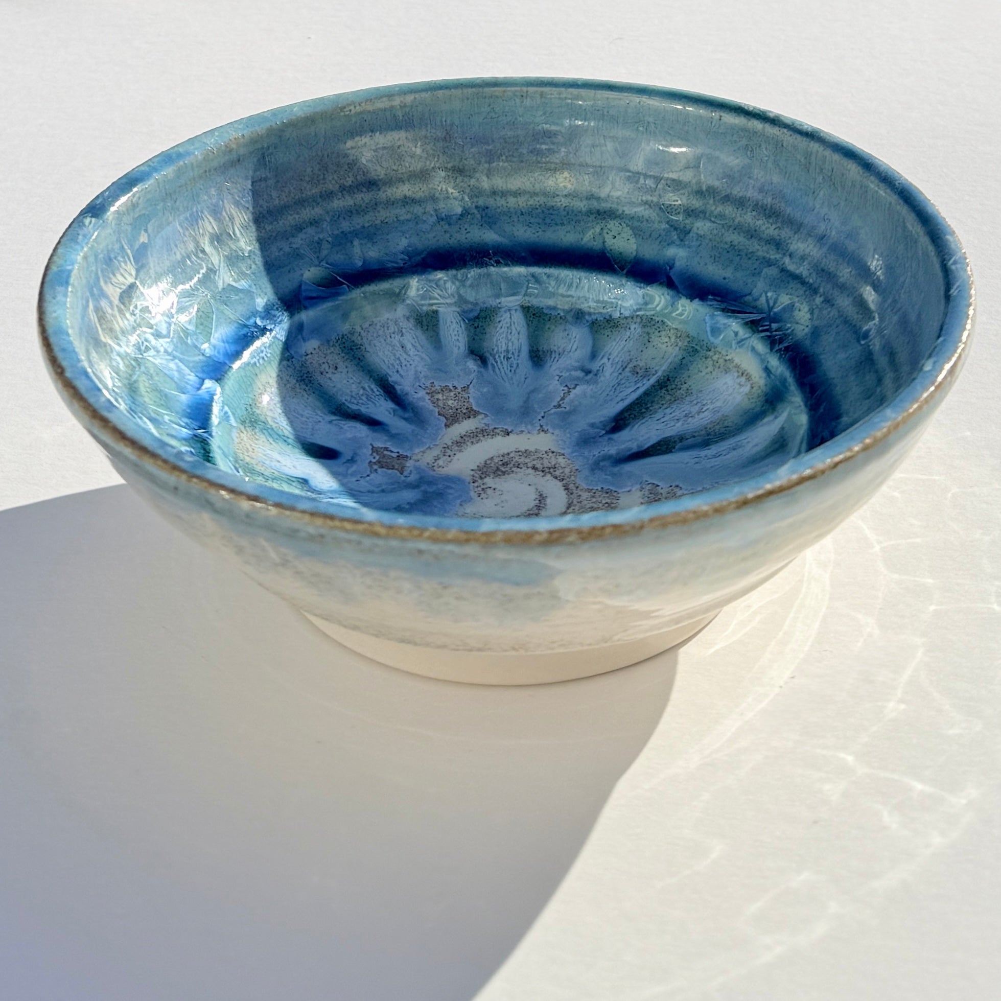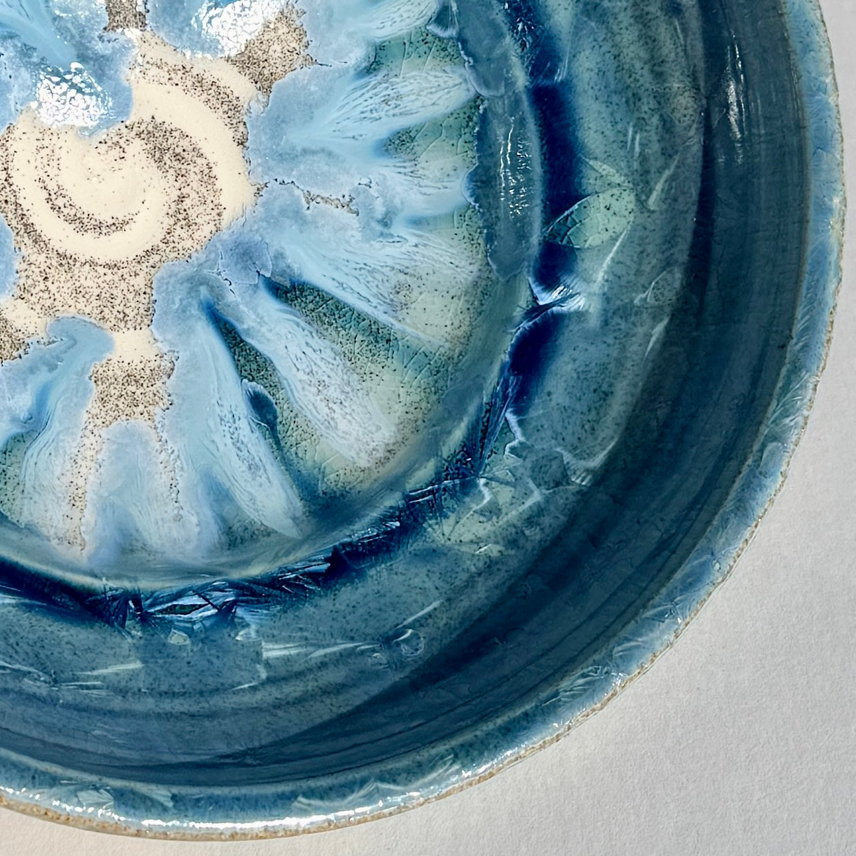 This bowl has beach sand — from the Salmon Cove Sands, Newfoundland — swirled into the porcelain clay. It has been glazed on the inside with a clear glaze to showcase the sand. The rim is glazed with a beautiful blue crystalline.