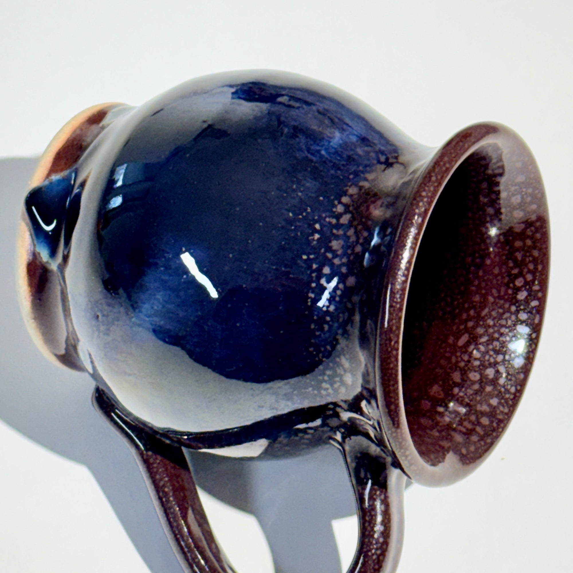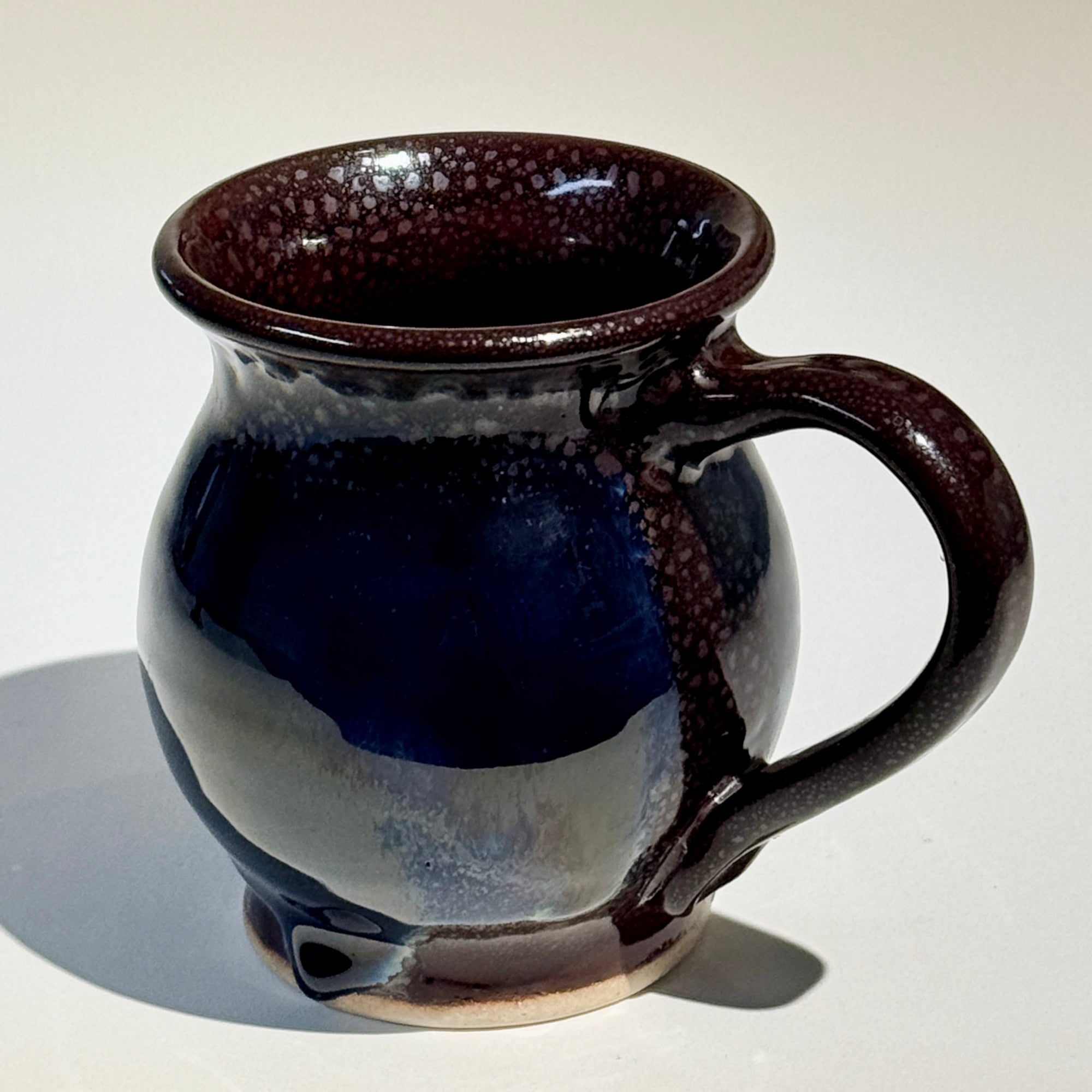 The darker rim is an “oil spot” glaze — which when fired quickly to a high heat, causes iron components to burst to the surface and leave glistening or sparkling highlights. Layered on this is the blue crystalline glaze, which creates a luminescent Northern Lights effect when it melds in the kiln with the darker glaze.