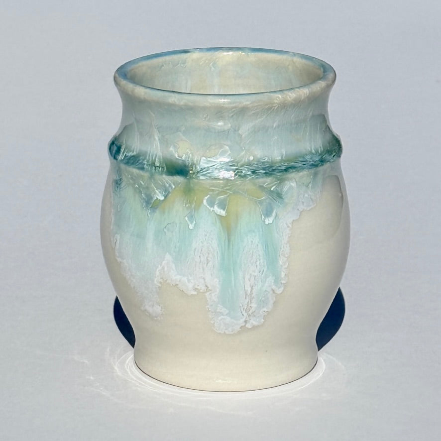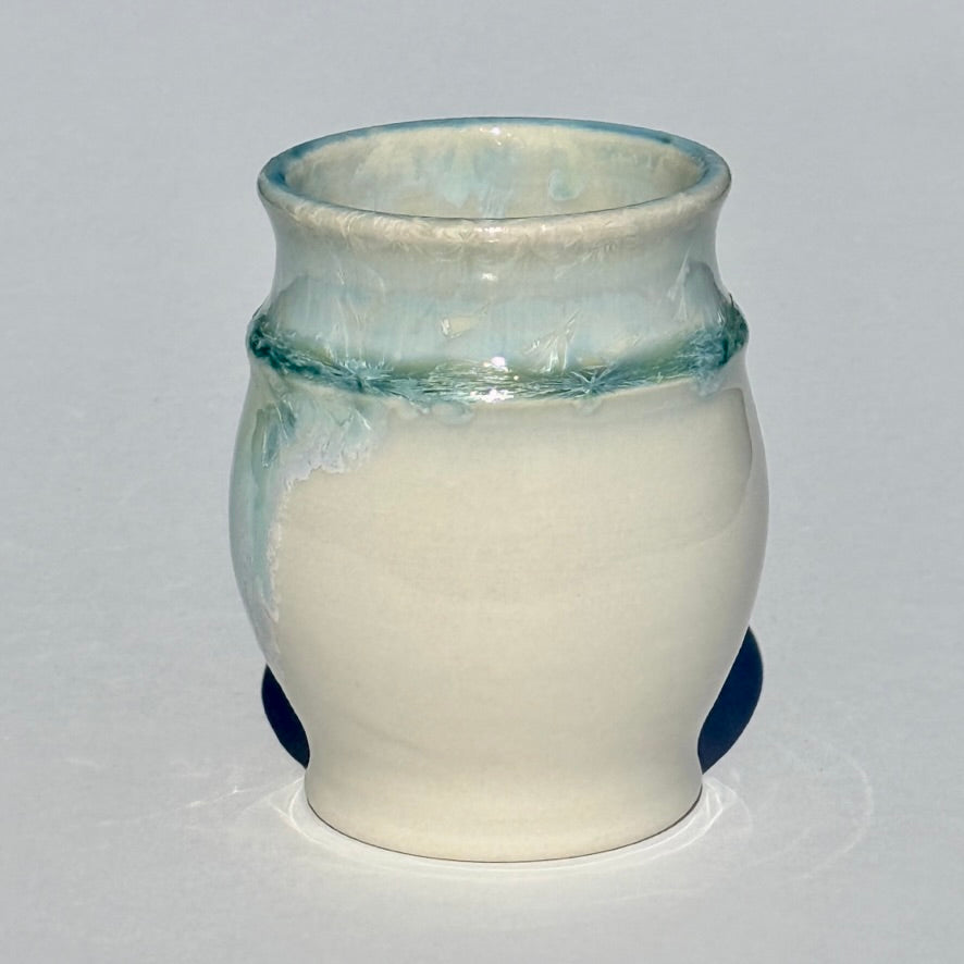 The turquoise on this wine cup is the result of a combination of white crystalline glaze layered over turquoise crystalline glaze.