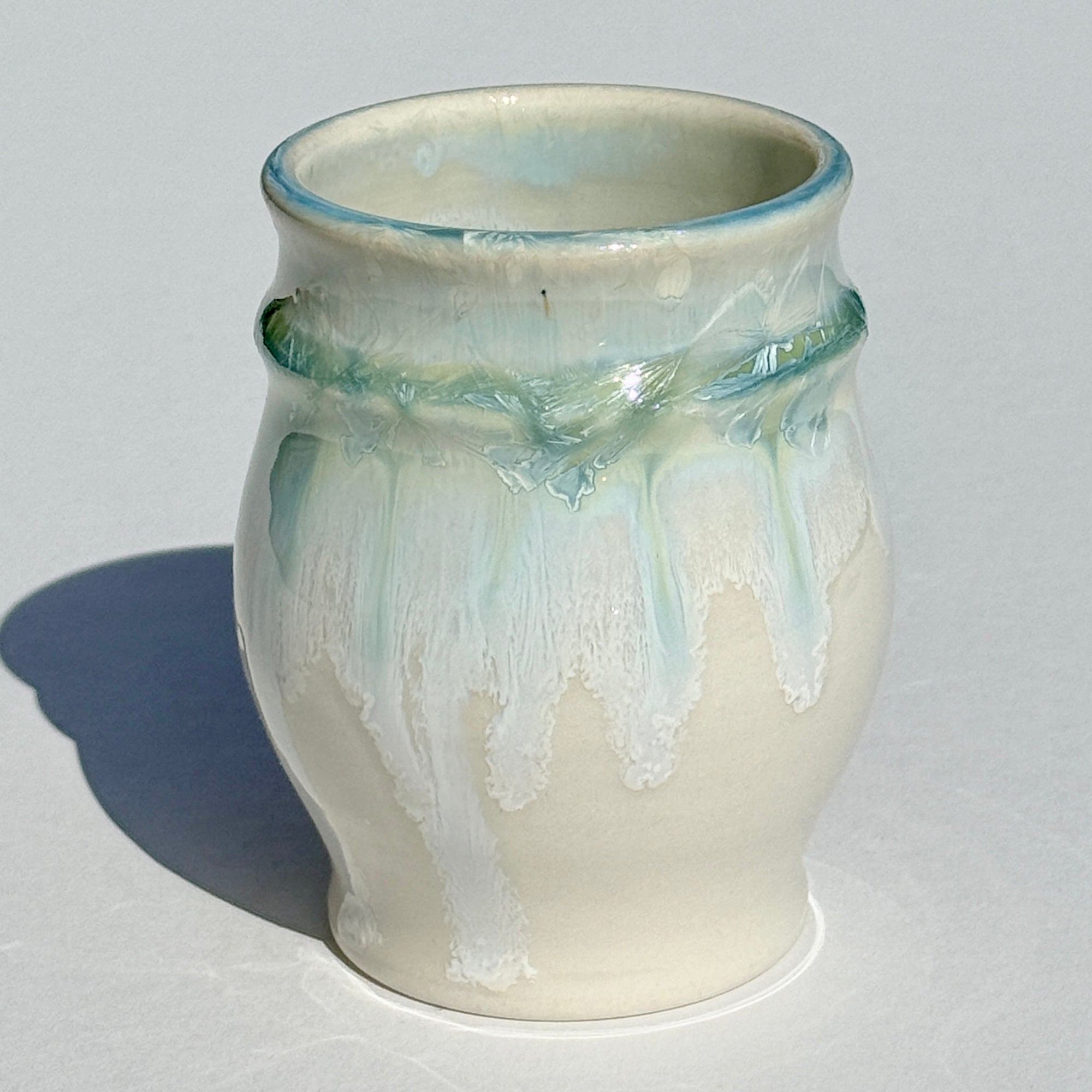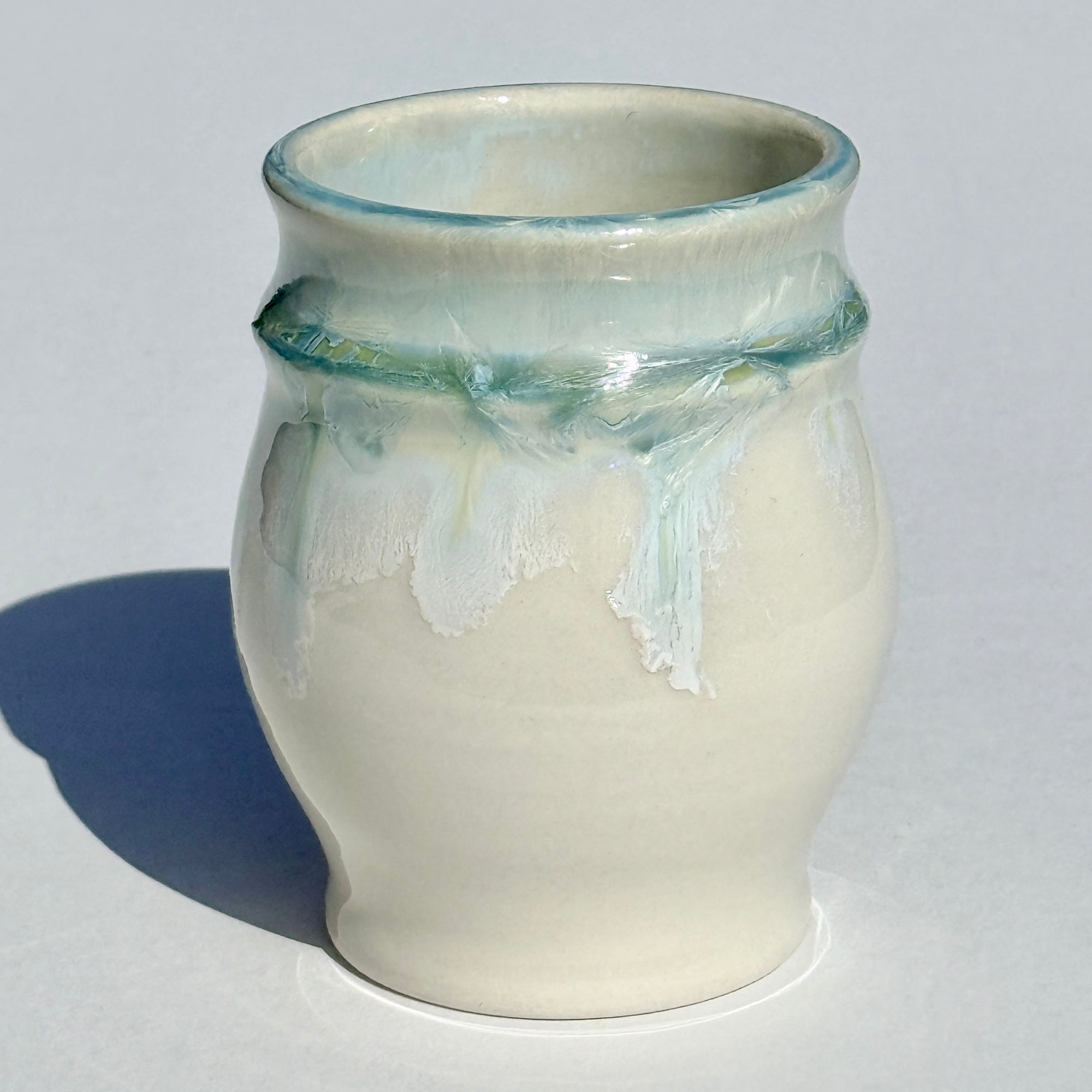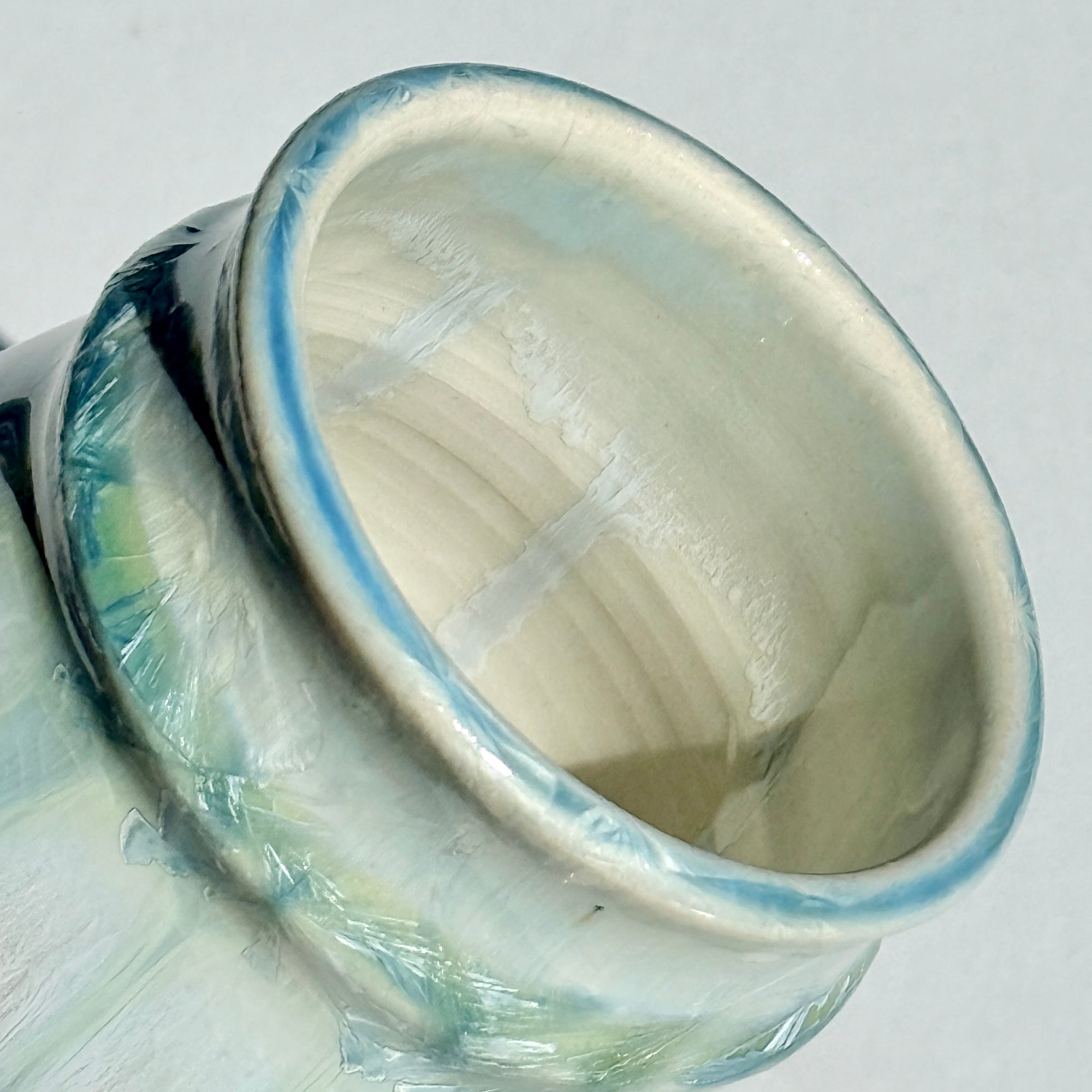 The turquoise on this wine cup is the result of a combination of white crystalline glaze layered over turquoise crystalline glaze.