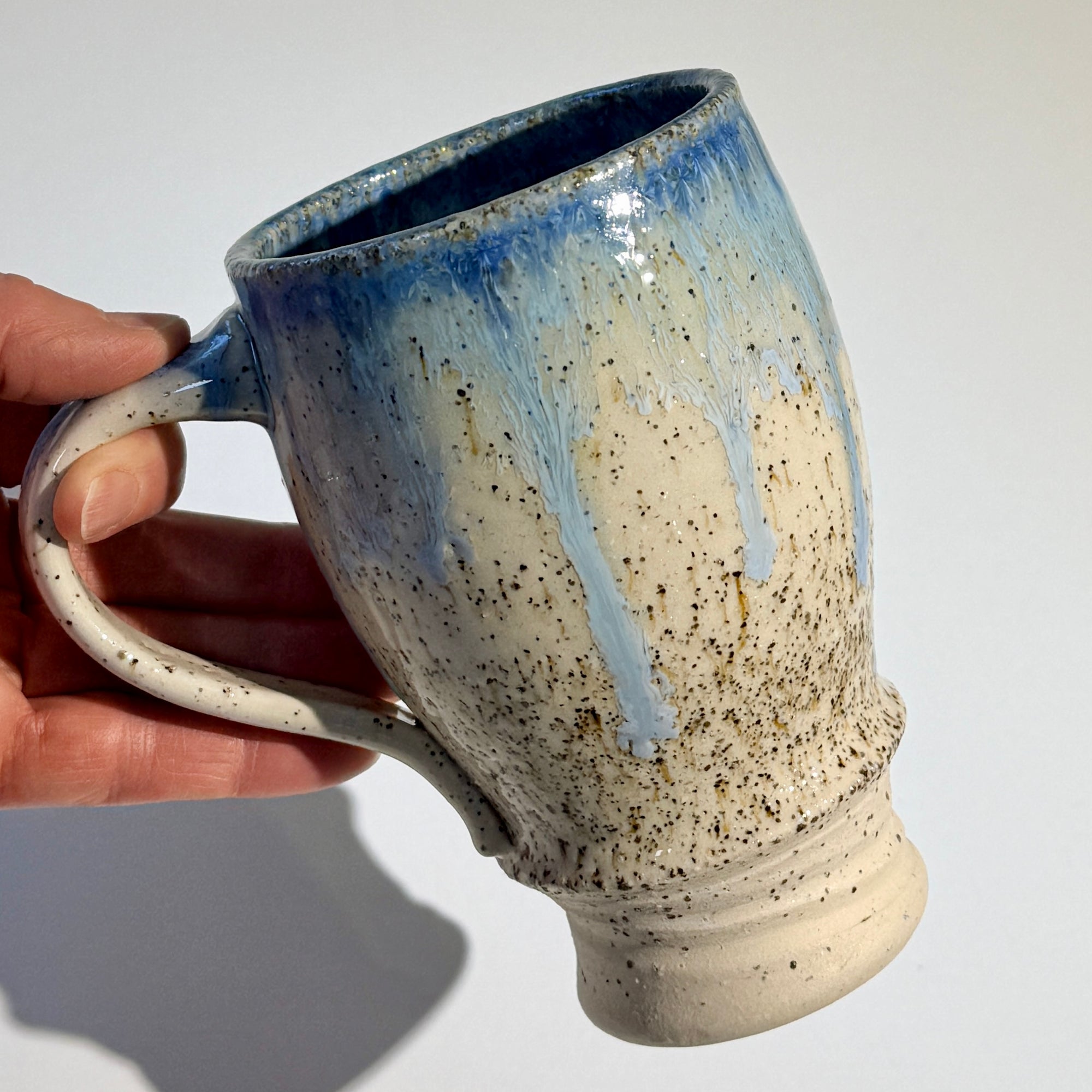 This mug has had beach sand swirled through the clay as the piece was thrown on the wheel.