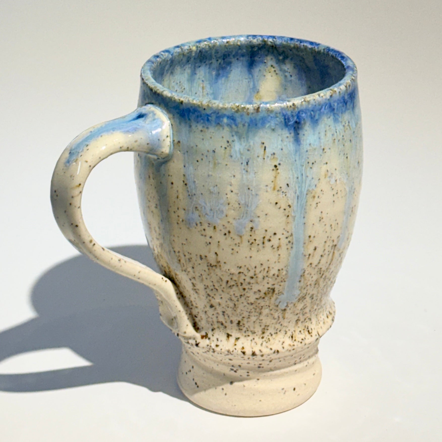 Alexis' signature crystalline glaze is running on the rim of this mug. The inside and outside walls are covered in clear glaze to emphasize the beach sand.