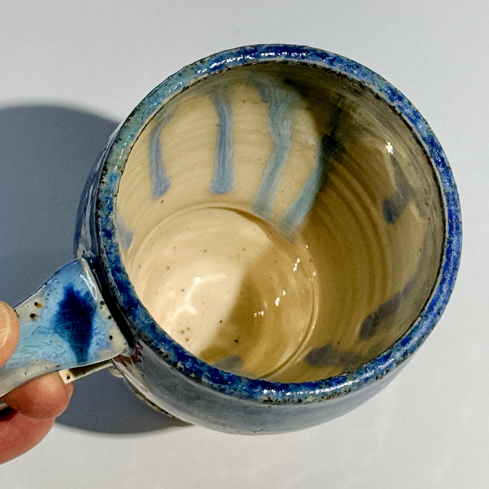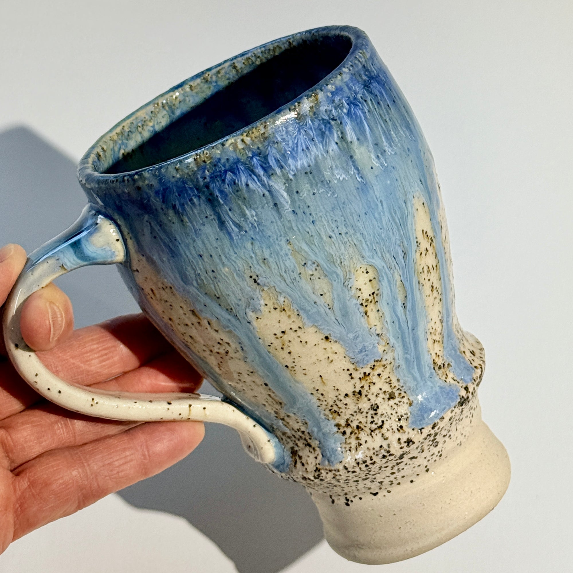 Alexis' signature crystalline glaze is running on the rim of this mug. The inside and outside walls are covered in clear glaze to emphasize the beach sand.