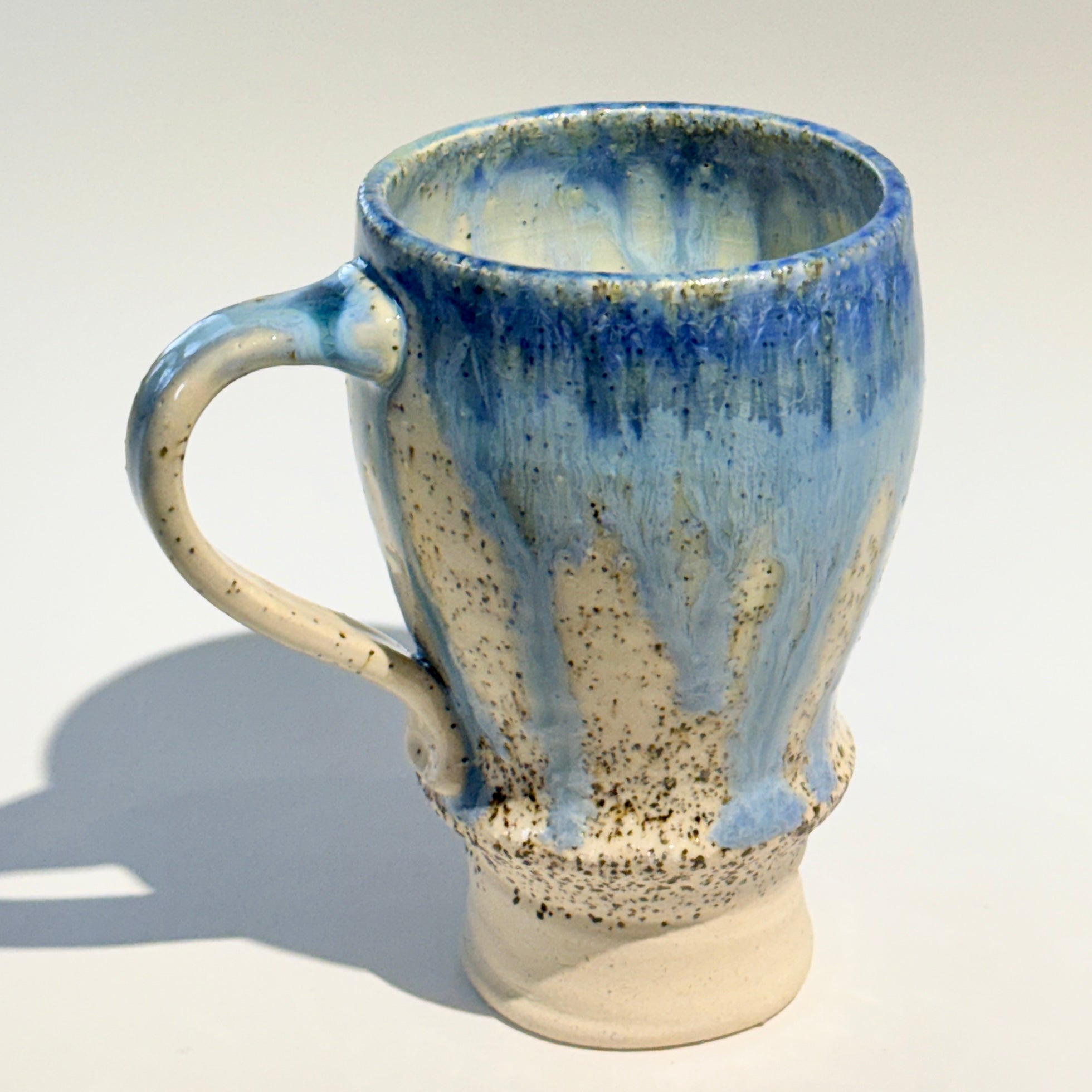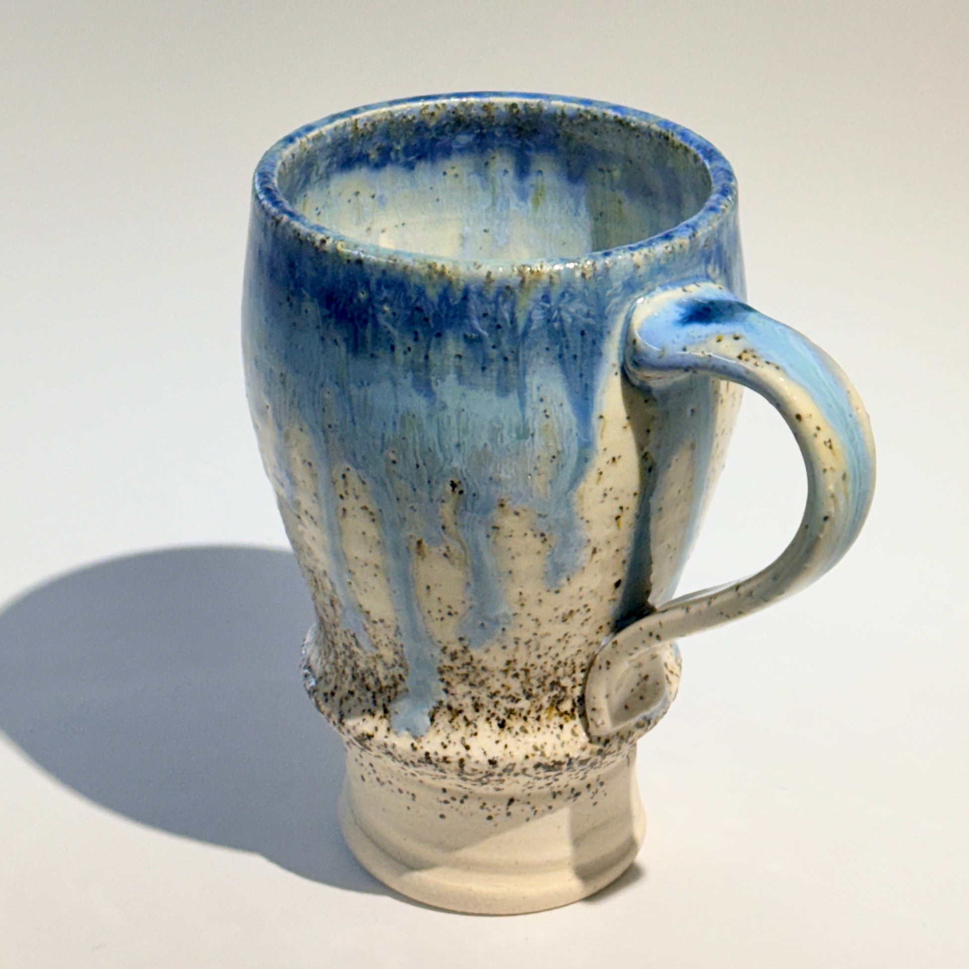 This mug has had beach sand swirled through the clay as the piece was thrown on the wheel.