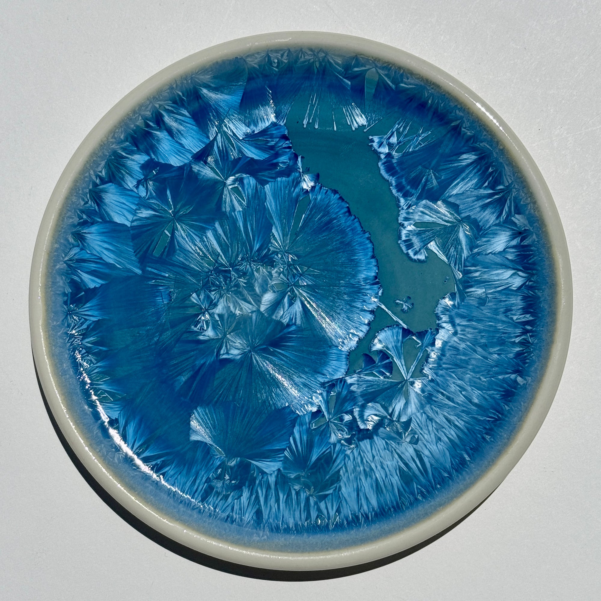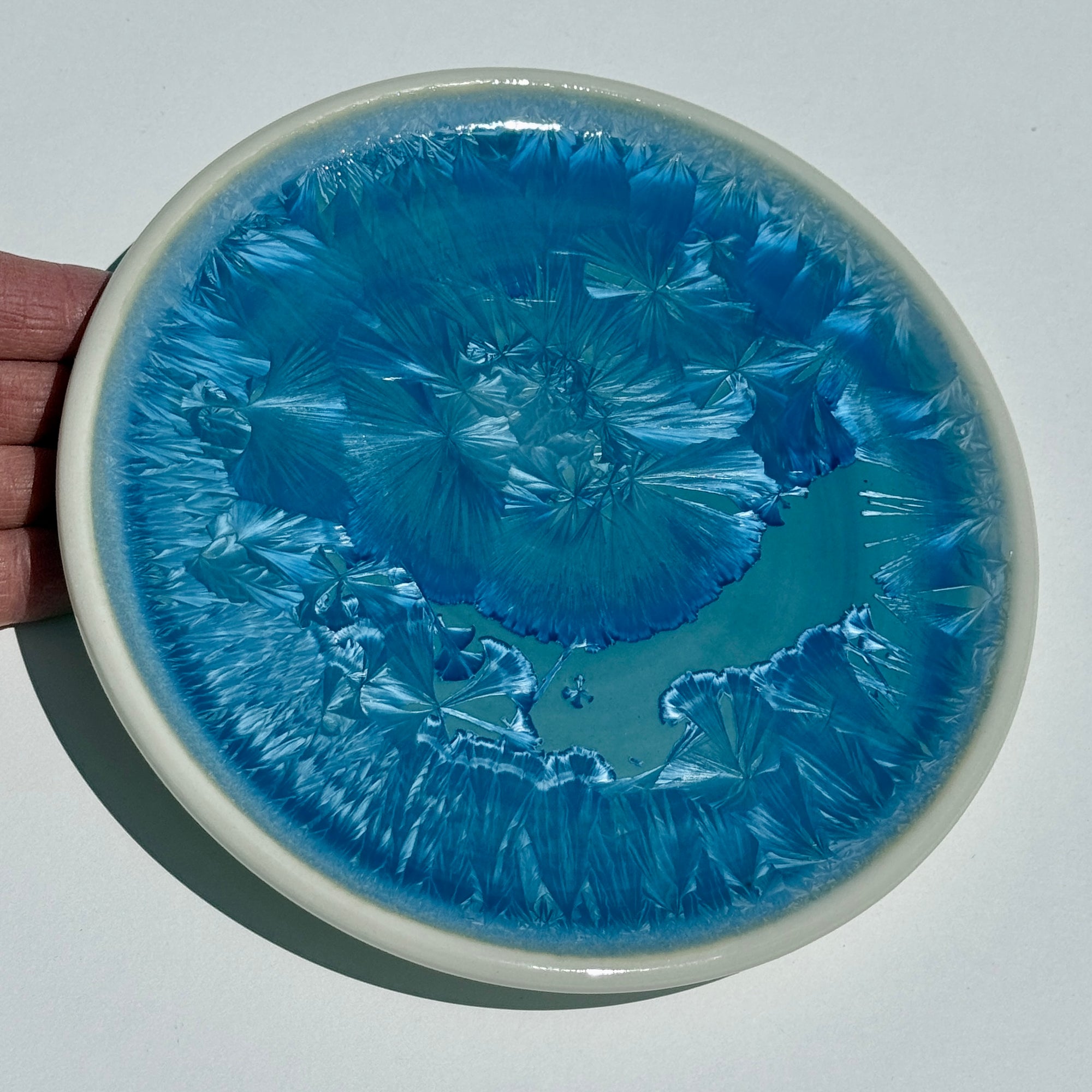 This turquoise crystalline plate measures 16-17 centimetres in diameter and is ideal as a bread and butter (side) plate but also functions as an appetizer plate.
