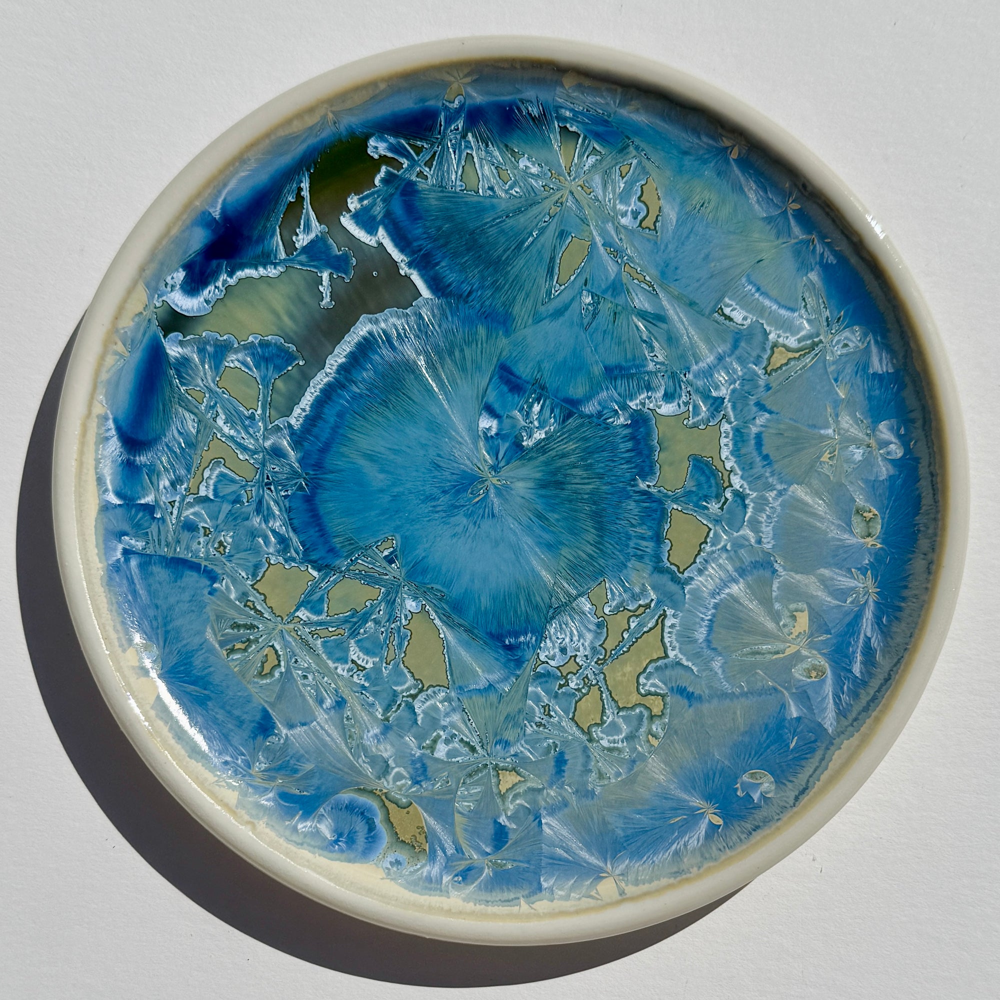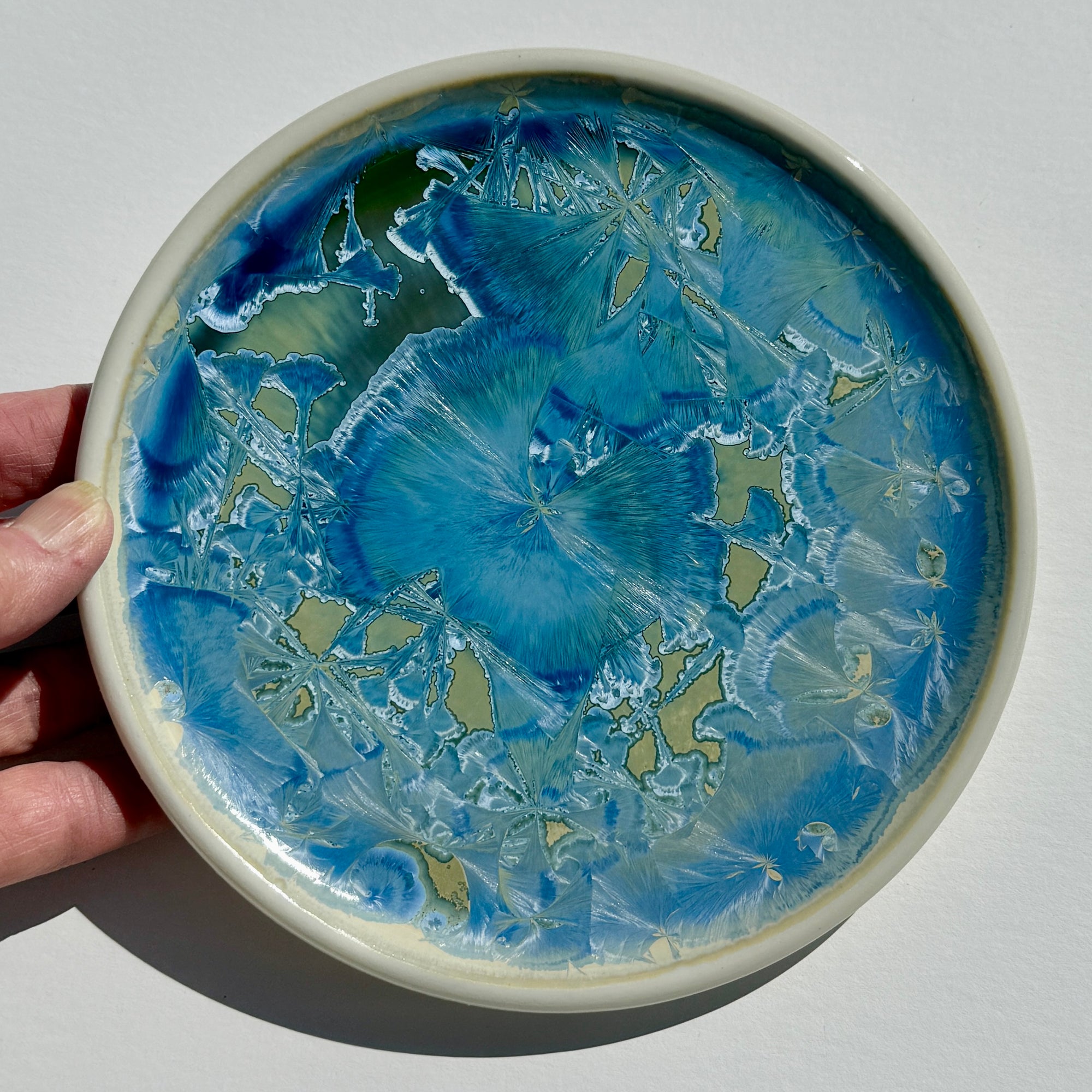 This turquoise crystalline plate measures 16-17 centimetres in diameter and is ideal as a bread and butter (side) plate but also functions as an appetizer plate.