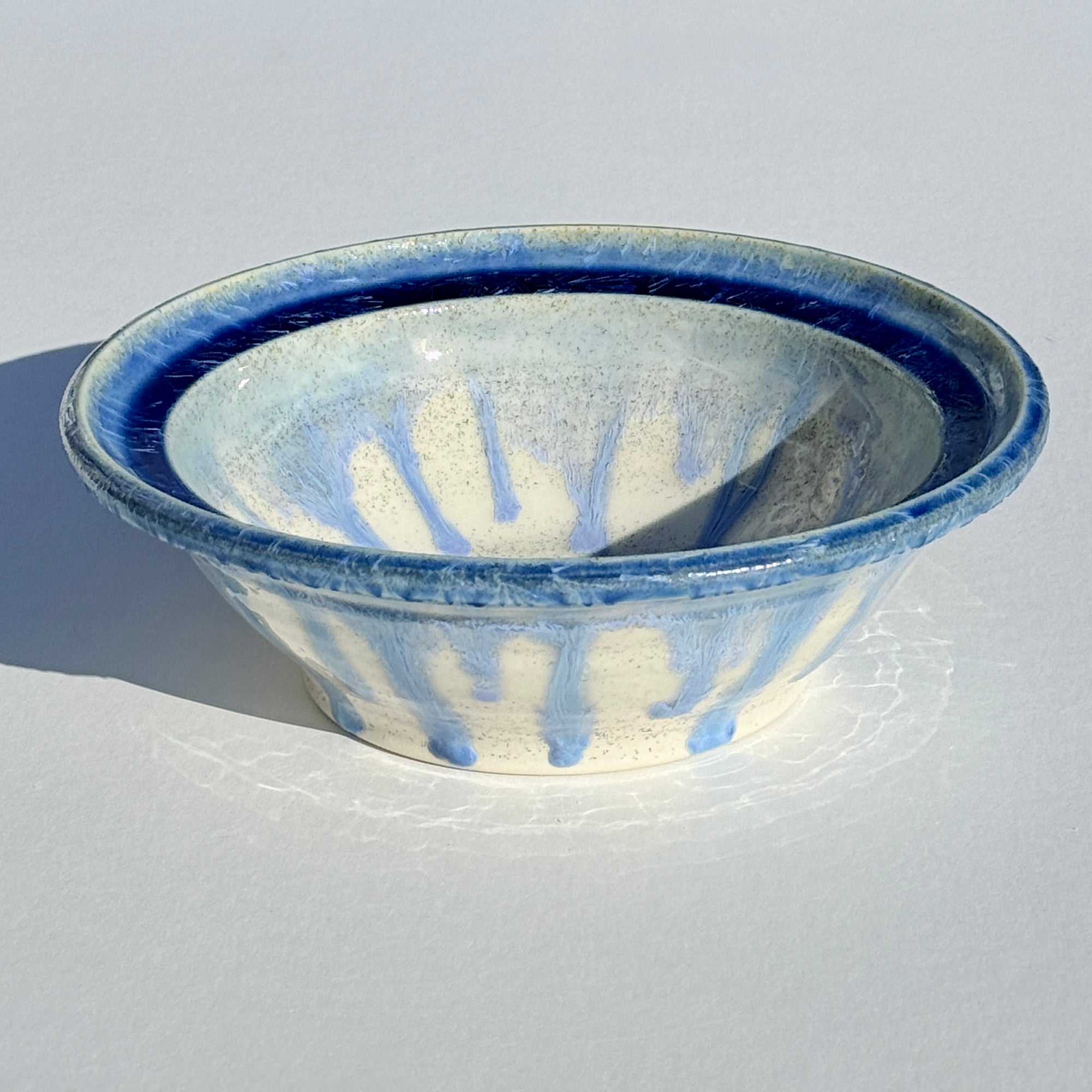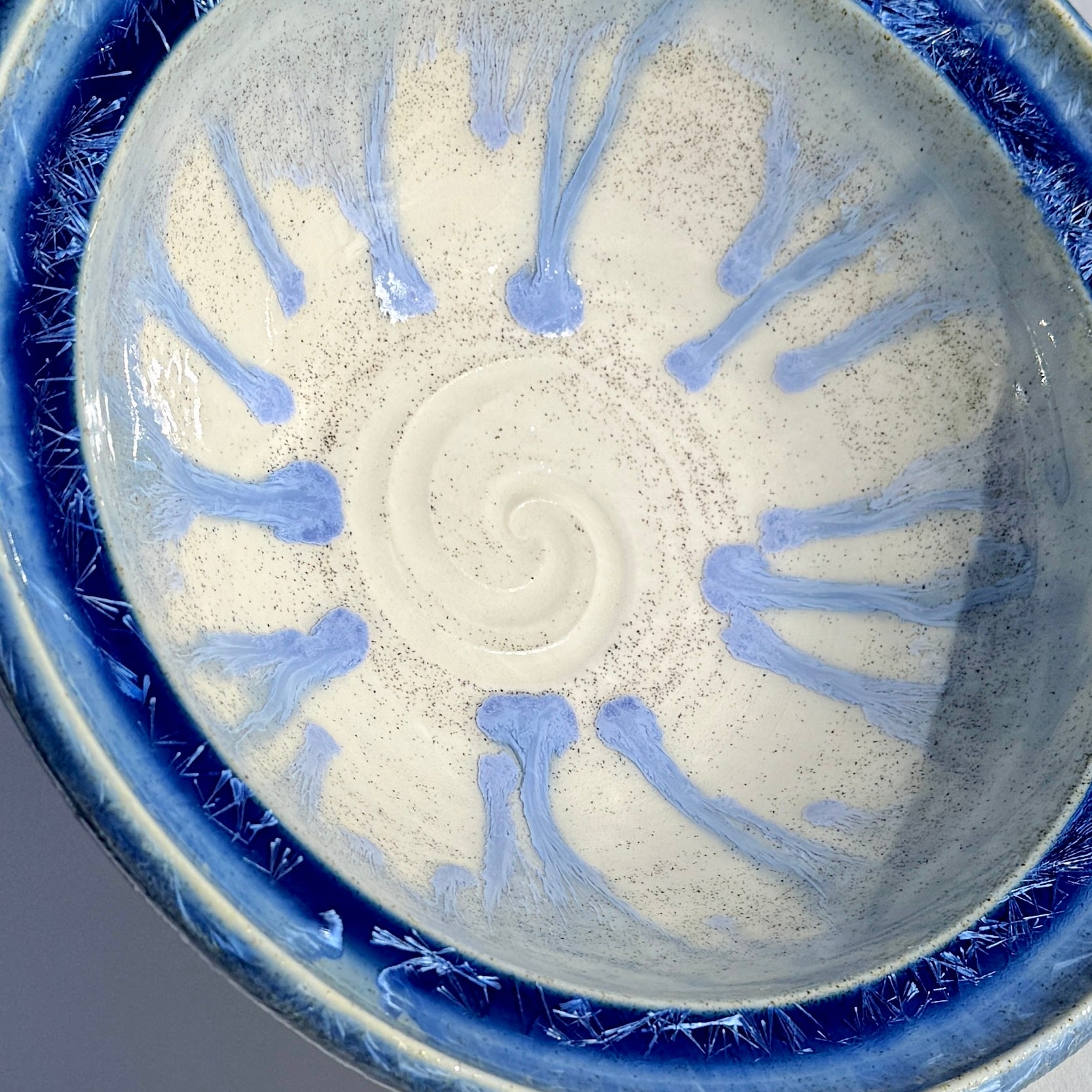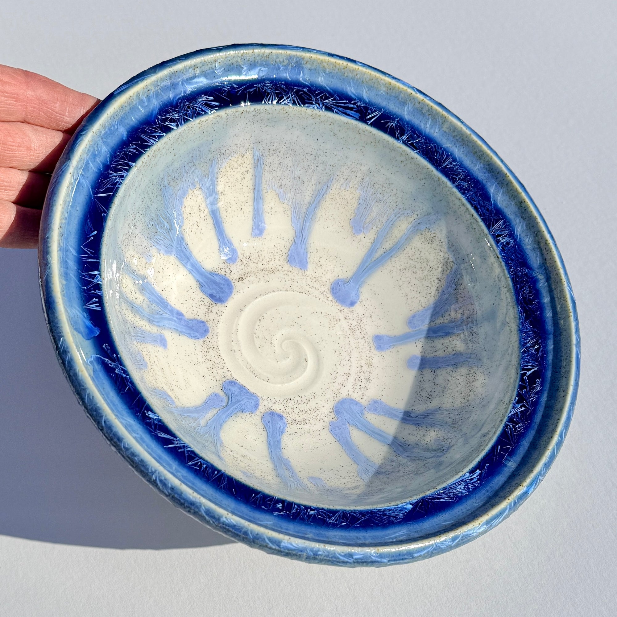 This bowl has beach sand — from the Salmon Cove Sands, Newfoundland — swirled into the porcelain clay. It has been glazed on the inside with a clear glaze to showcase the sand. The rim is glazed with a beautiful blue crystalline.