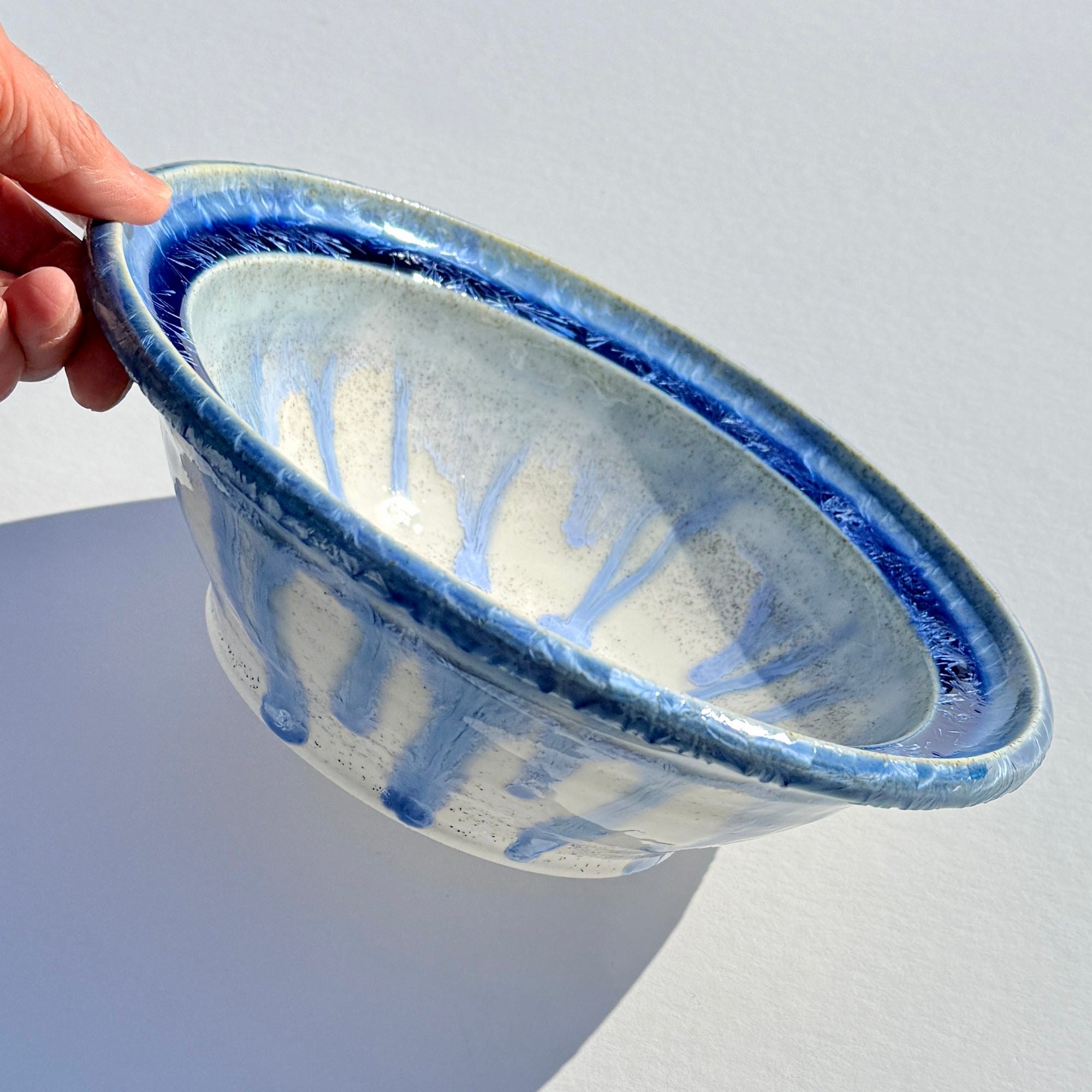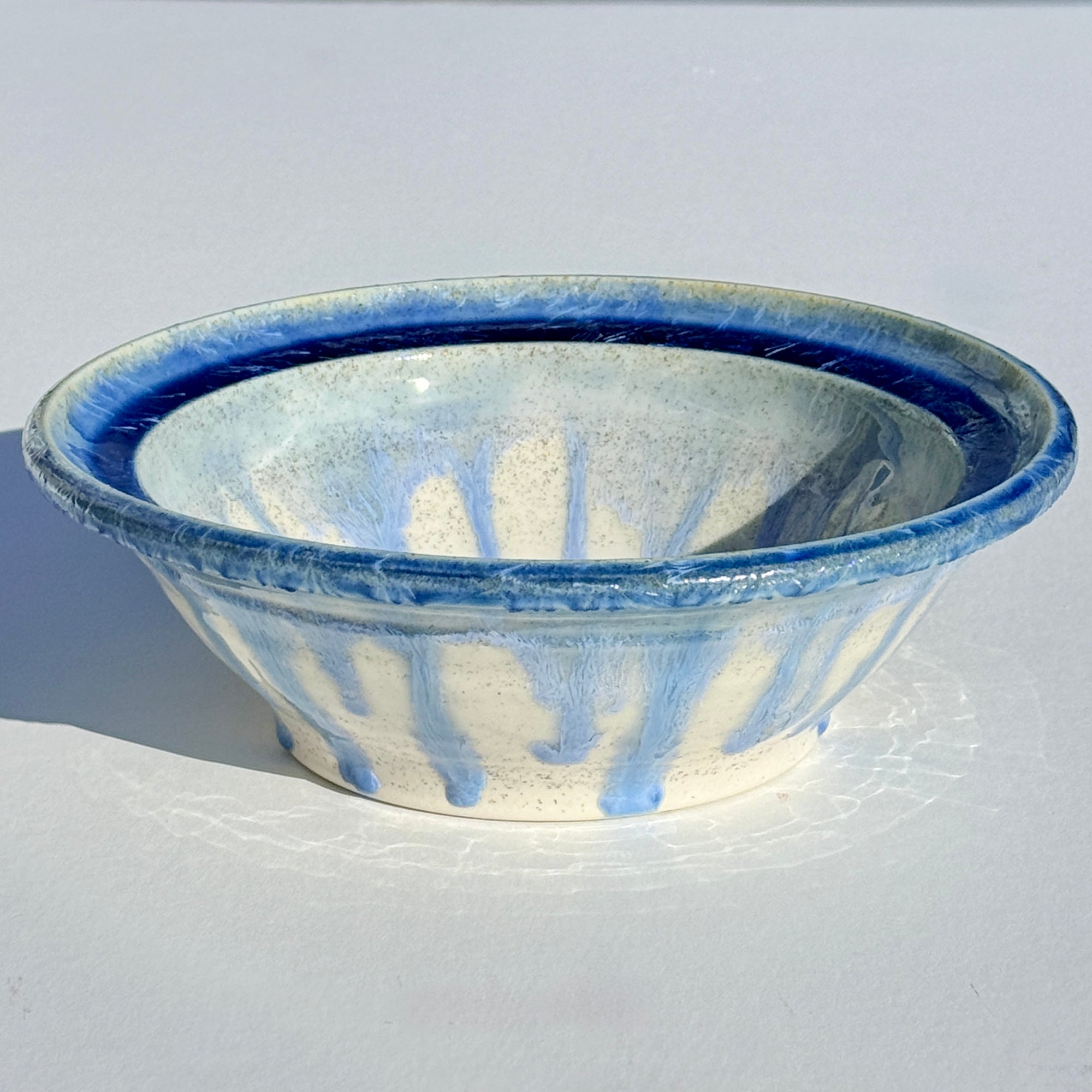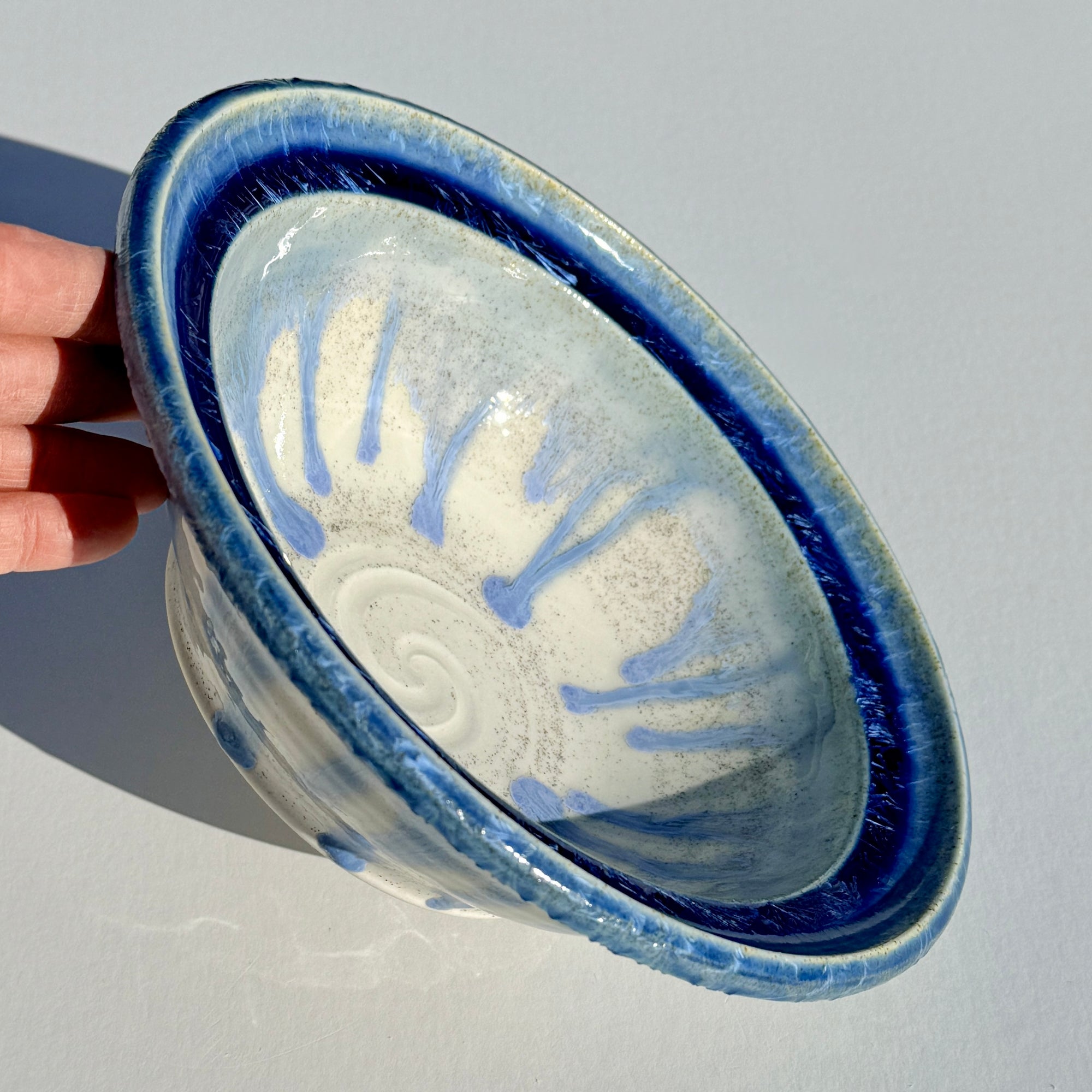 This bowl has beach sand — from the Salmon Cove Sands, Newfoundland — swirled into the porcelain clay. It has been glazed on the inside with a clear glaze to showcase the sand. The rim is glazed with a beautiful blue crystalline.