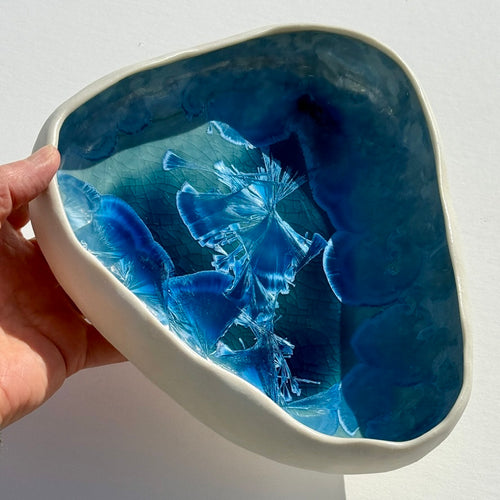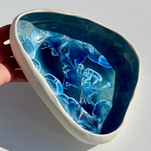 Pinch Pots are one of the simplest pottery forms.  Alexis combines one of the simplest forms with one of the most complex glazes in creating this design. Porcelain clay is "pinched" into a bowl shape and then laid to rest on a beach rock while it dries.  The crystalline glaze pools in the bottom of the bowl to look like a puddle of water and ice.