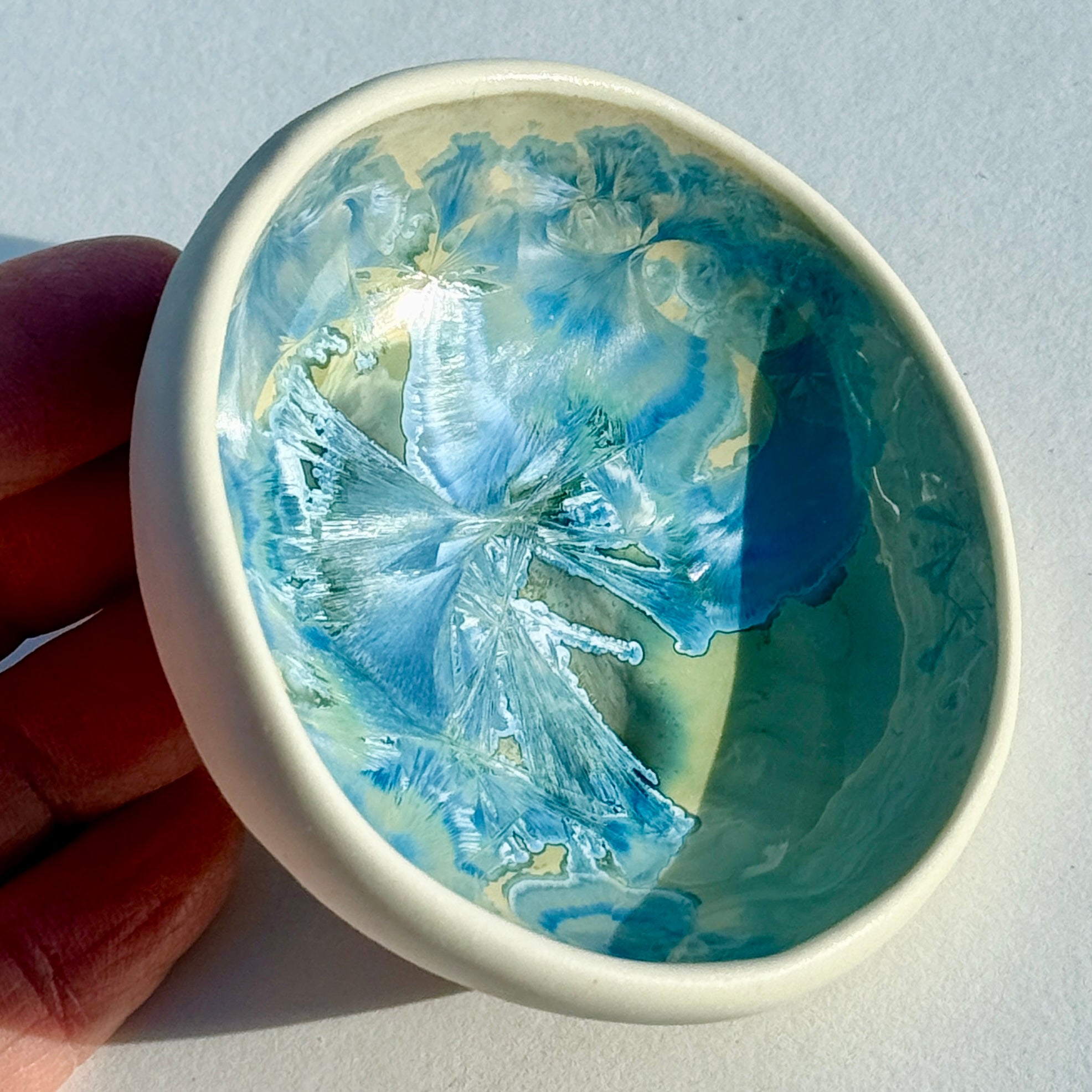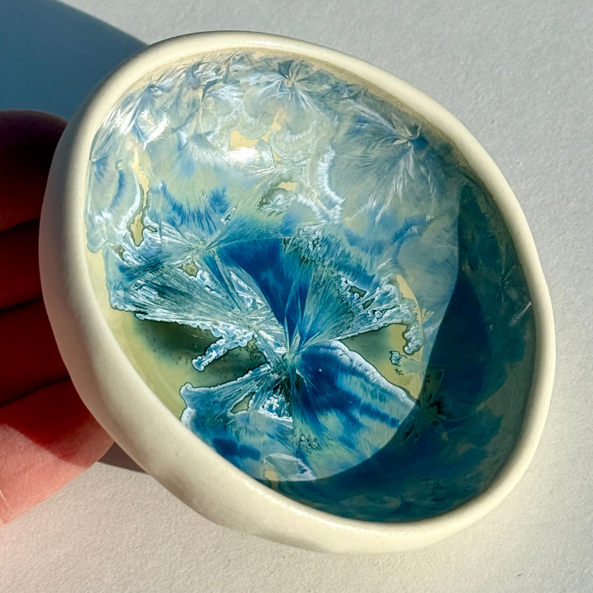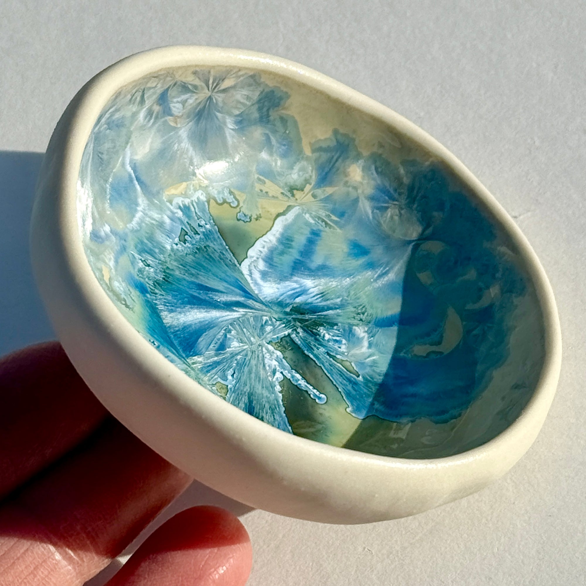 Pinch Pots are one of the simplest pottery forms.  Alexis combines one of the simplest forms with one of the most complex glazes in creating this design. Porcelain clay is "pinched" into a bowl shape and then laid to rest on a beach rock while it dries.  The crystalline glaze pools in the bottom of the bowl to look like a puddle of water and ice.