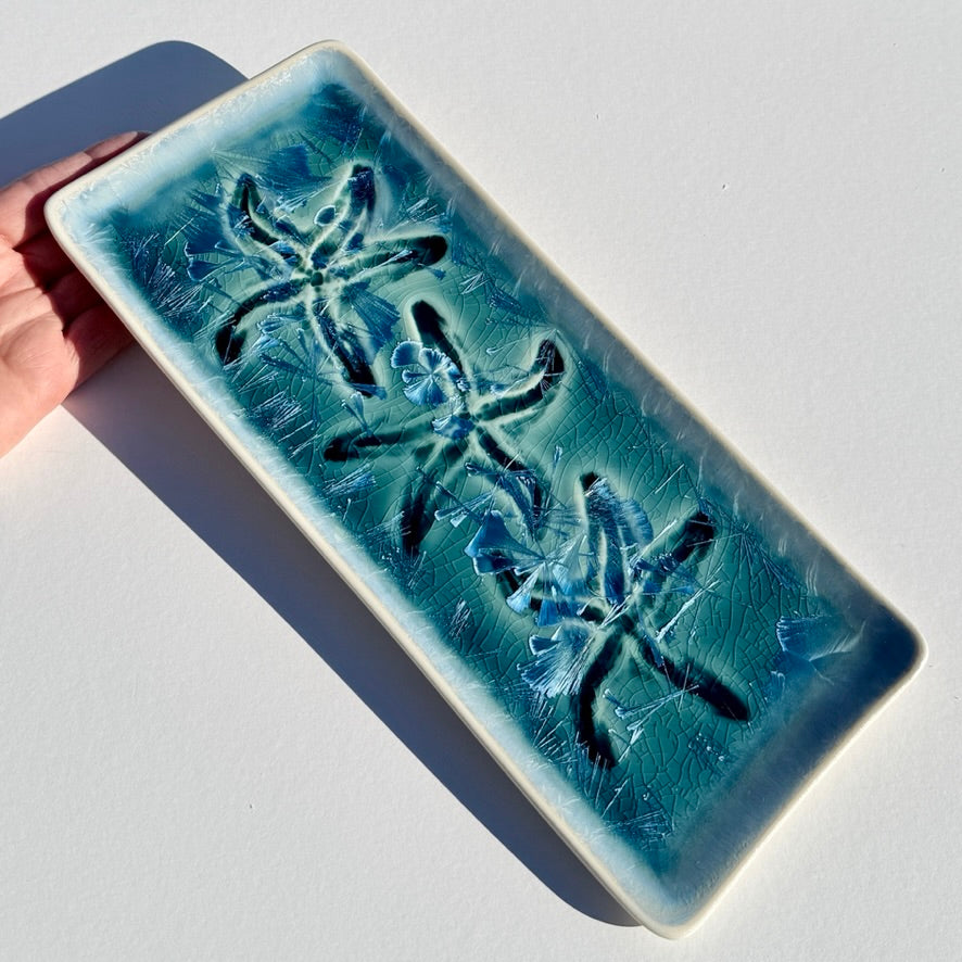 Turquoise crystalline rectangular platter with starfish impressed in the porcelain clay.