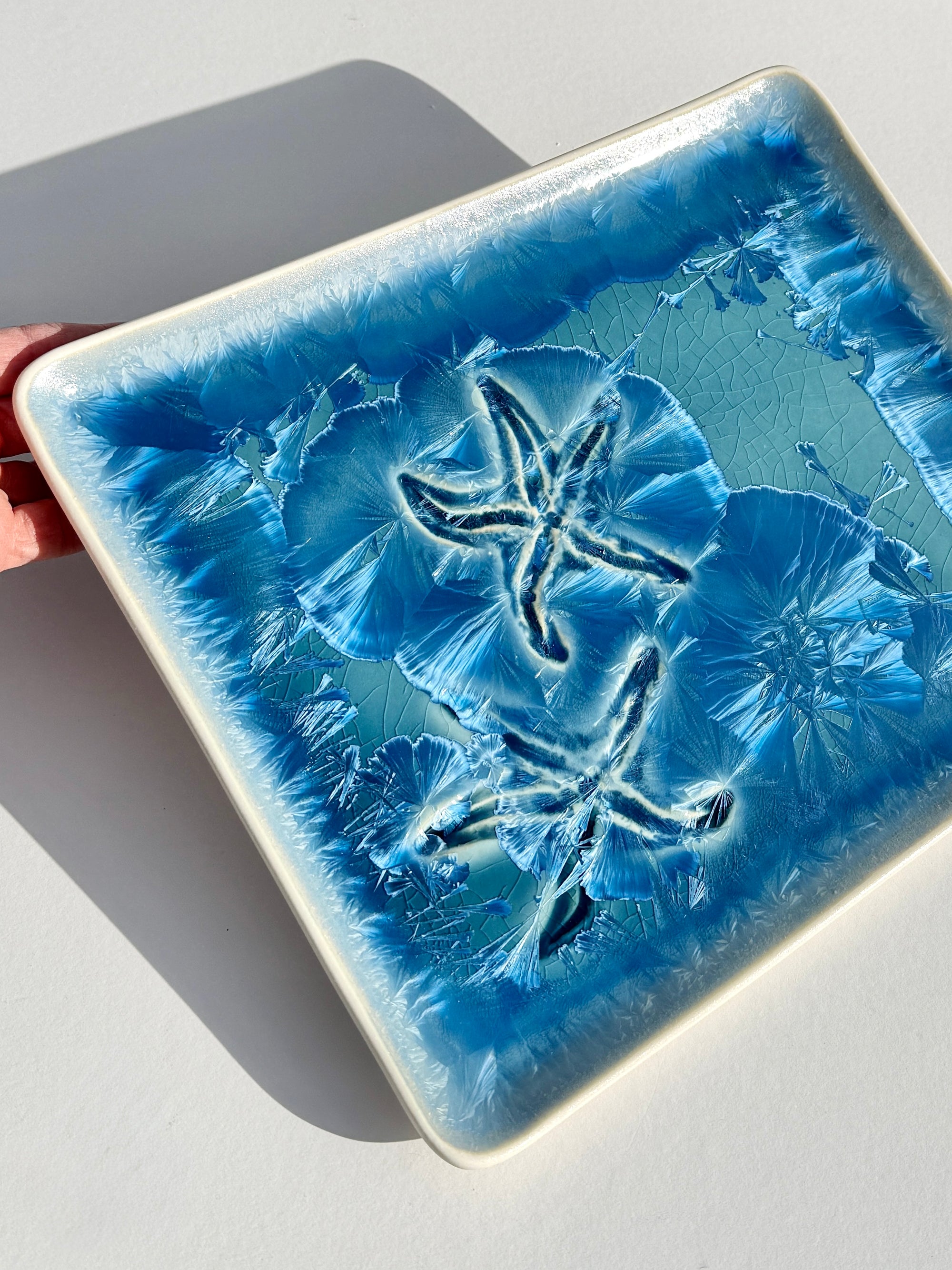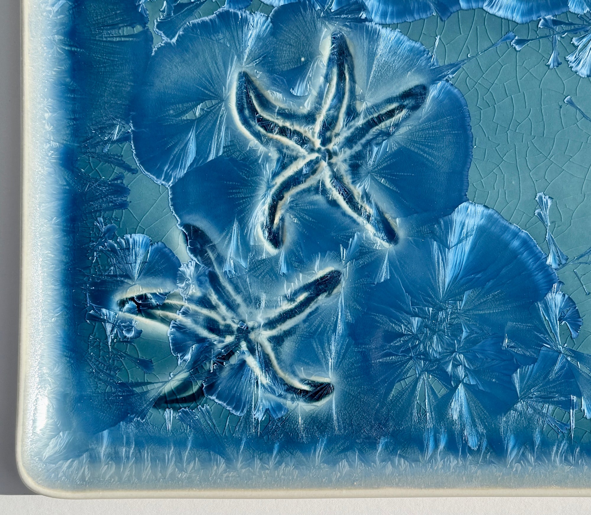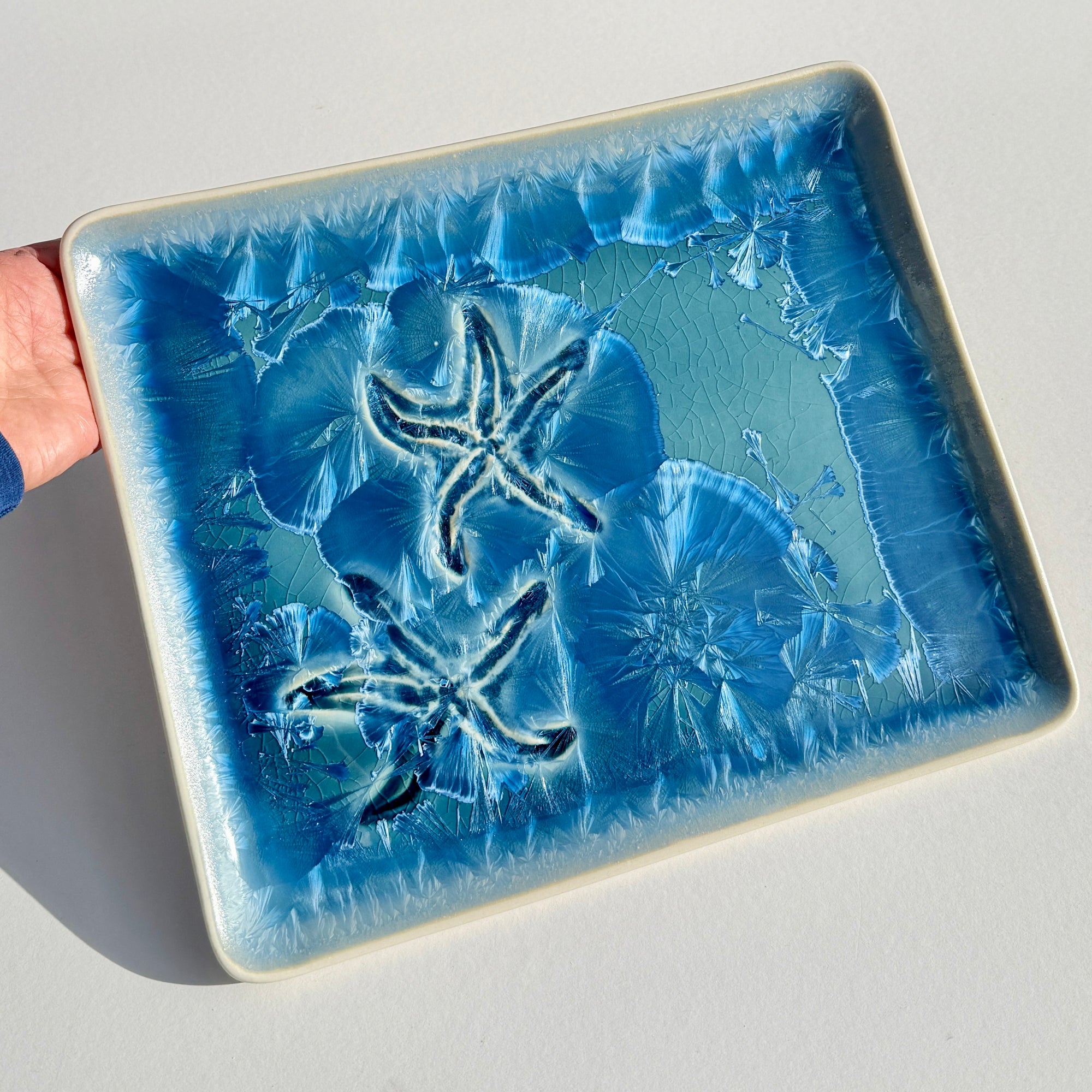 Turquoise crystalline rectangular platter with starfish impressed in the porcelain clay.