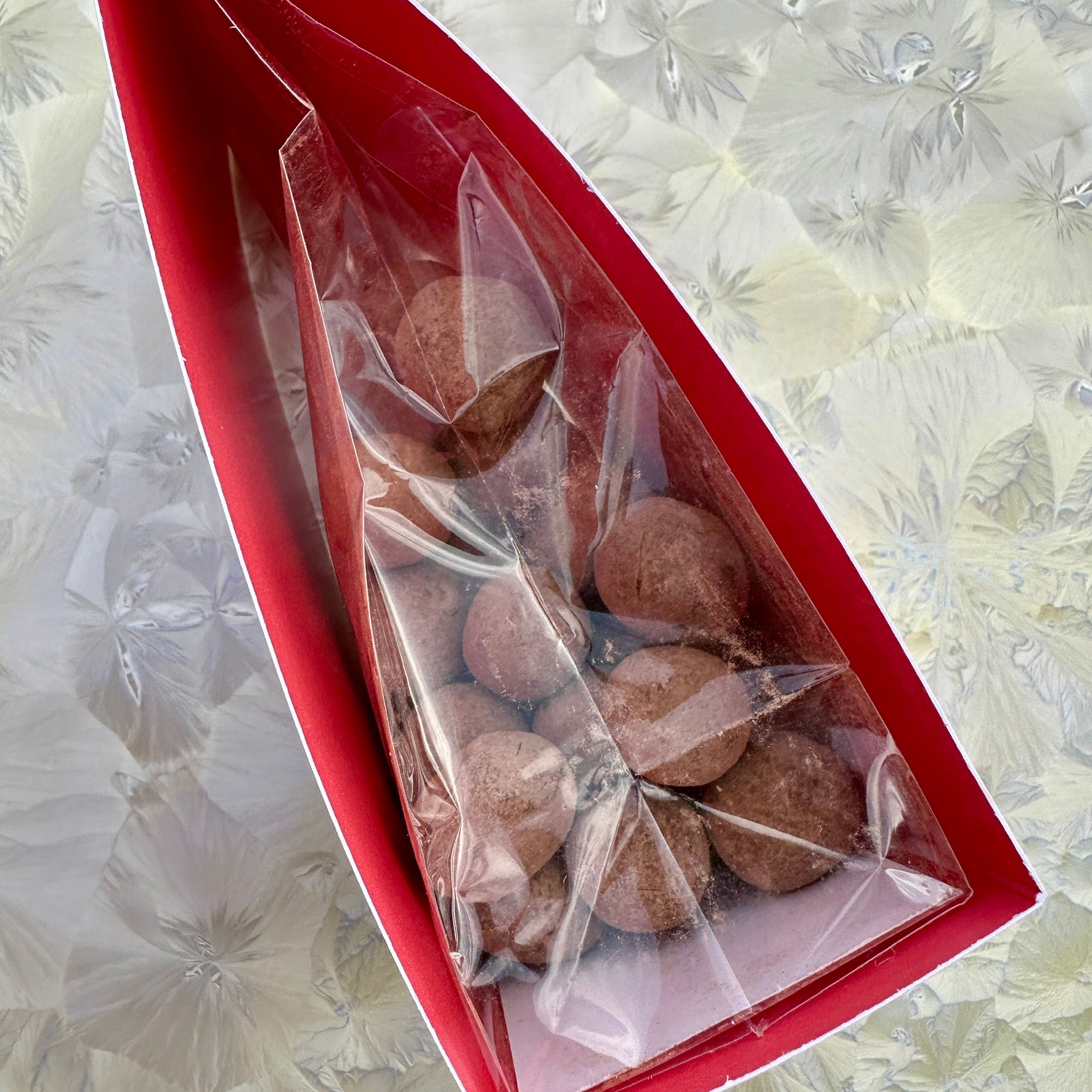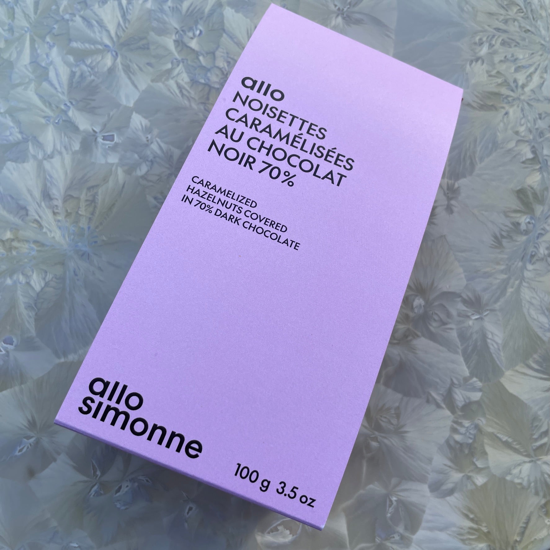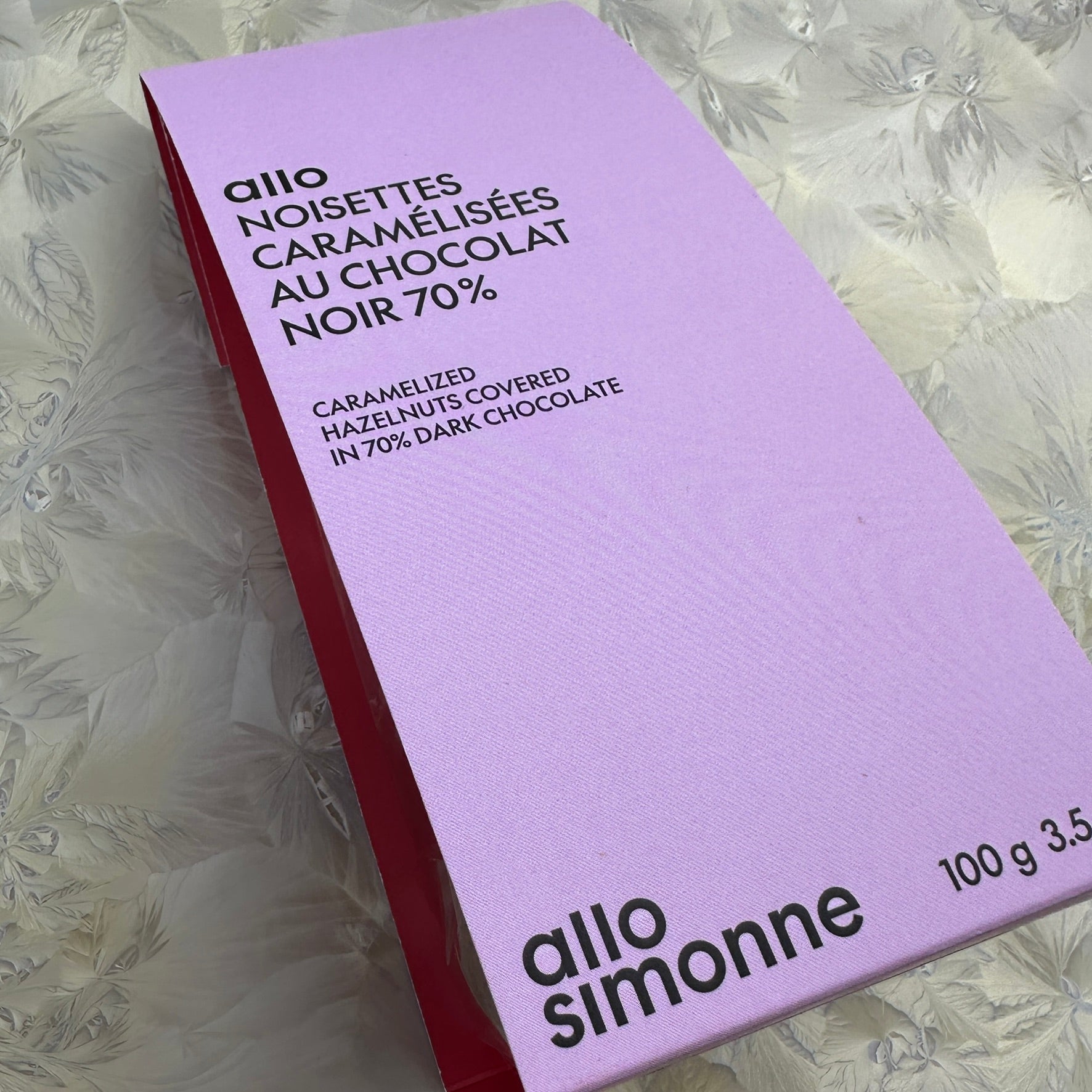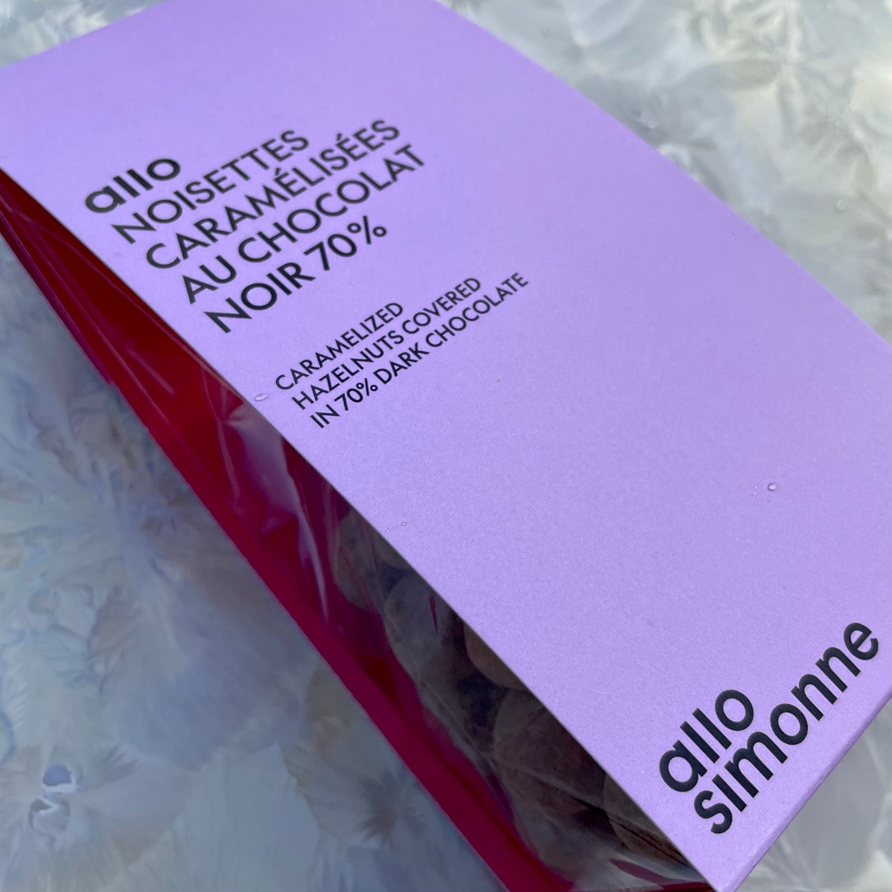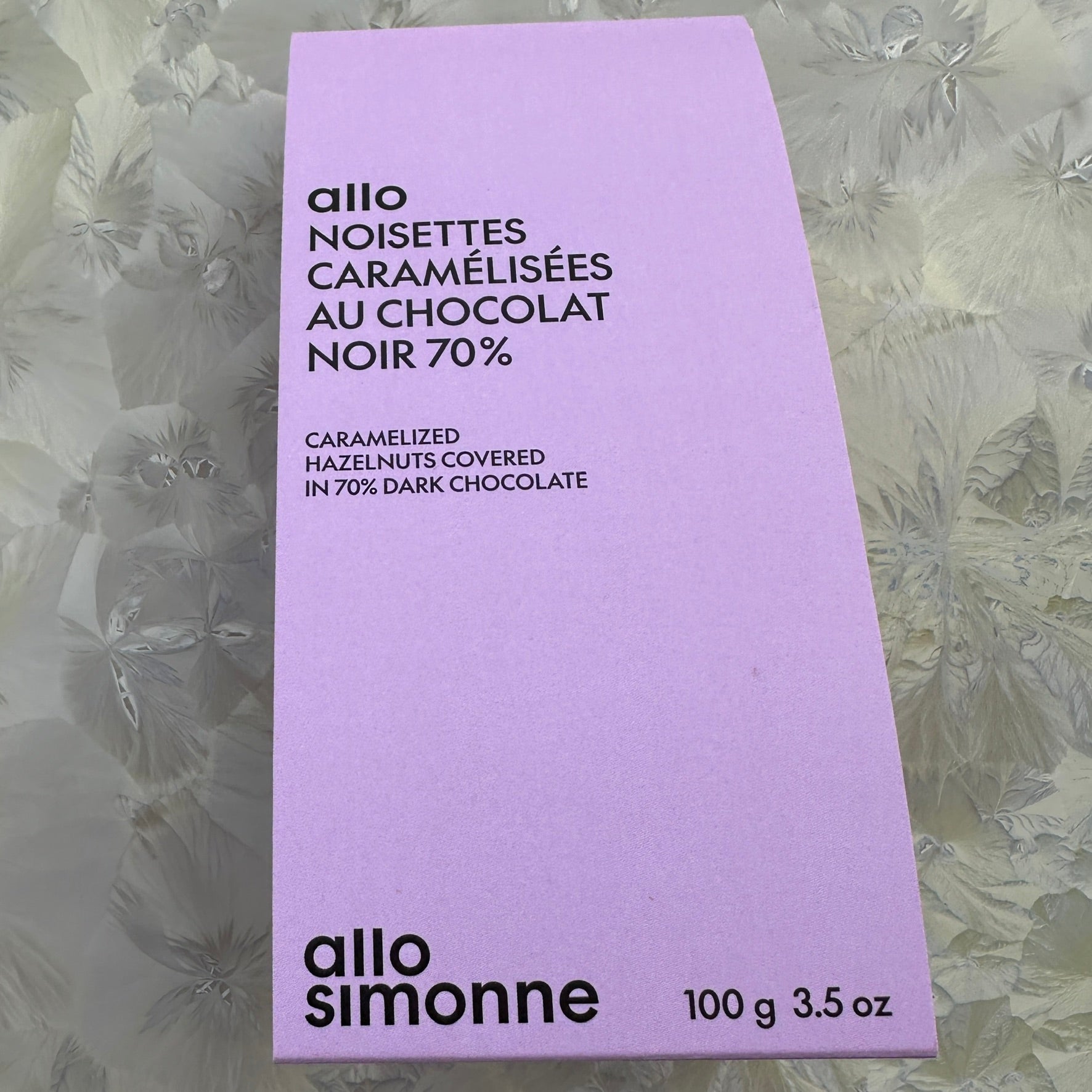 Caramelized hazelnuts enrobed in 70% dark chocolate.