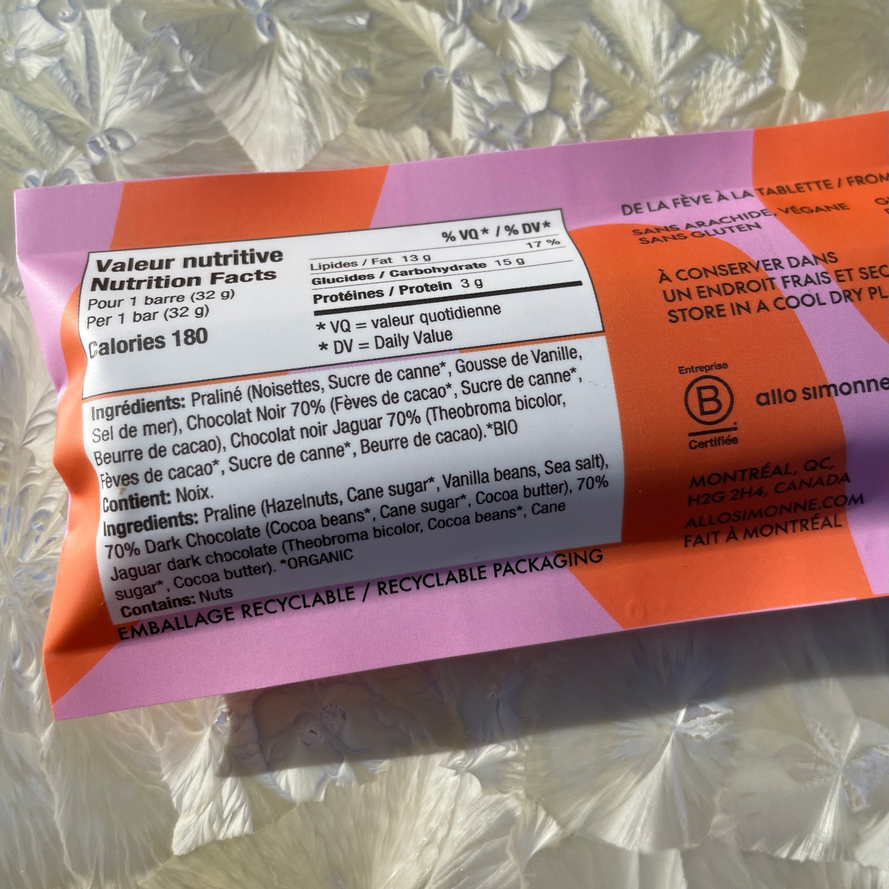 Our classic bar in tasting format. An exceptional gianduja combining the sweetness of our hazelnut praline with the subtlety of our Jaguar dark chocolate. Coated with 70% dark chocolate made from selected beans from the Dominican Republic.