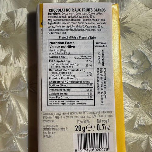Dark chocolate extra 63% with peaches and apricots.
