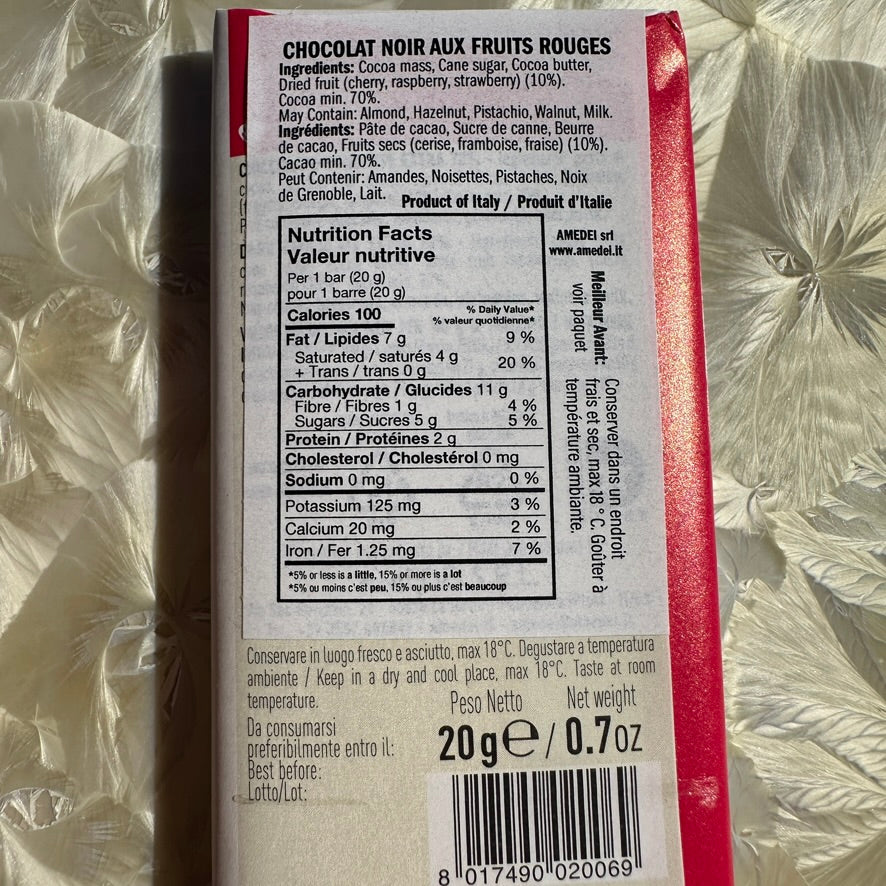 Dark chocolate extra 70% with strawberries, raspberries and cherries.