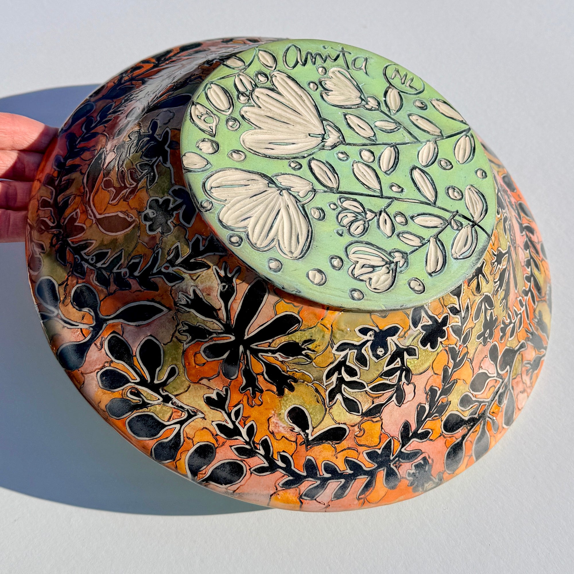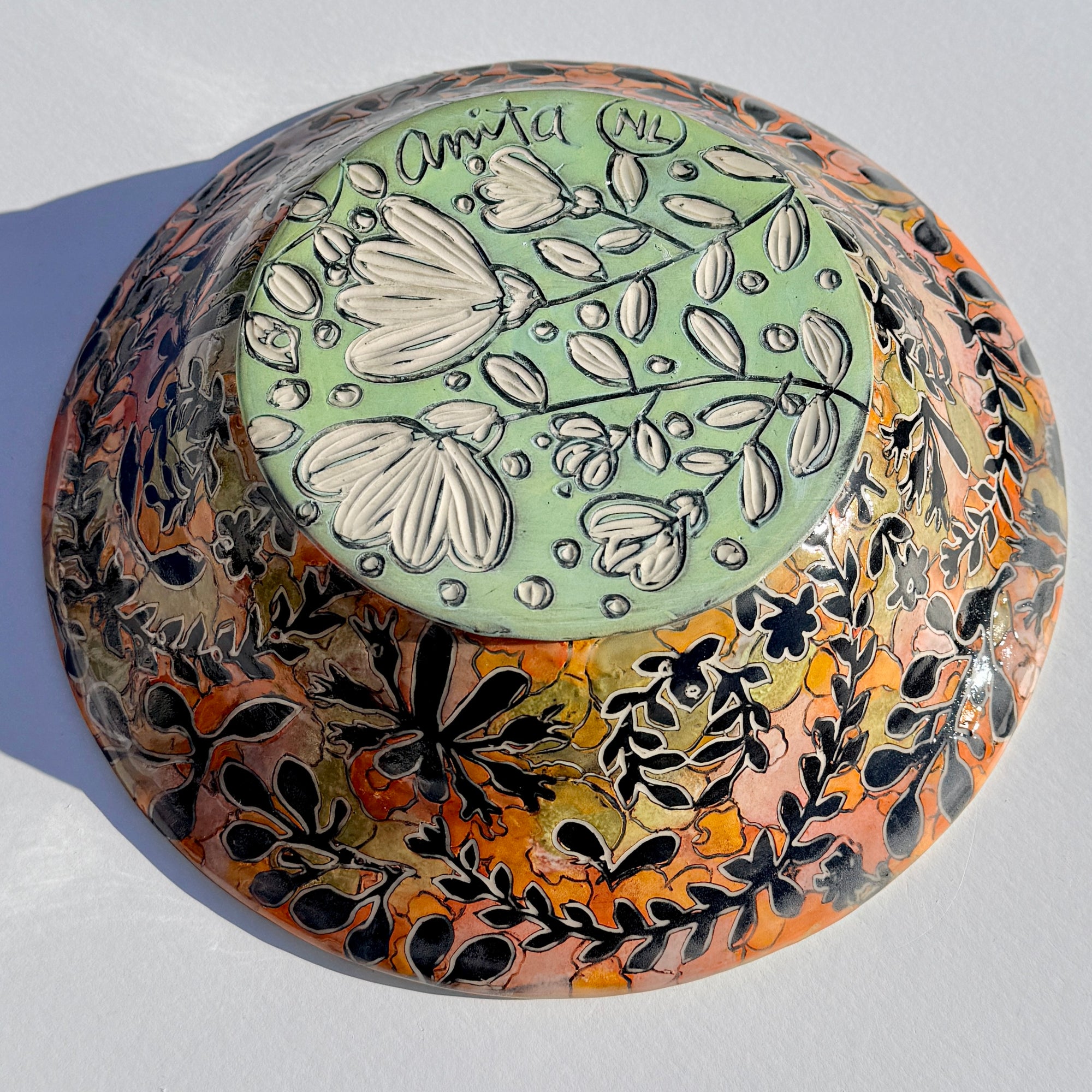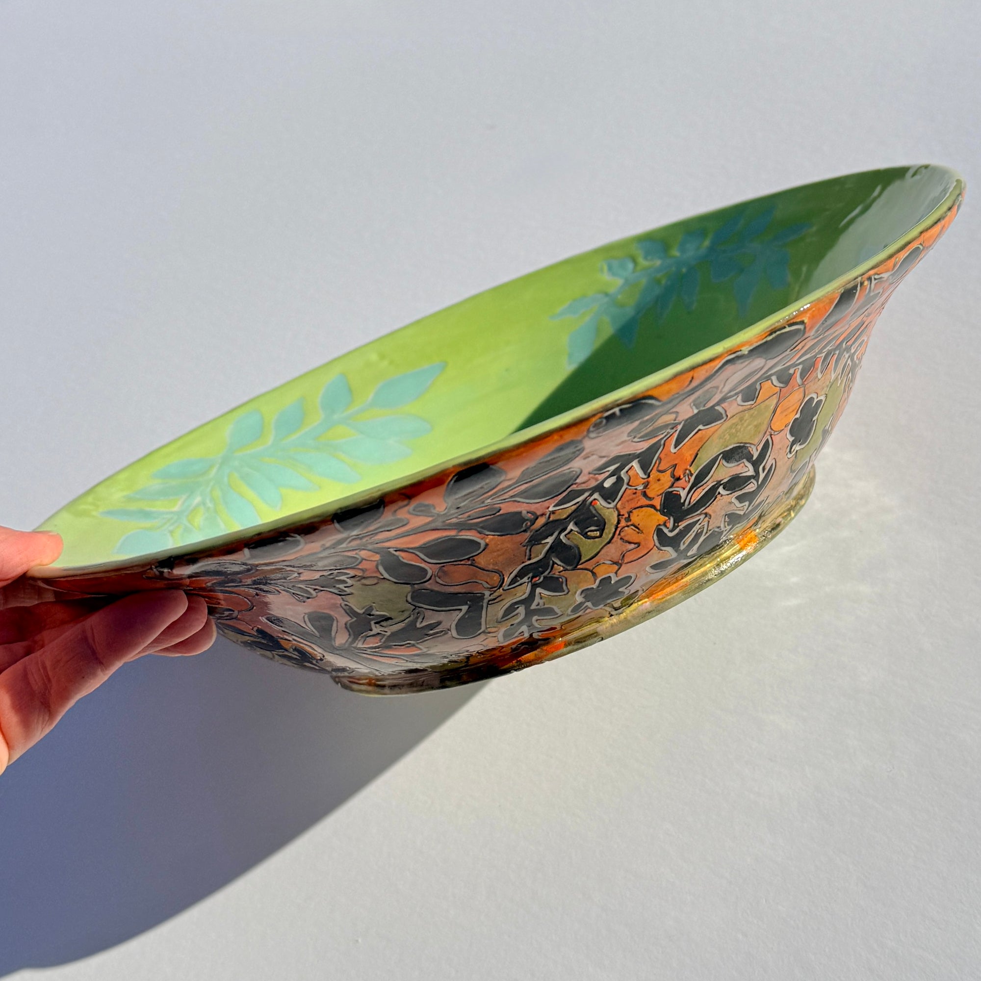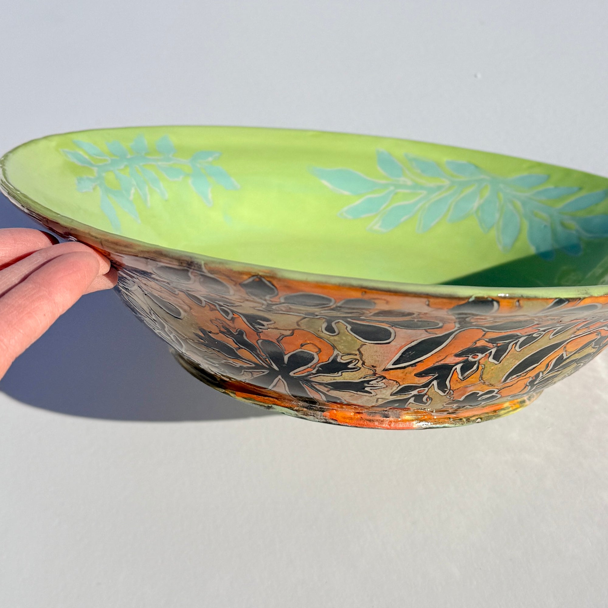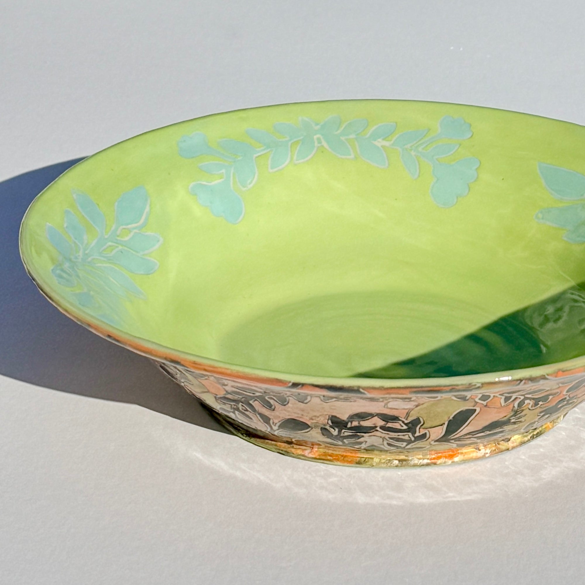 Bowl with multicoloured botanical pattern and bright green & cyan interior.