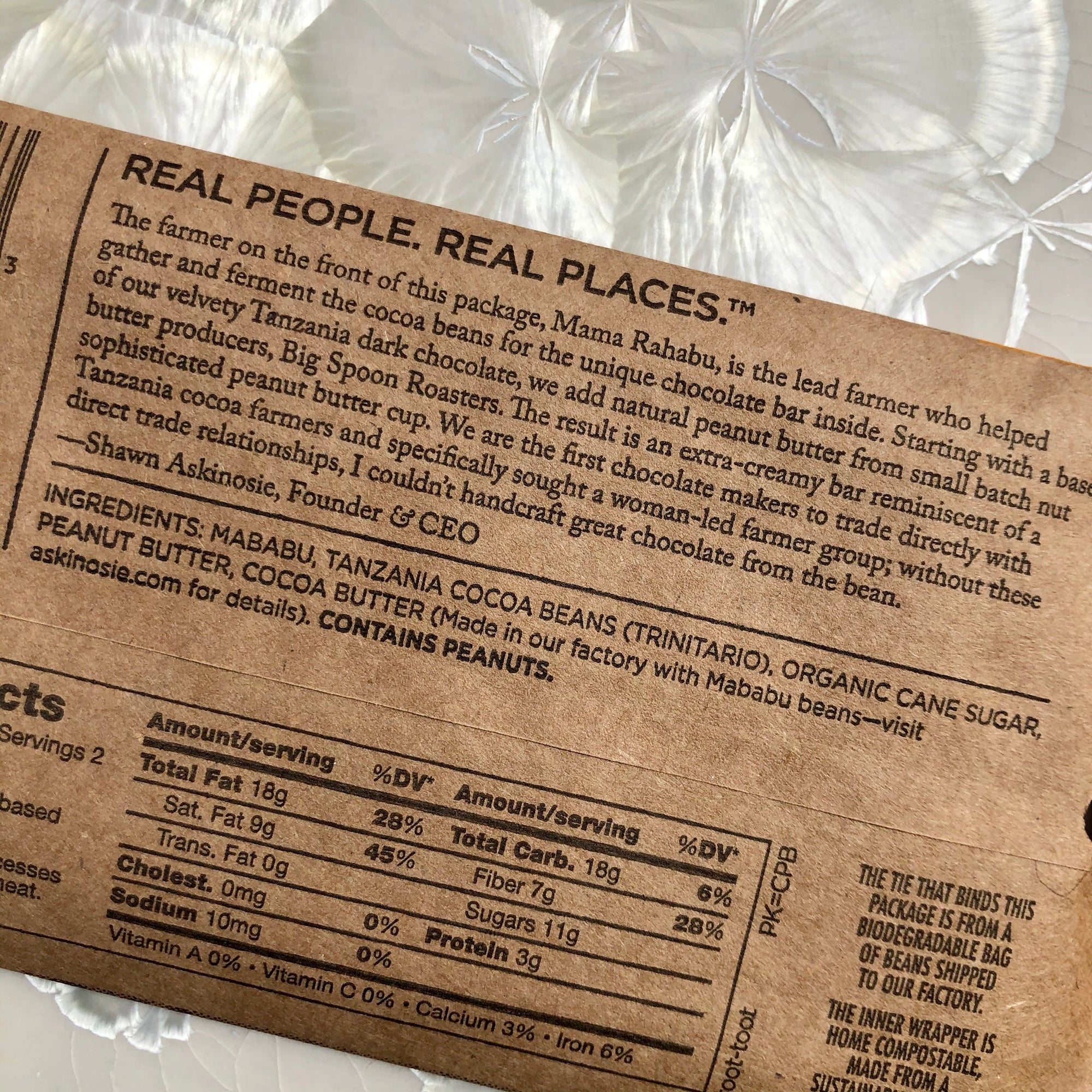 Fjnok h I’m k to Starting with a base of velvety Tanzania dark chocolate, Askinosie adds natural peanut butter from small batch, nut butter producers Big Spoon Roasters.