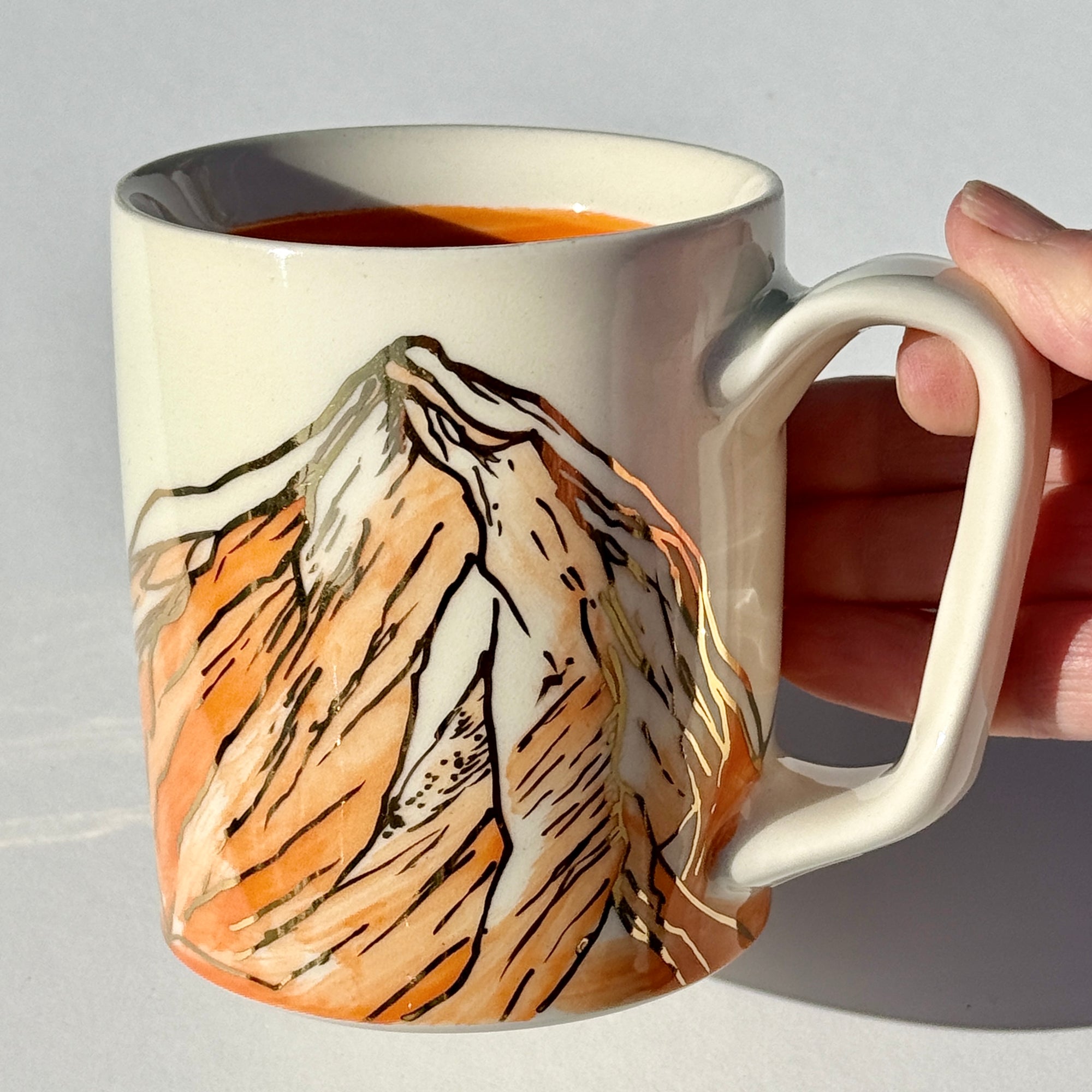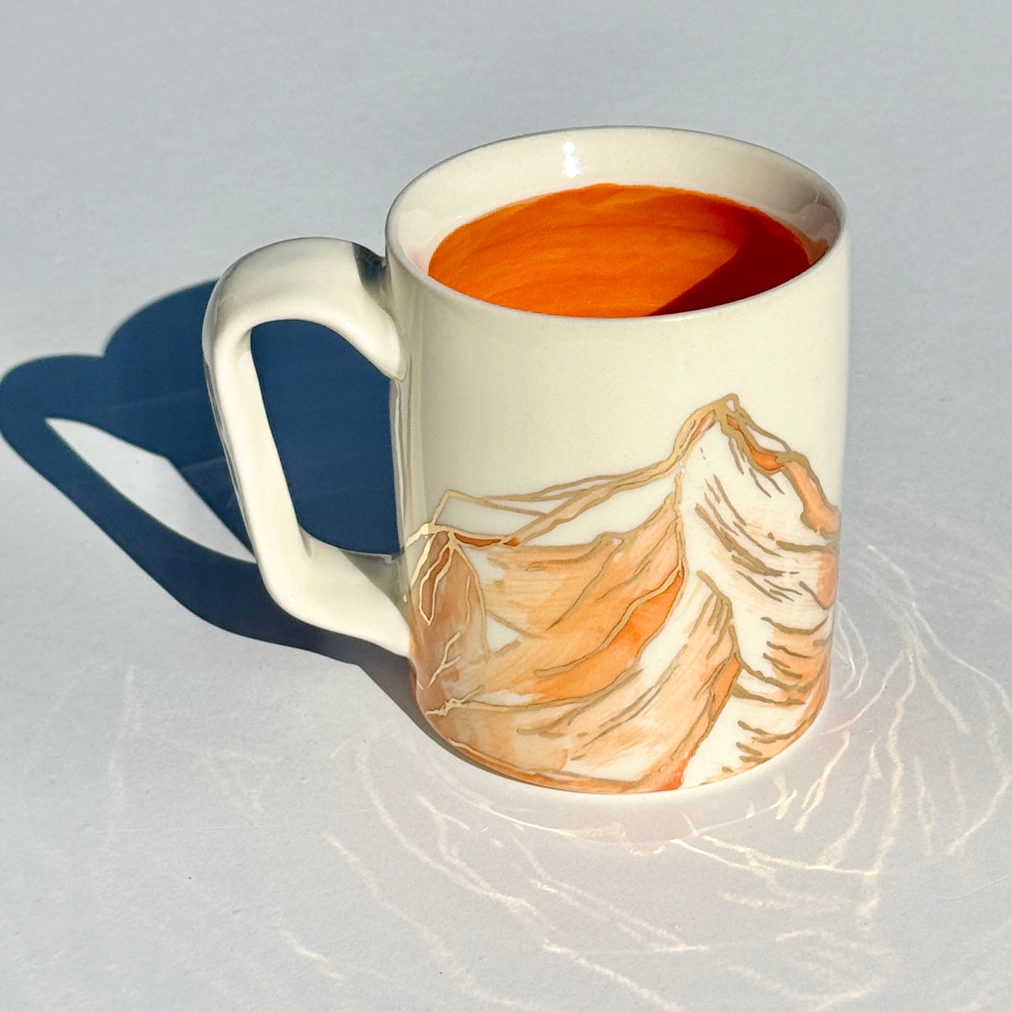 The sparkle on the orange mountains on this mug is 24k gold! The gold is applied to the glazed piece and the mug is fired an additional time.