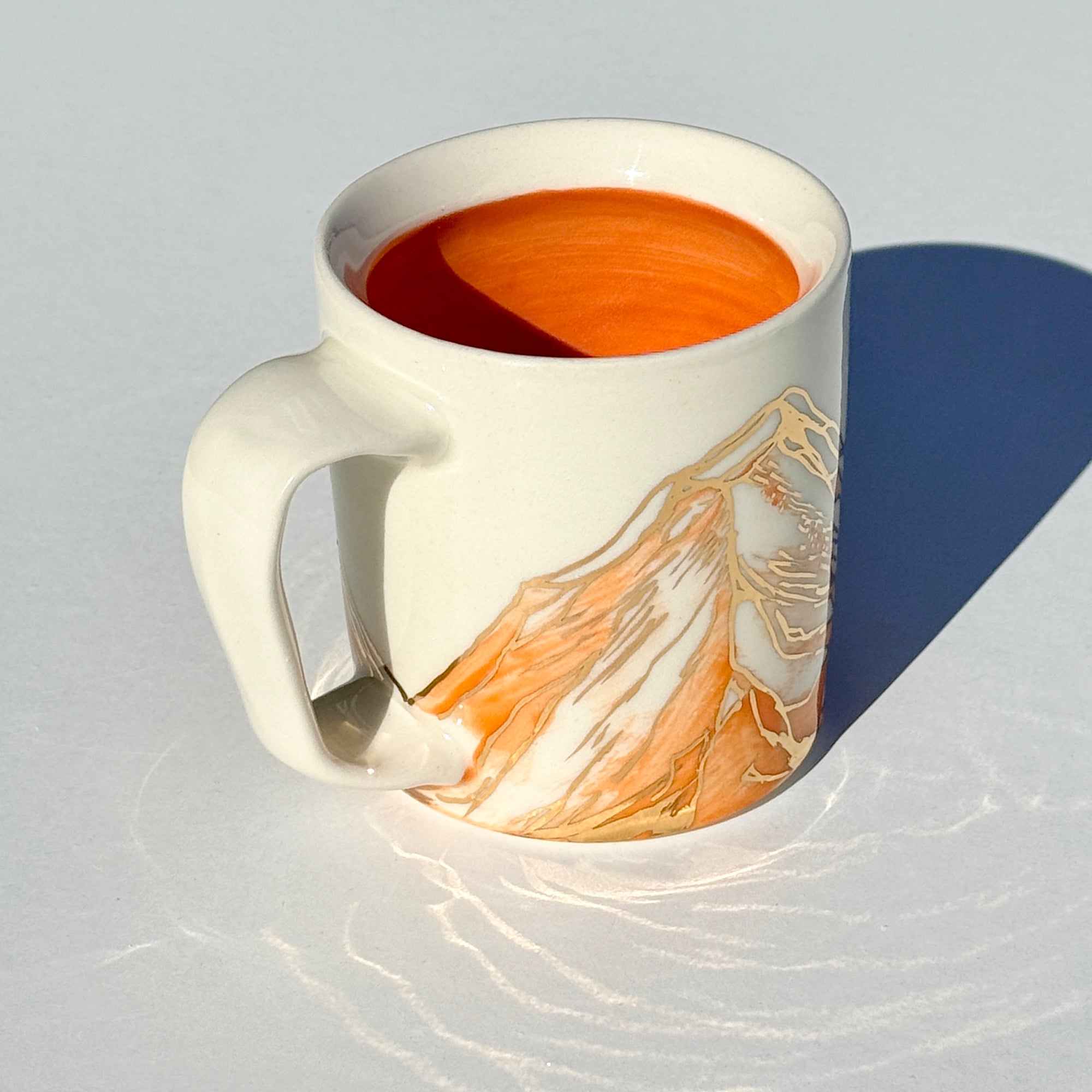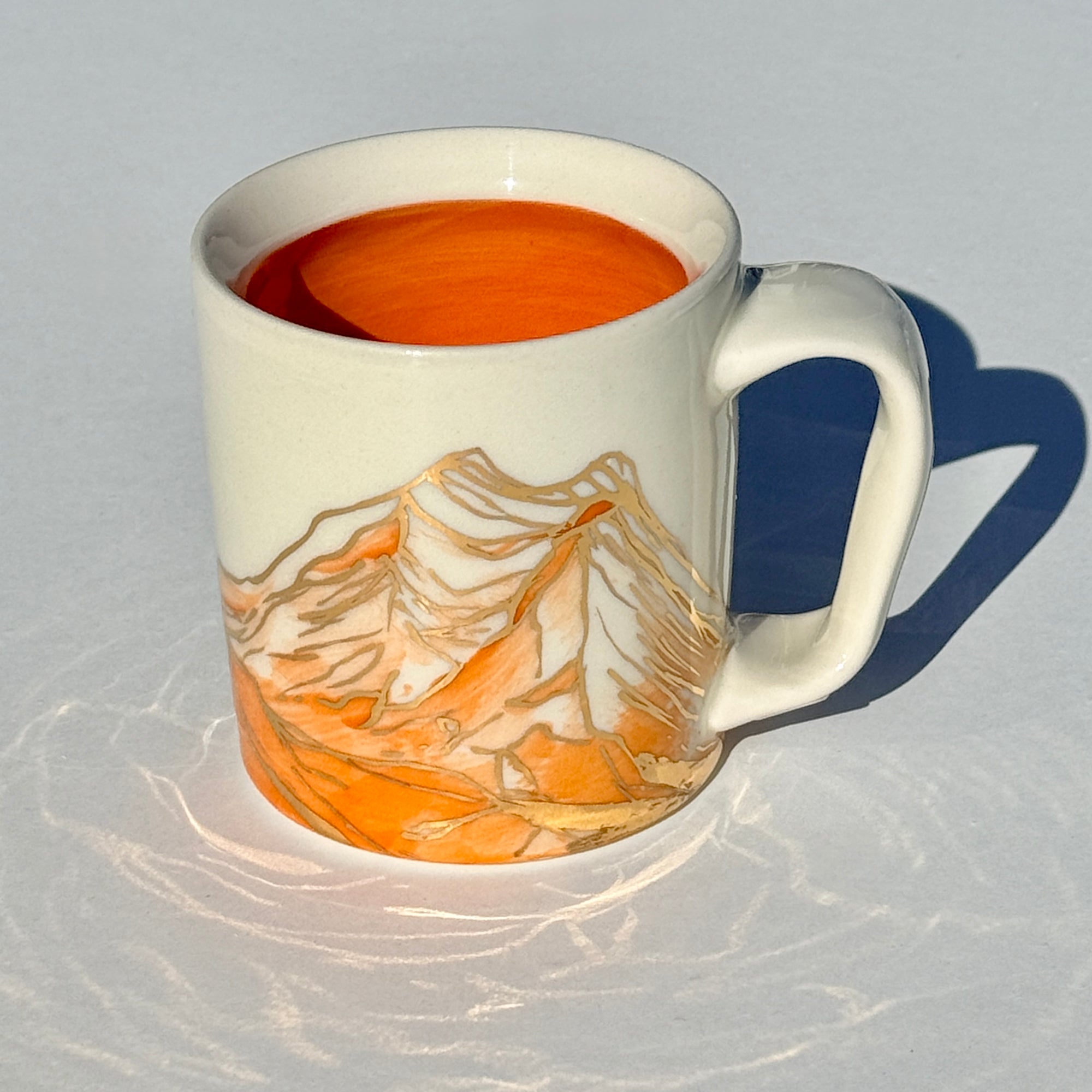 The sparkle on the orange mountains on this mug is 24k gold! The gold is applied to the glazed piece and the mug is fired an additional time.