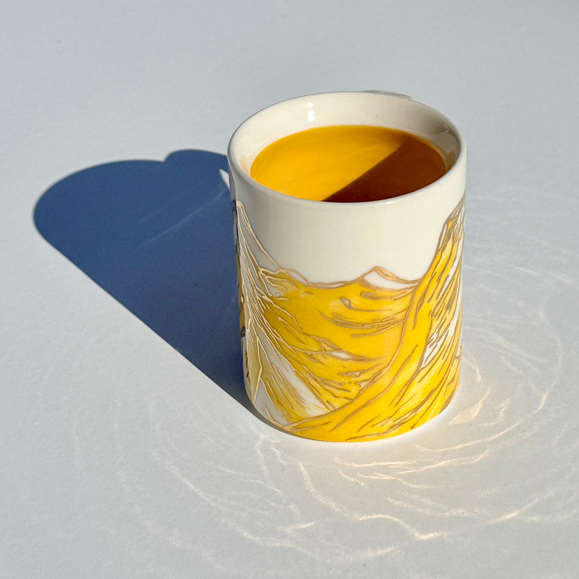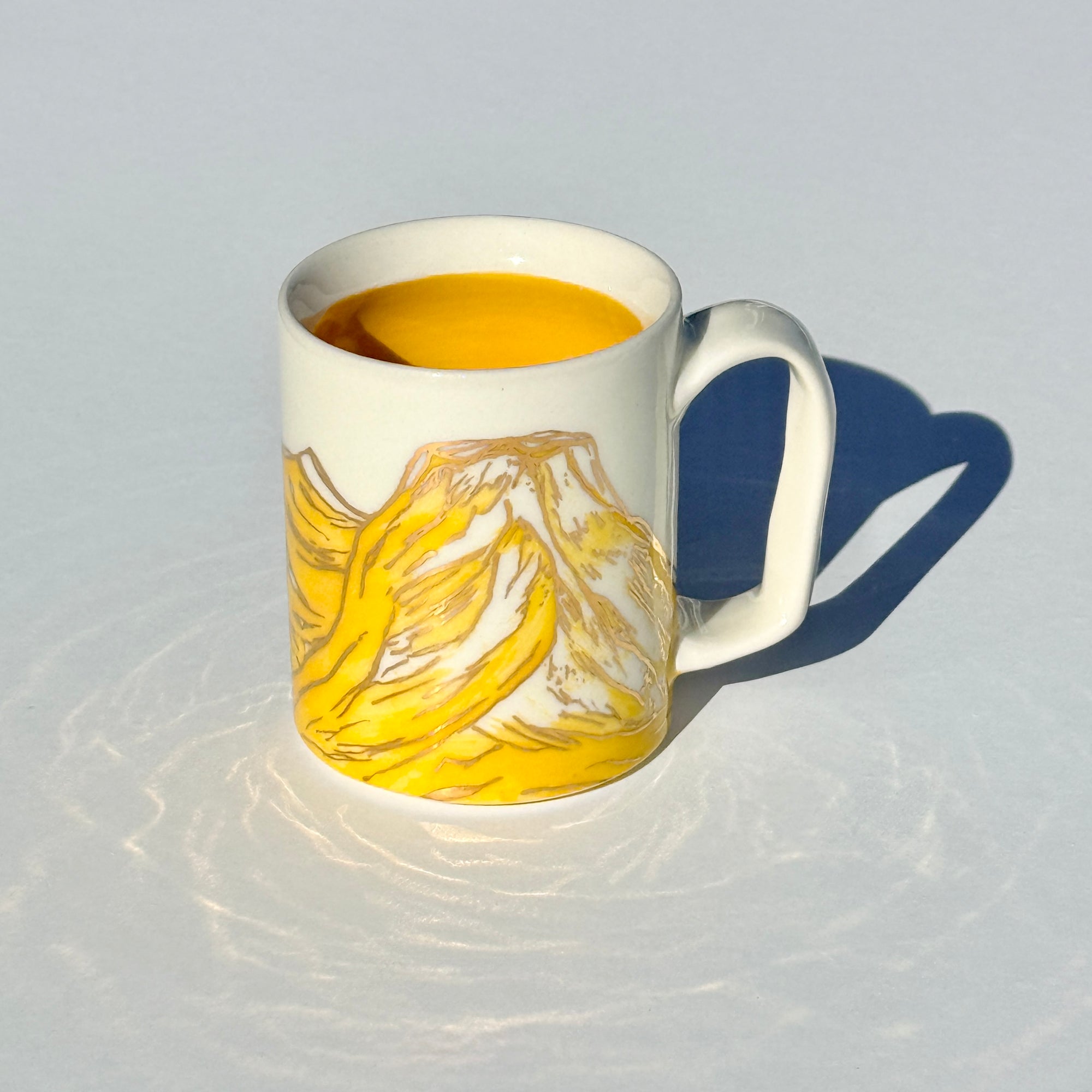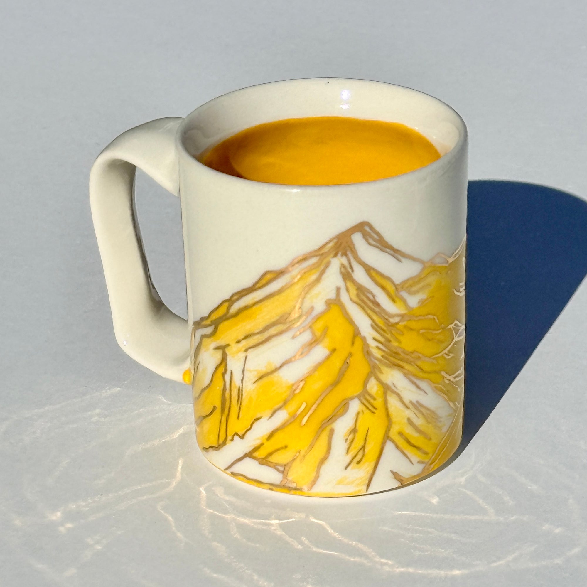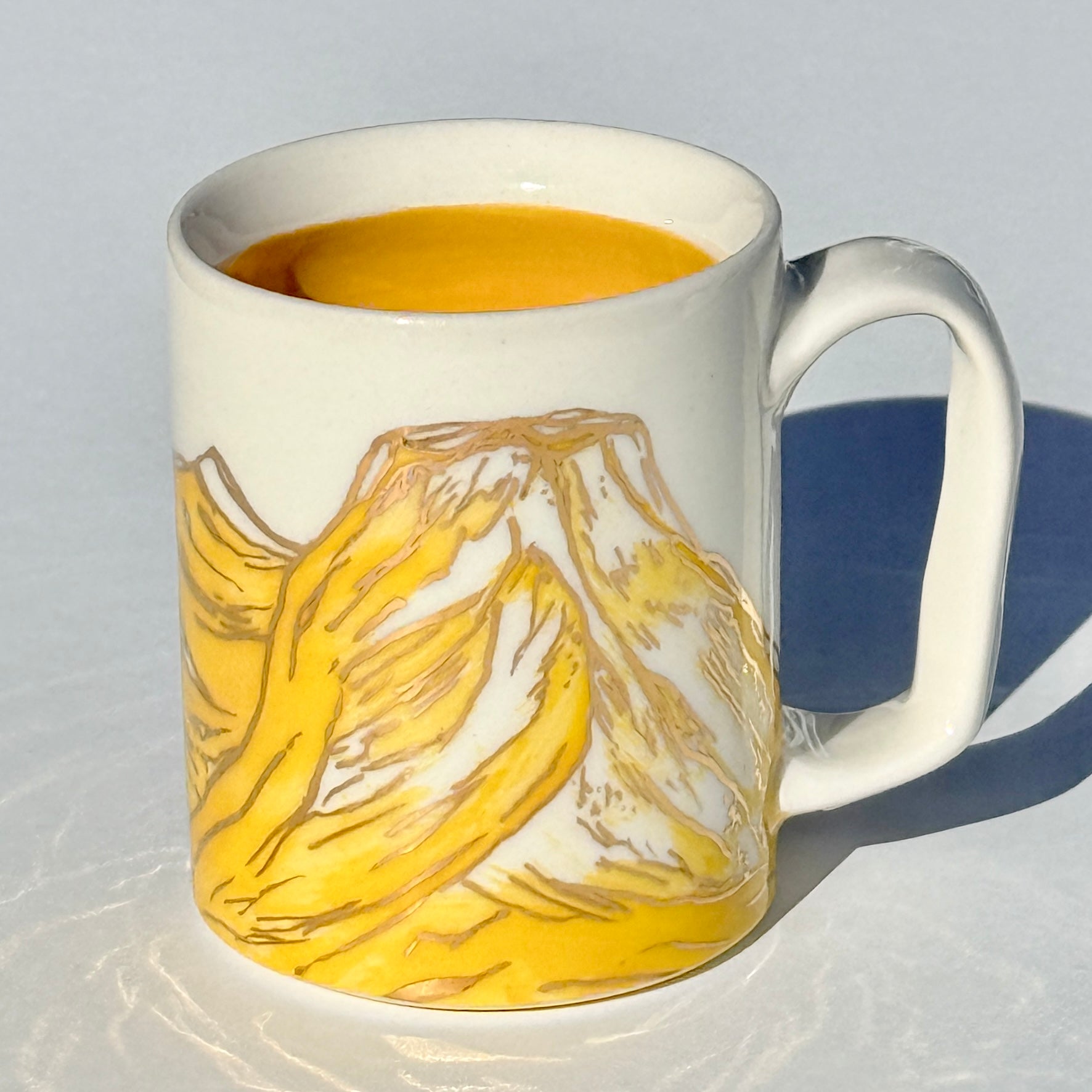 The sparkle on the yellow mountains on this mug is 24k gold! The gold is applied to the glazed piece and the mug is fired an additional time.