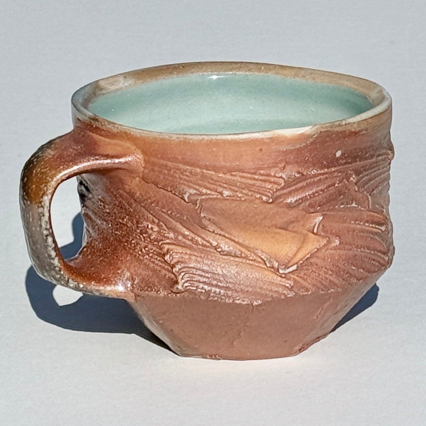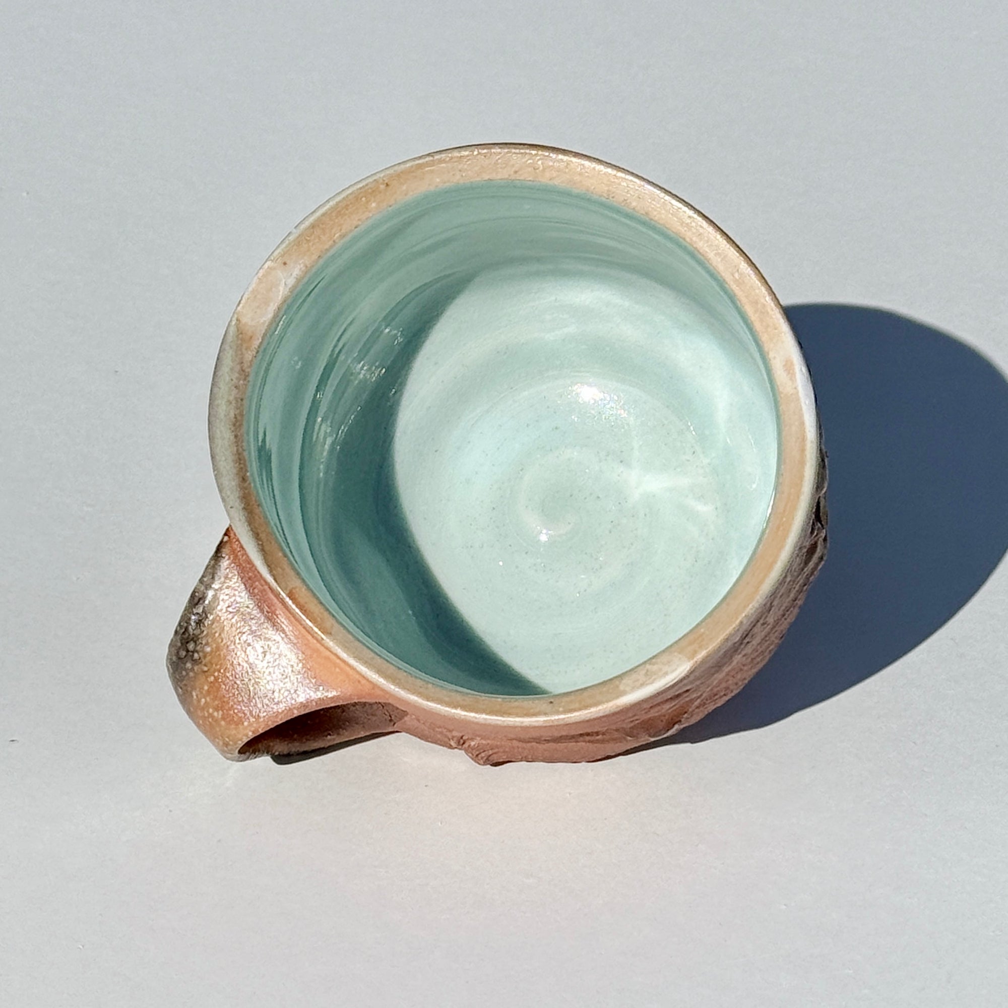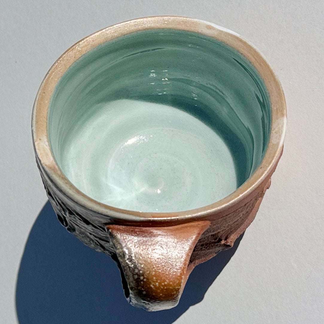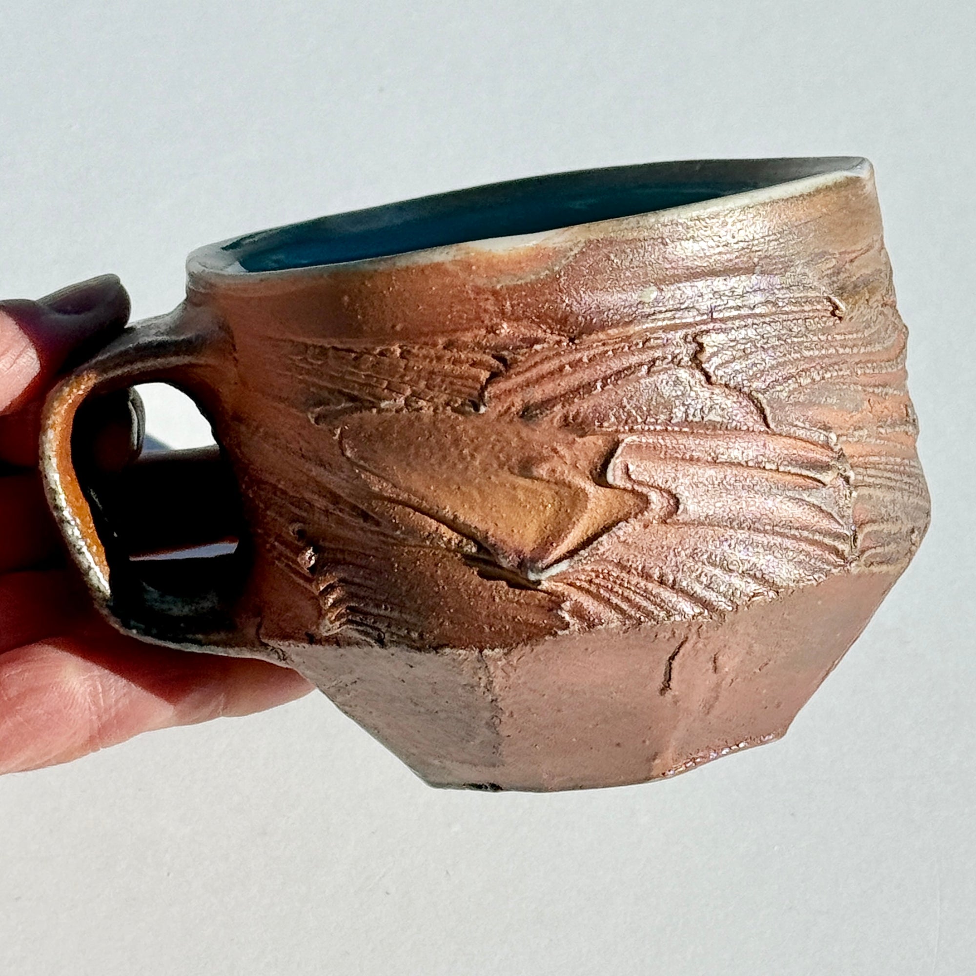 Brown-grey soda-fired mug with light blue interior.