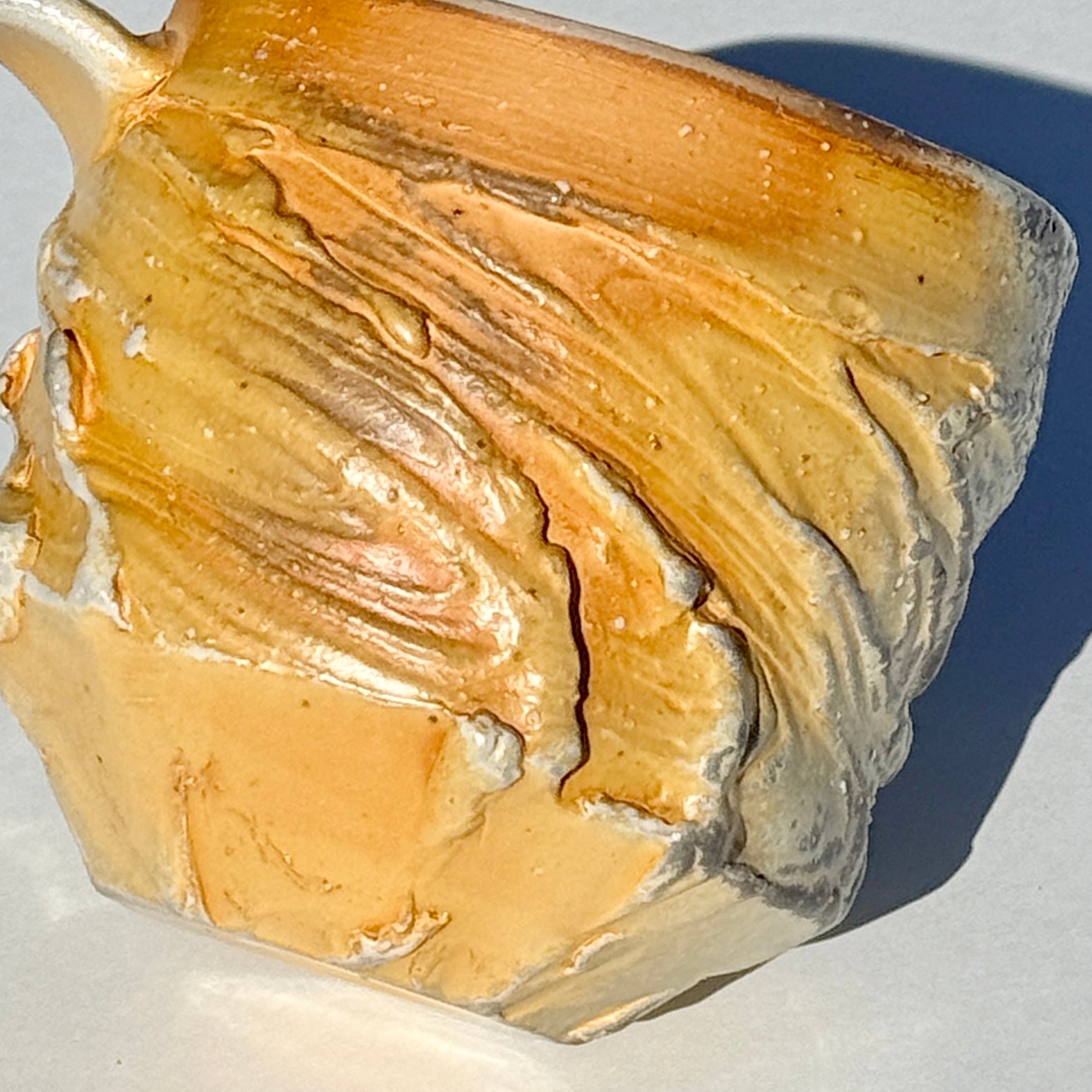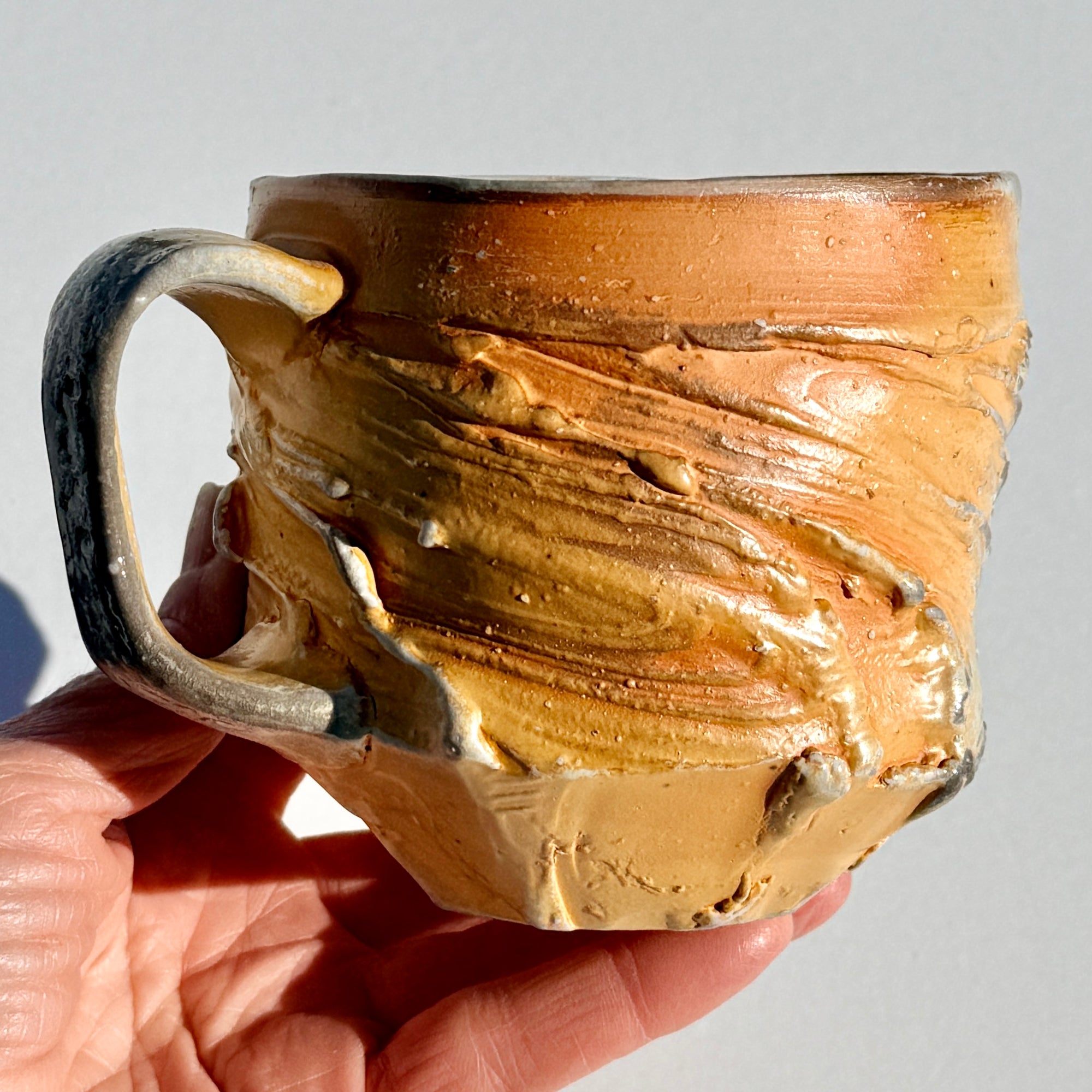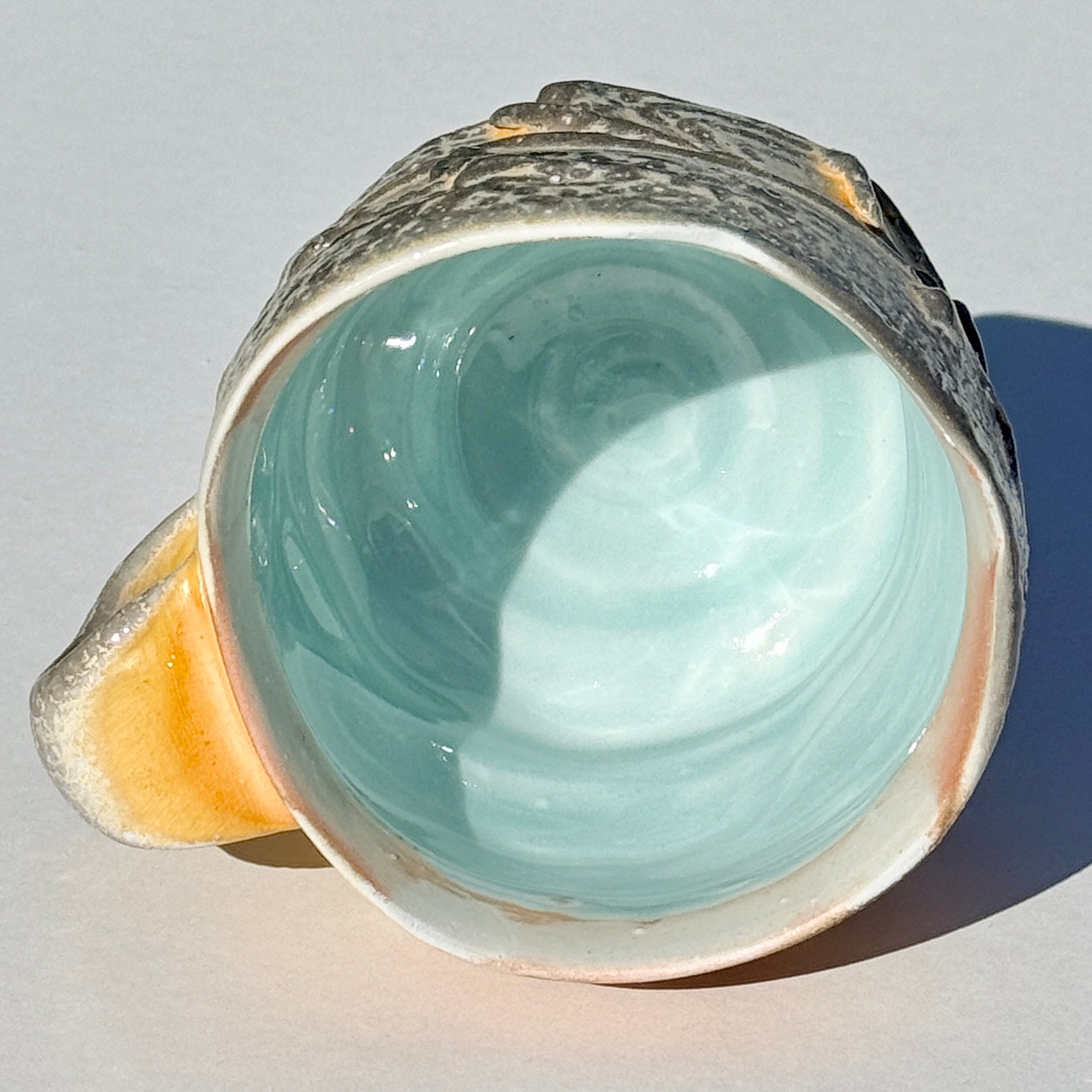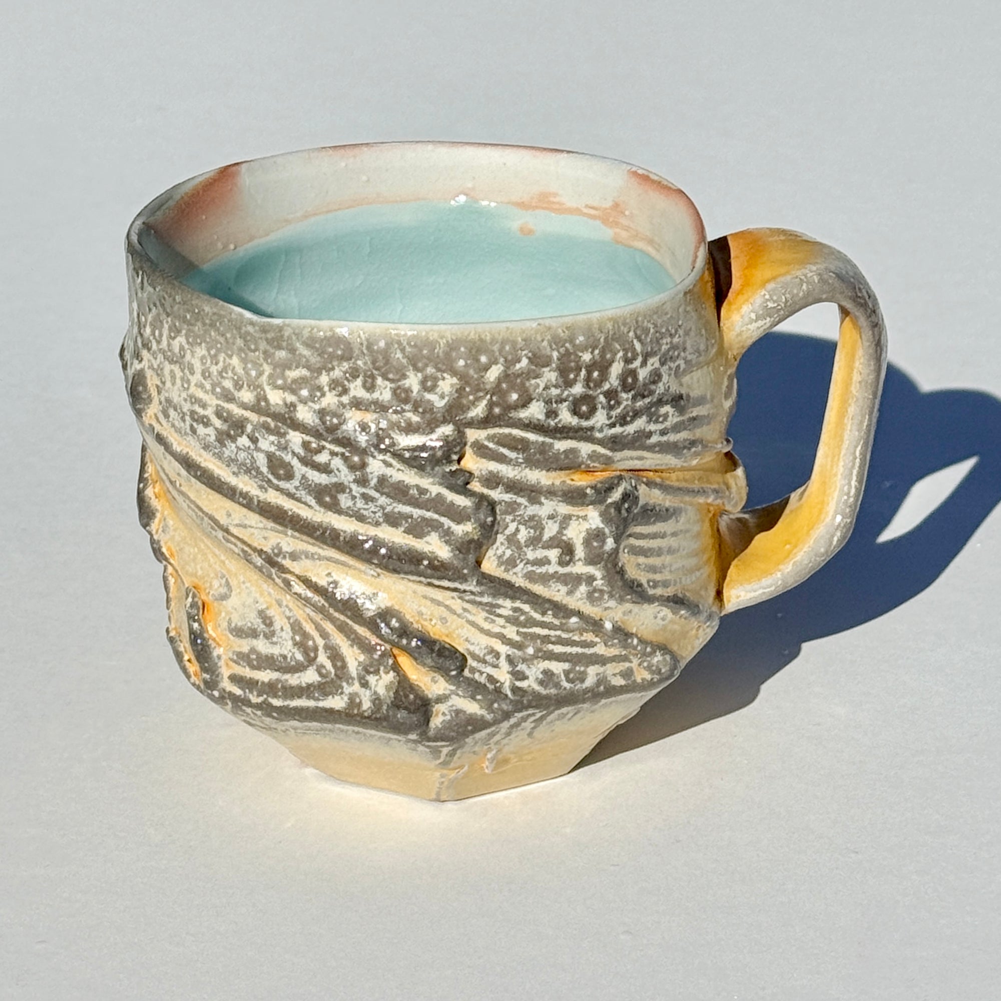 Grey-orange soda-fired mug with light blue interior.