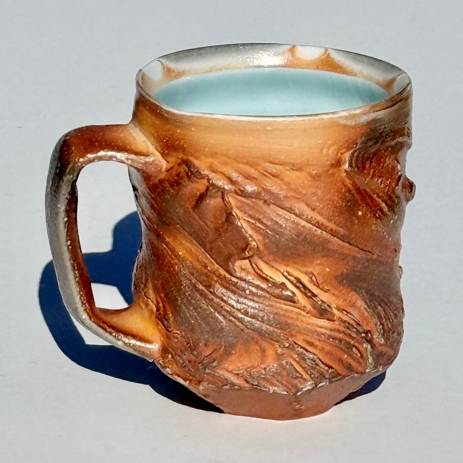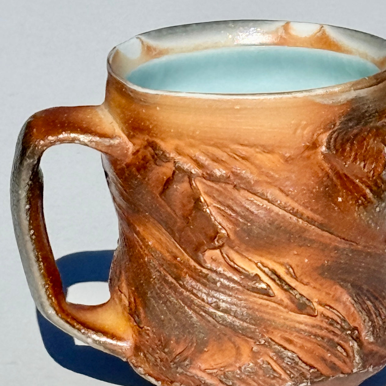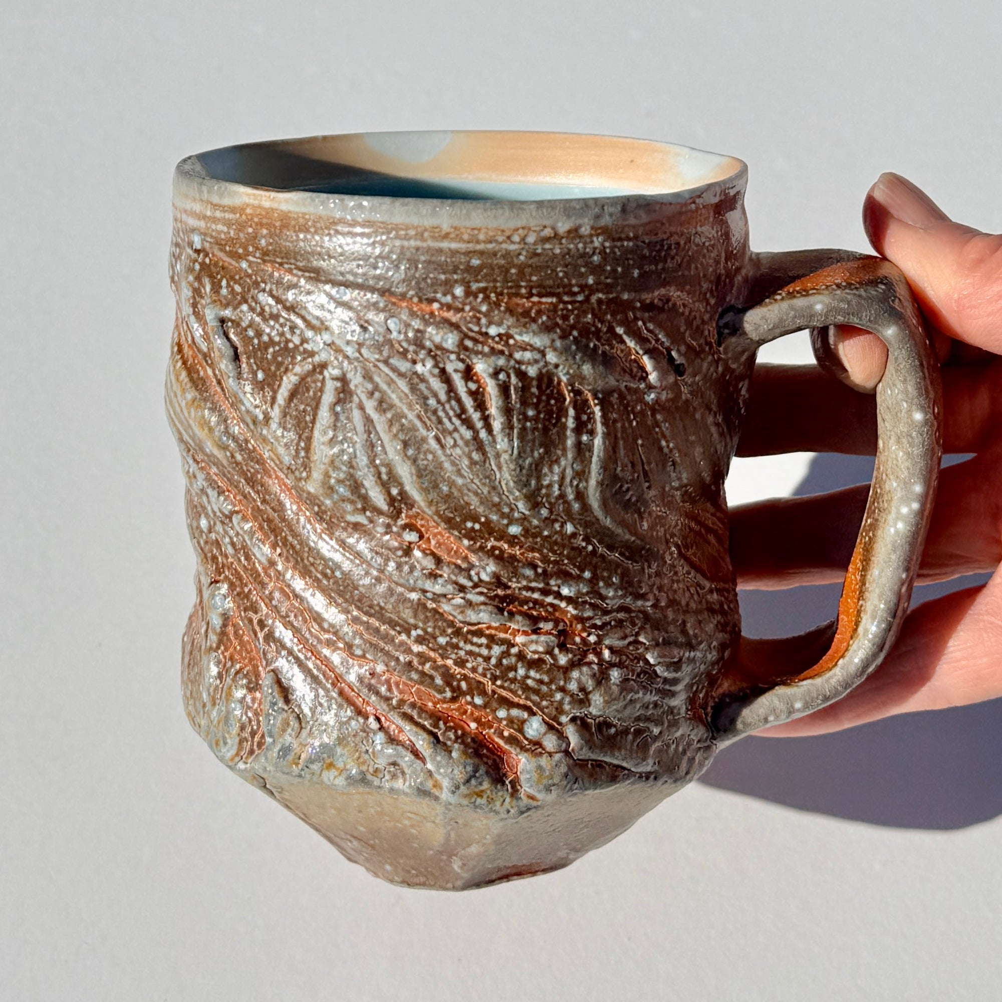 Grey-brown soda-fired mug with light blue interior.