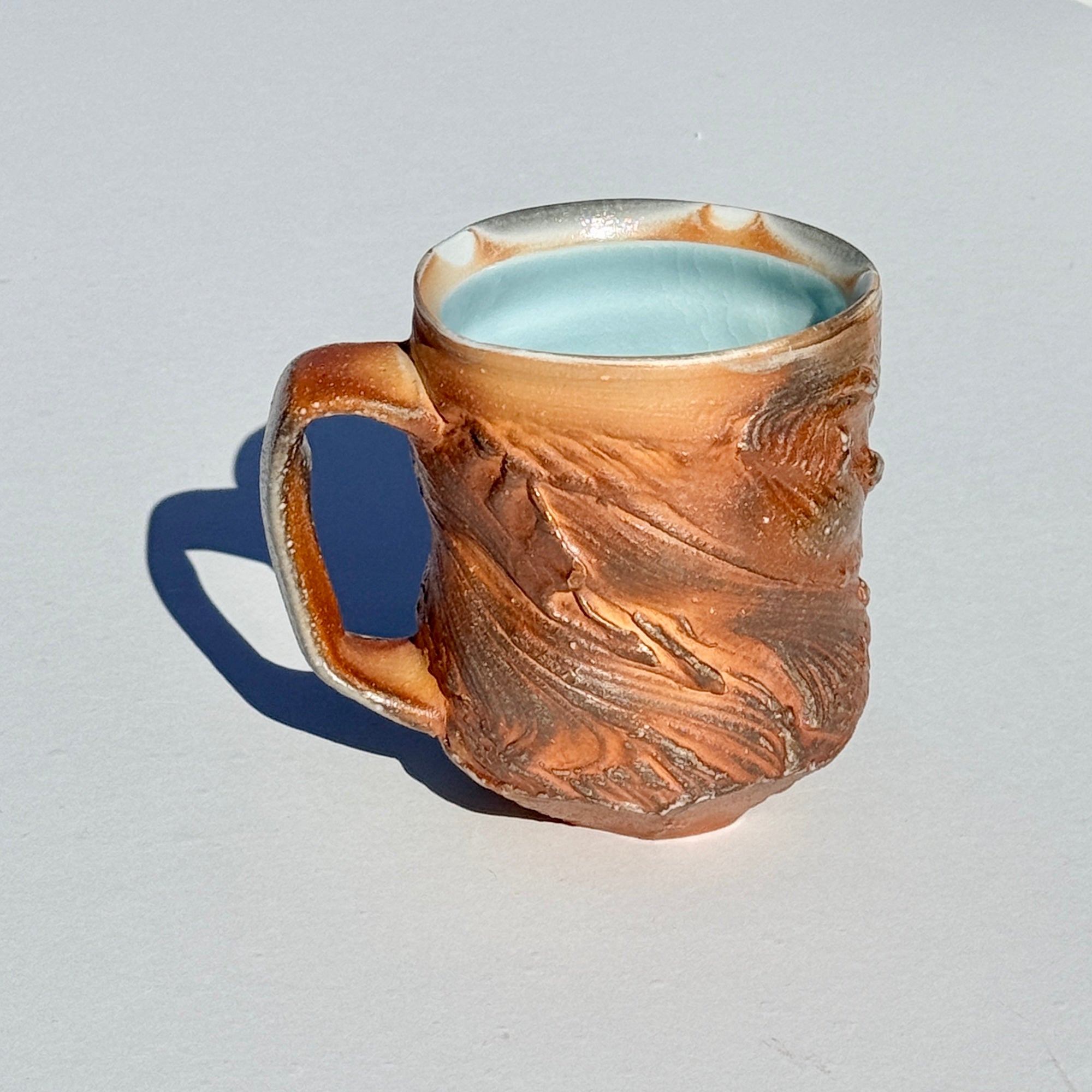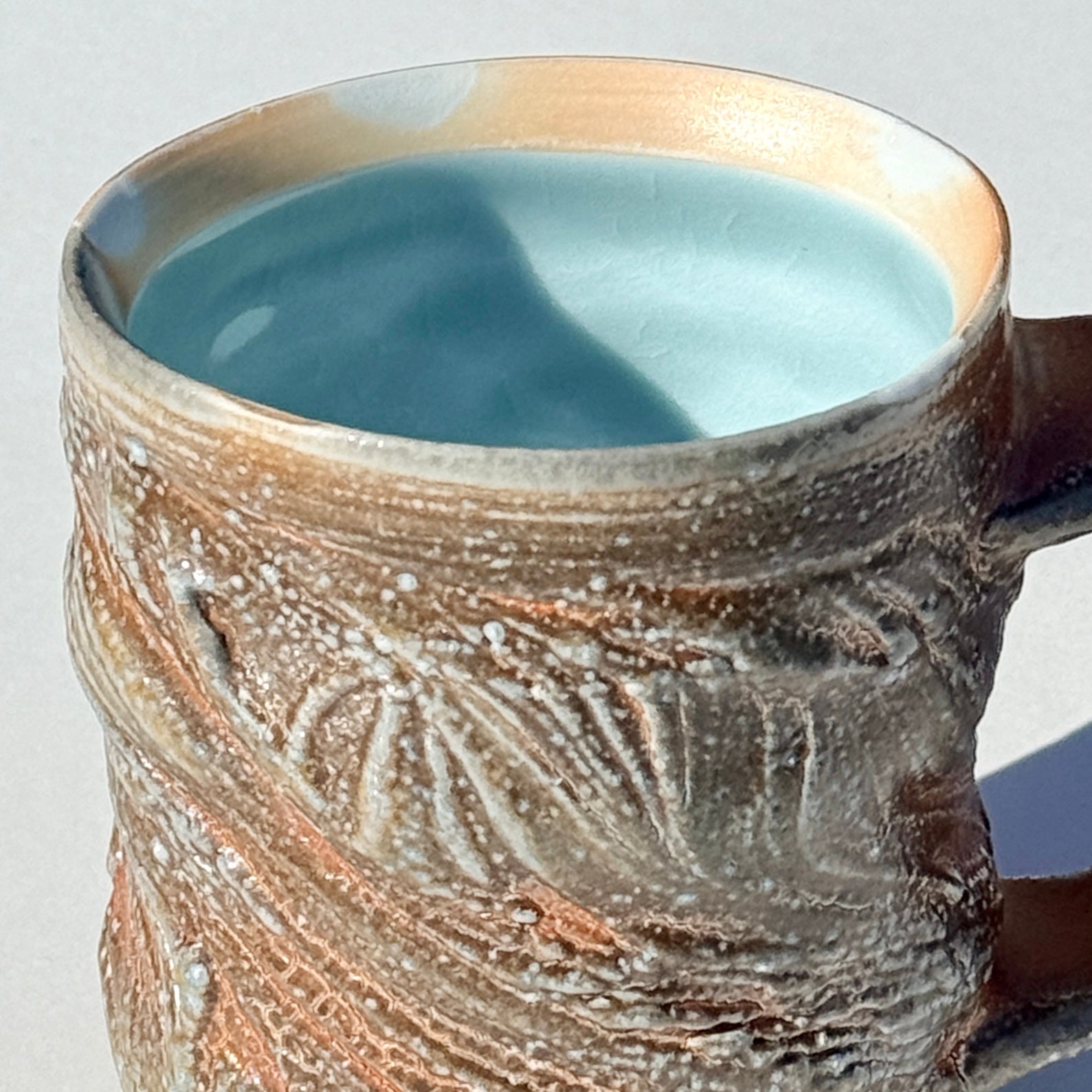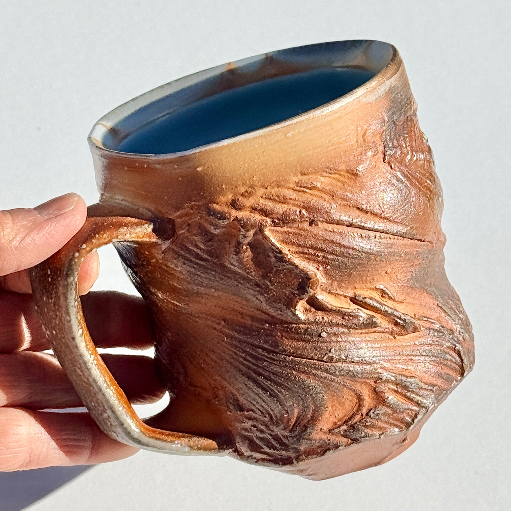 Grey-brown soda-fired mug with light blue interior.