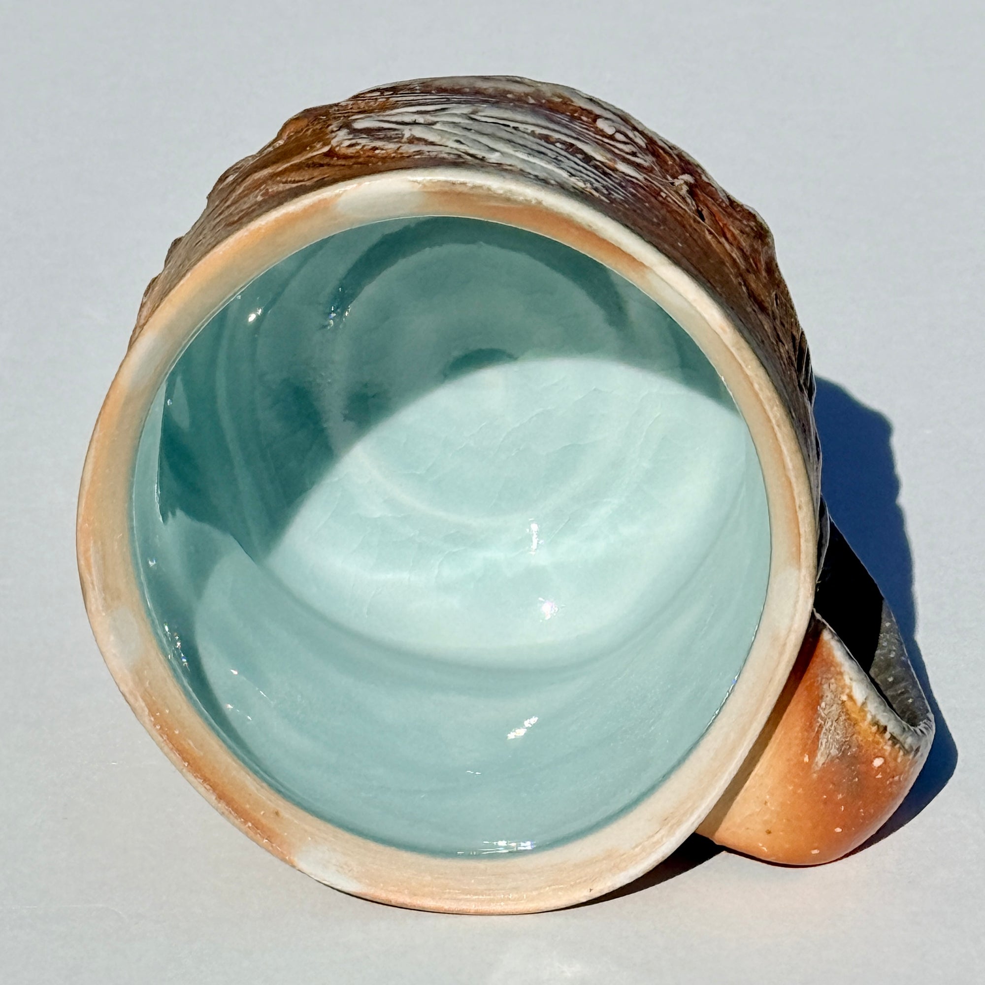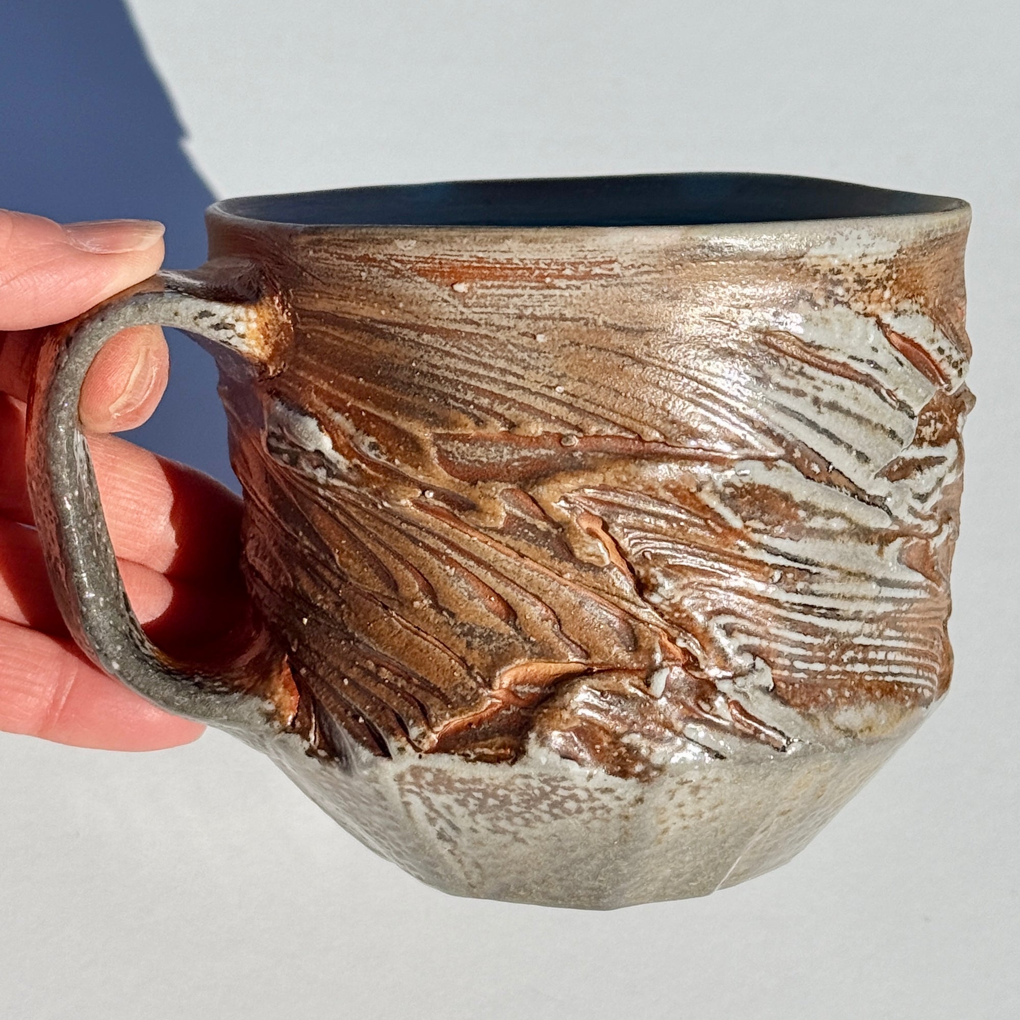 Grey & orange soda-fired mug with light blue interior.