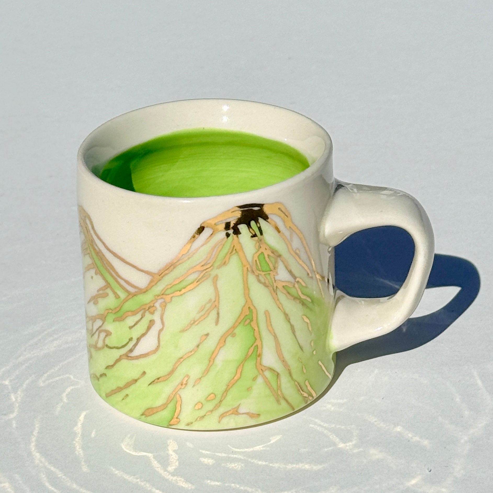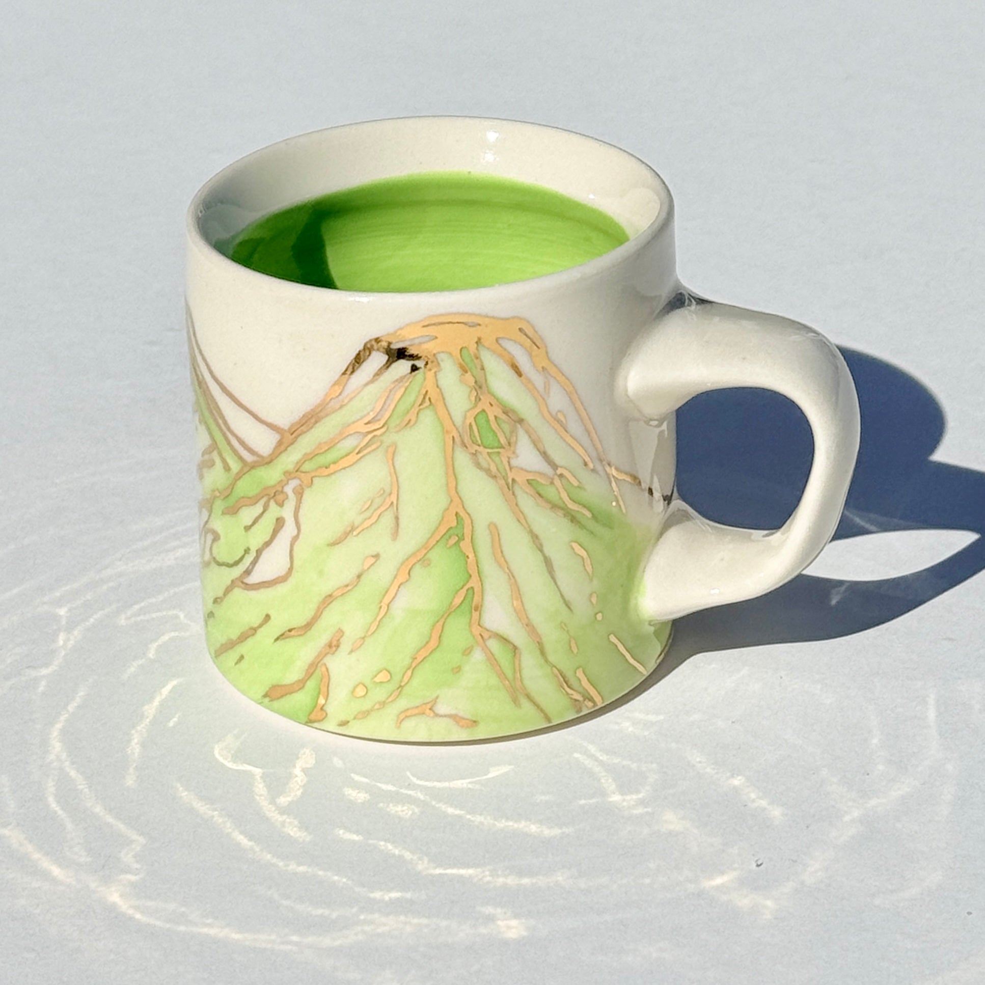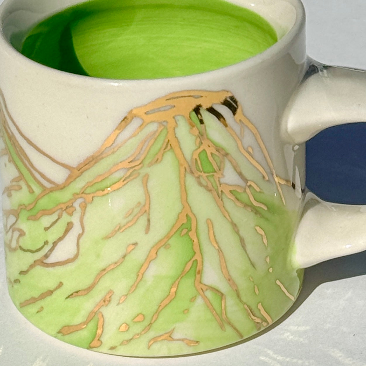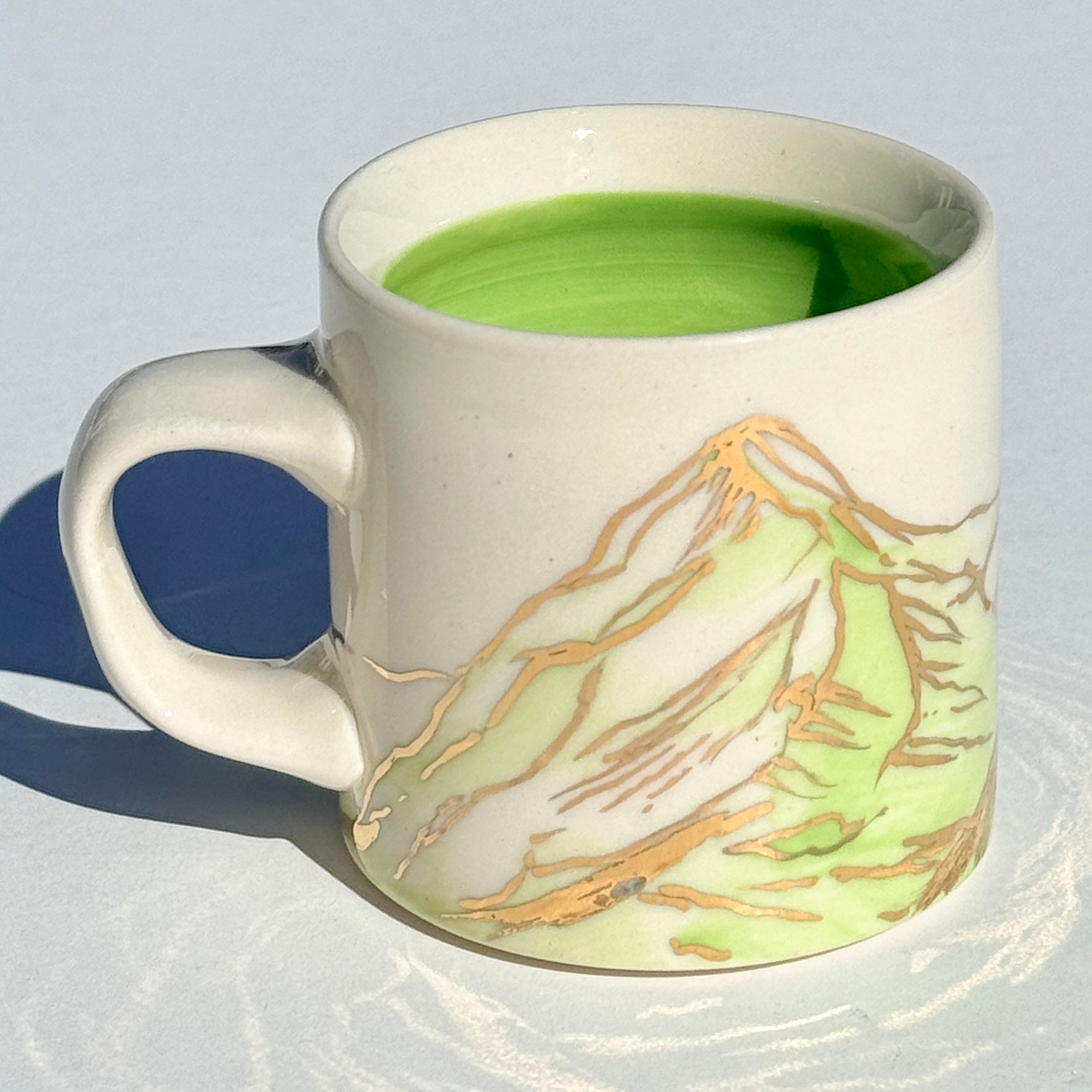 The sparkle on the green mountains on this mug is 24k gold! The gold is applied to the glazed piece and the mug is fired an additional time.