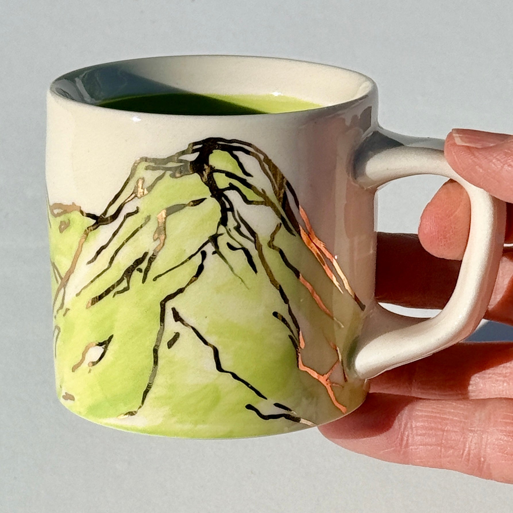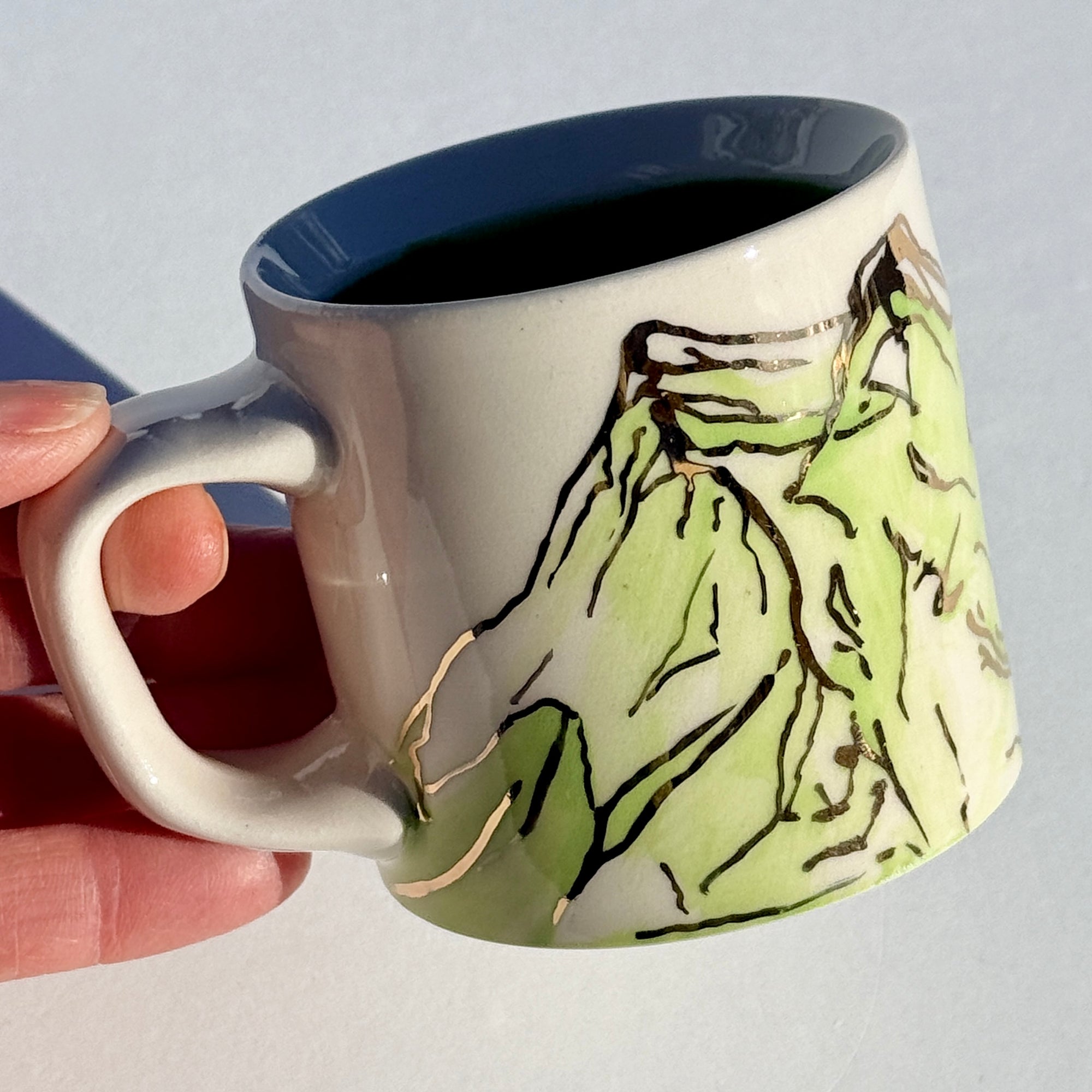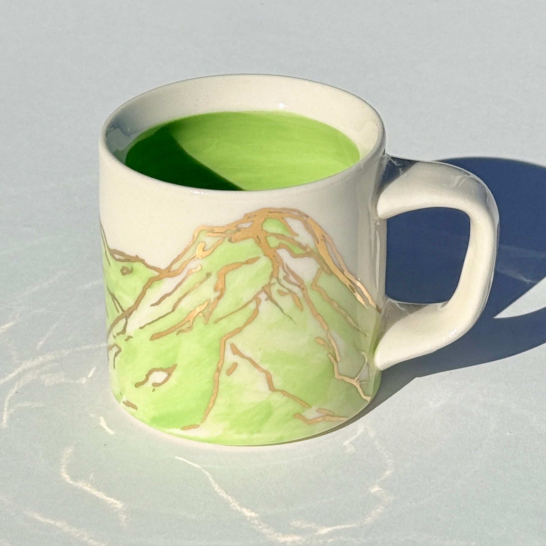The sparkle on the green mountains on this mug is 24k gold! The gold is applied to the glazed piece and the mug is fired an additional time.
