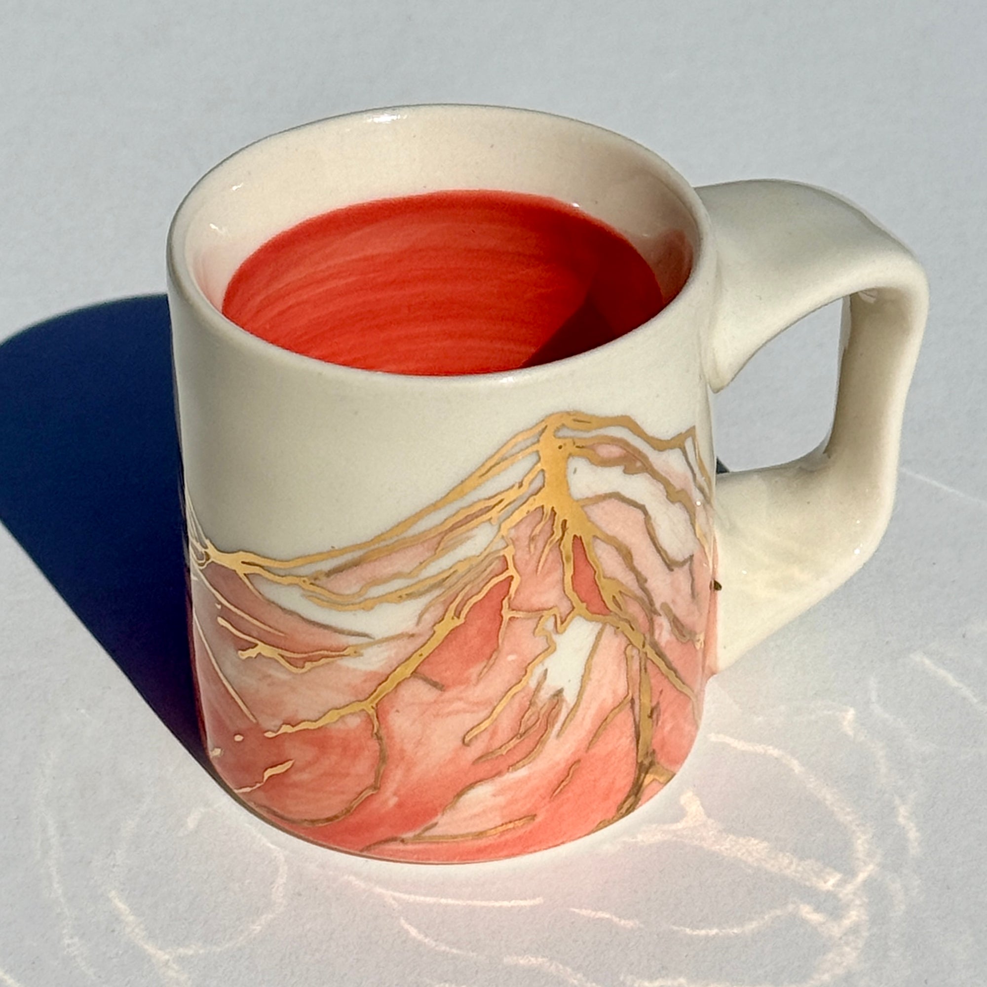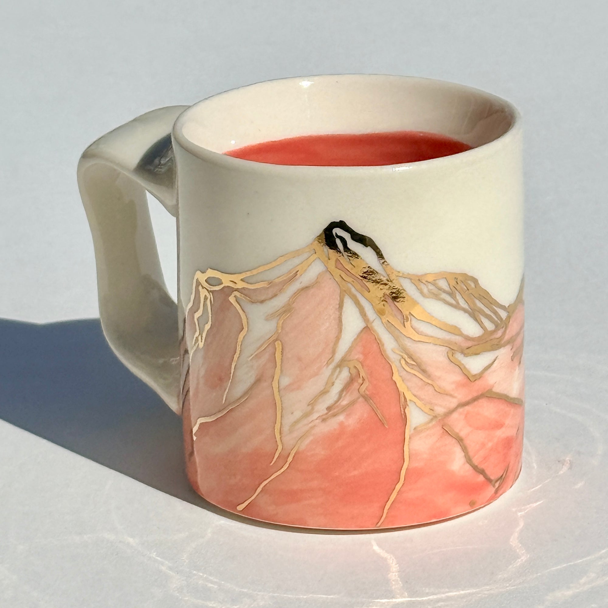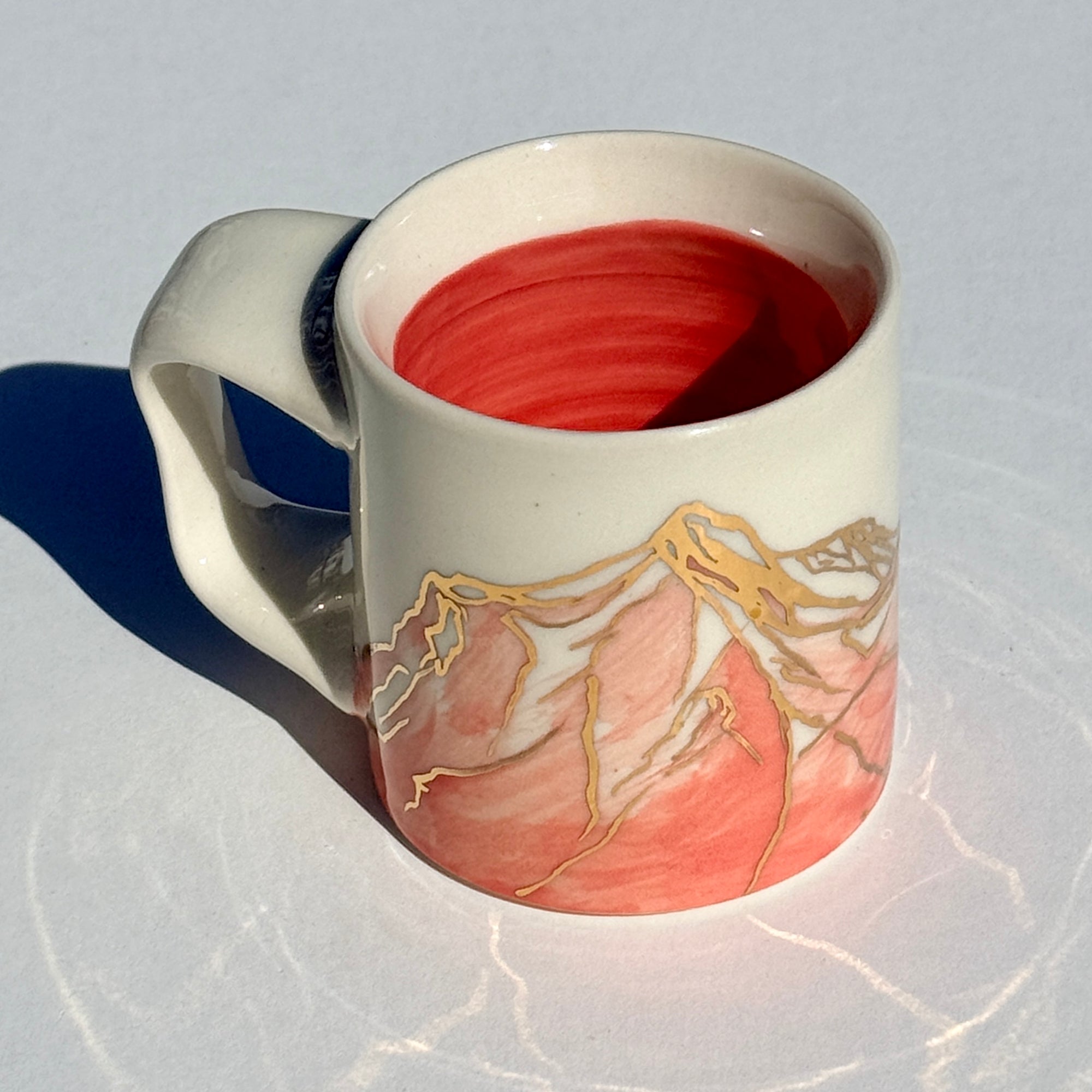 The sparkle on the pink mountains on this mug is 24k gold! The gold is applied to the glazed piece and the mug is fired an additional time.