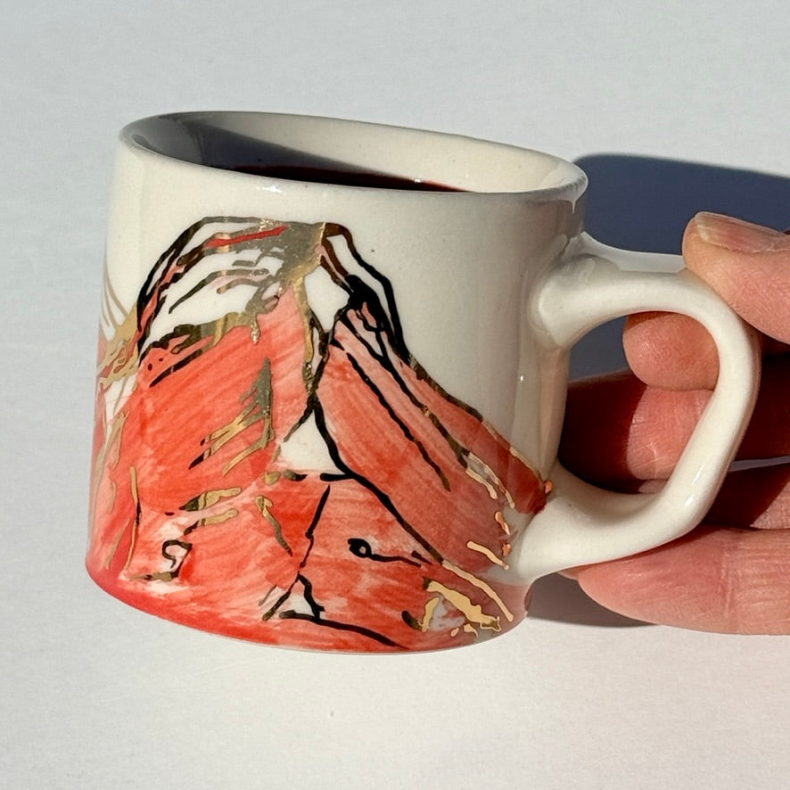 The sparkle on the reddish pink mountains on this mug is 24k gold! The gold is applied to the glazed piece and the mug is fired an additional time.
