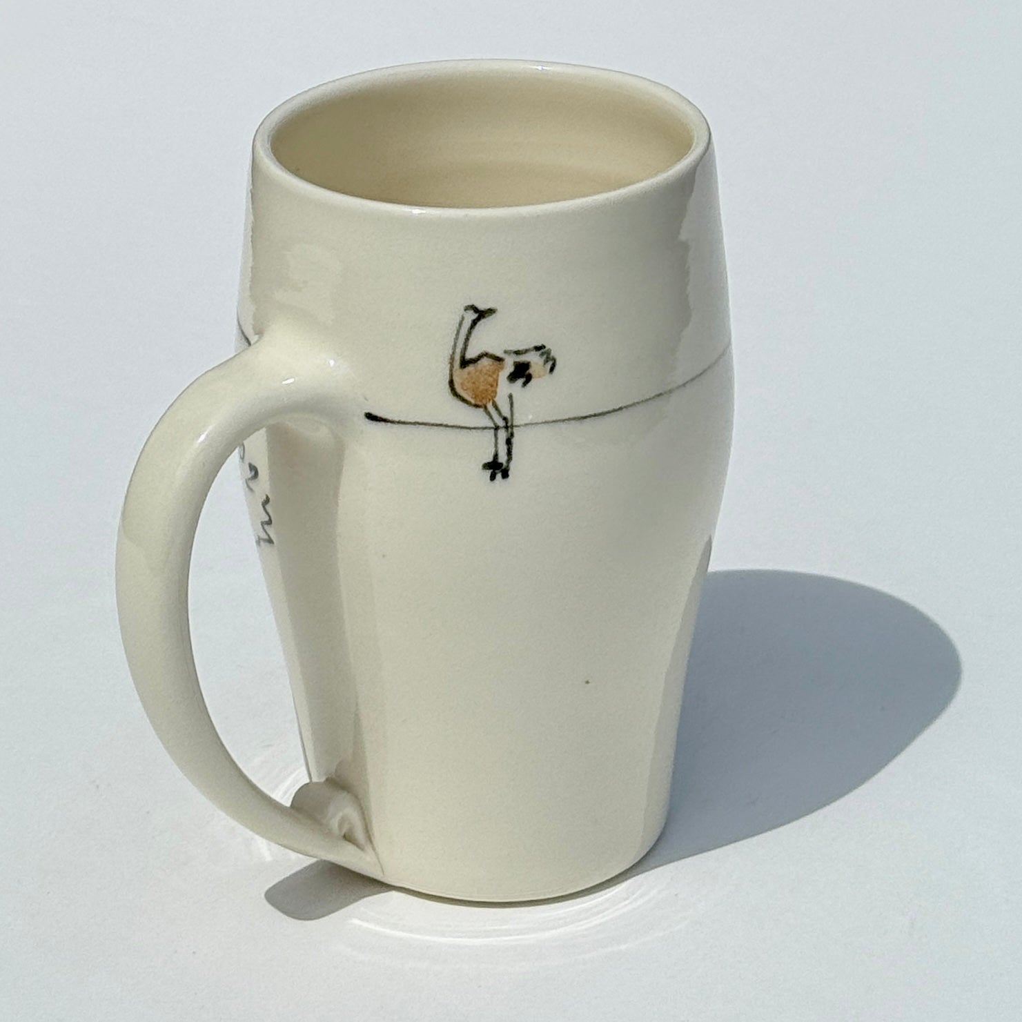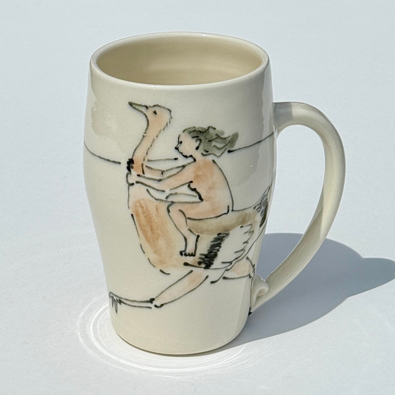 Porcelain mug with hand drawn picture of a nude woman riding an ostrich.