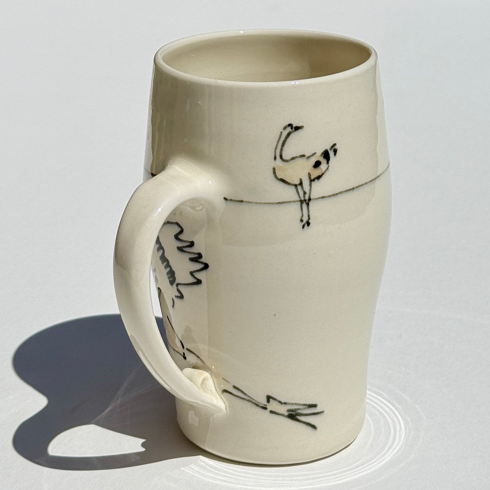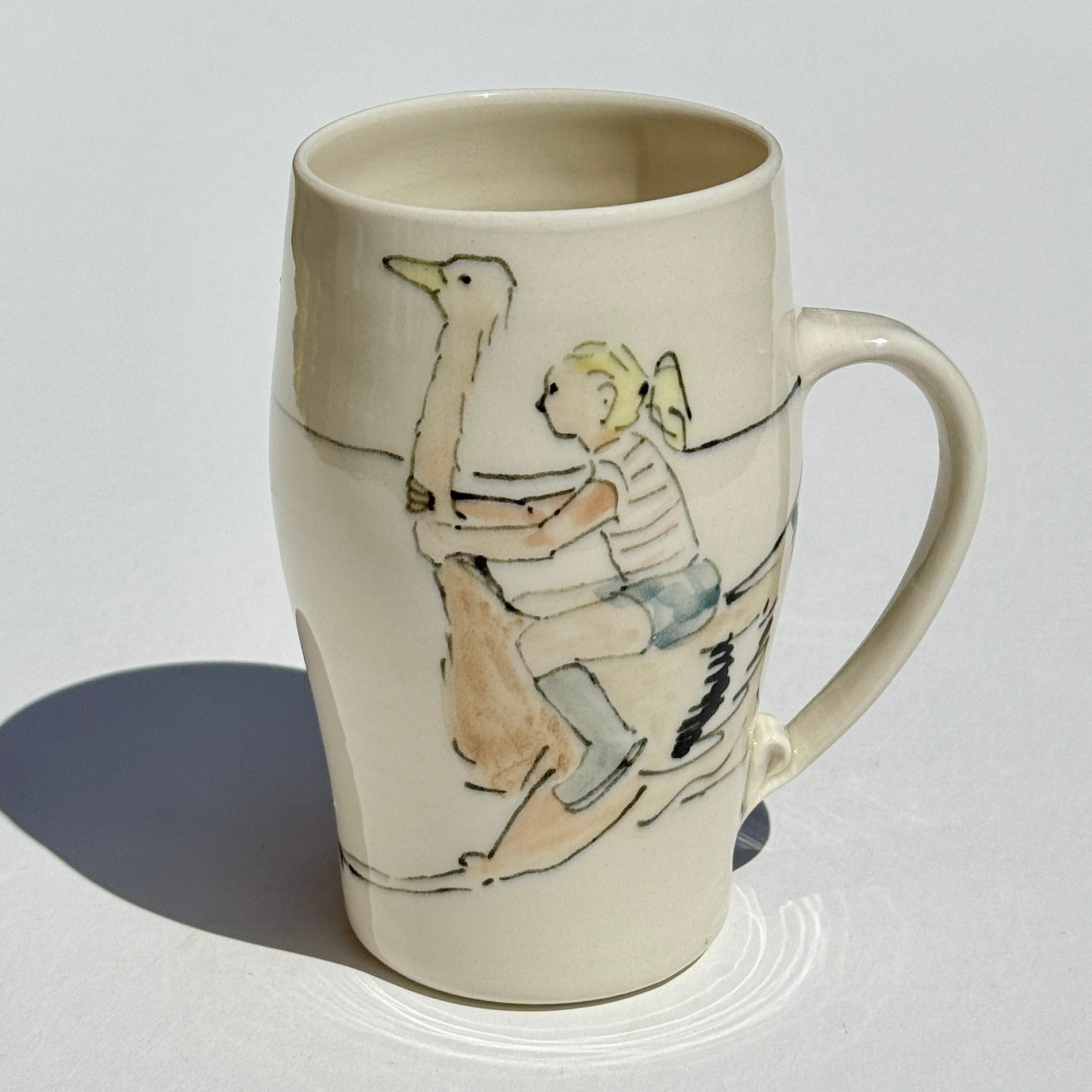 Porcelain mug with hand drawn picture of a clothed woman riding an ostrich.