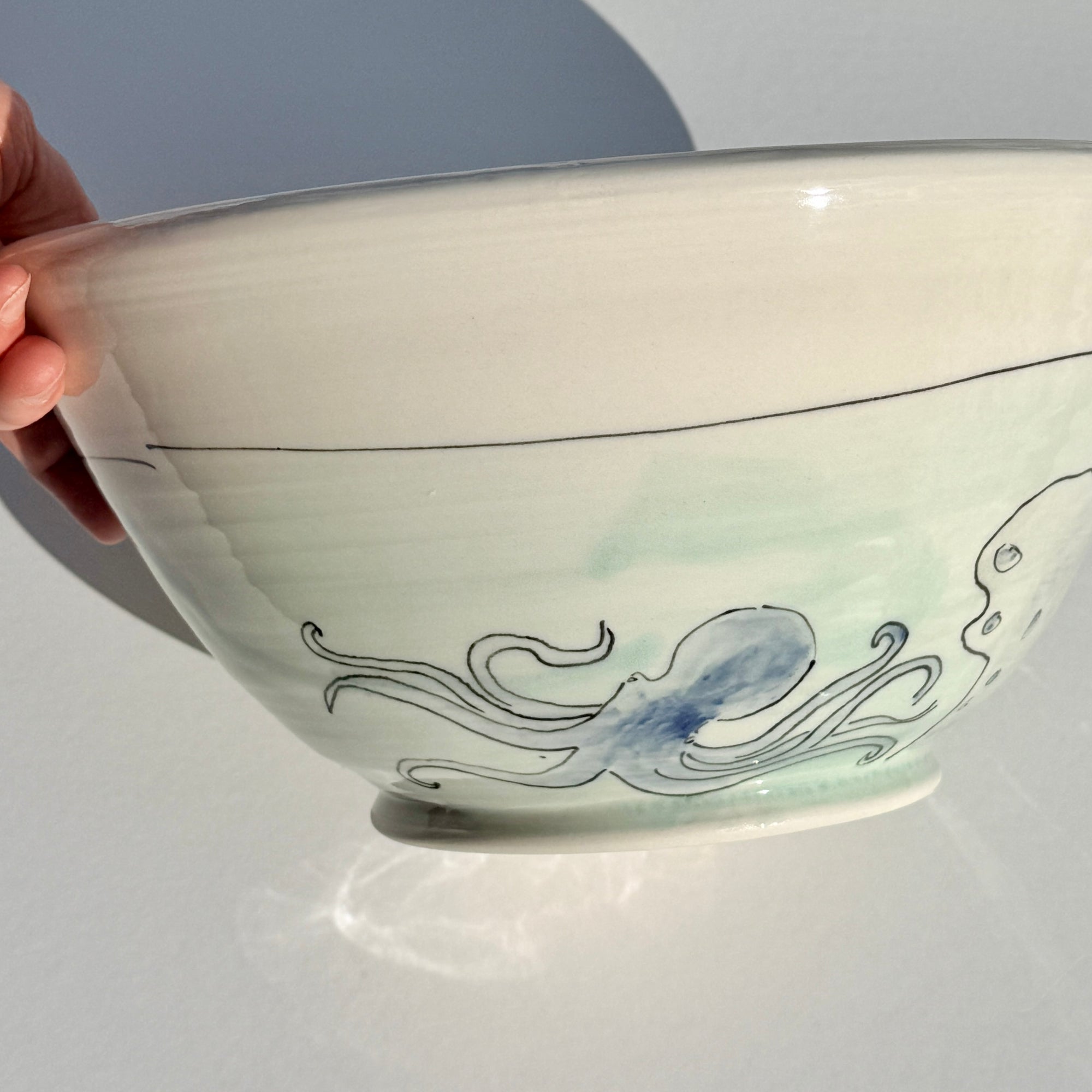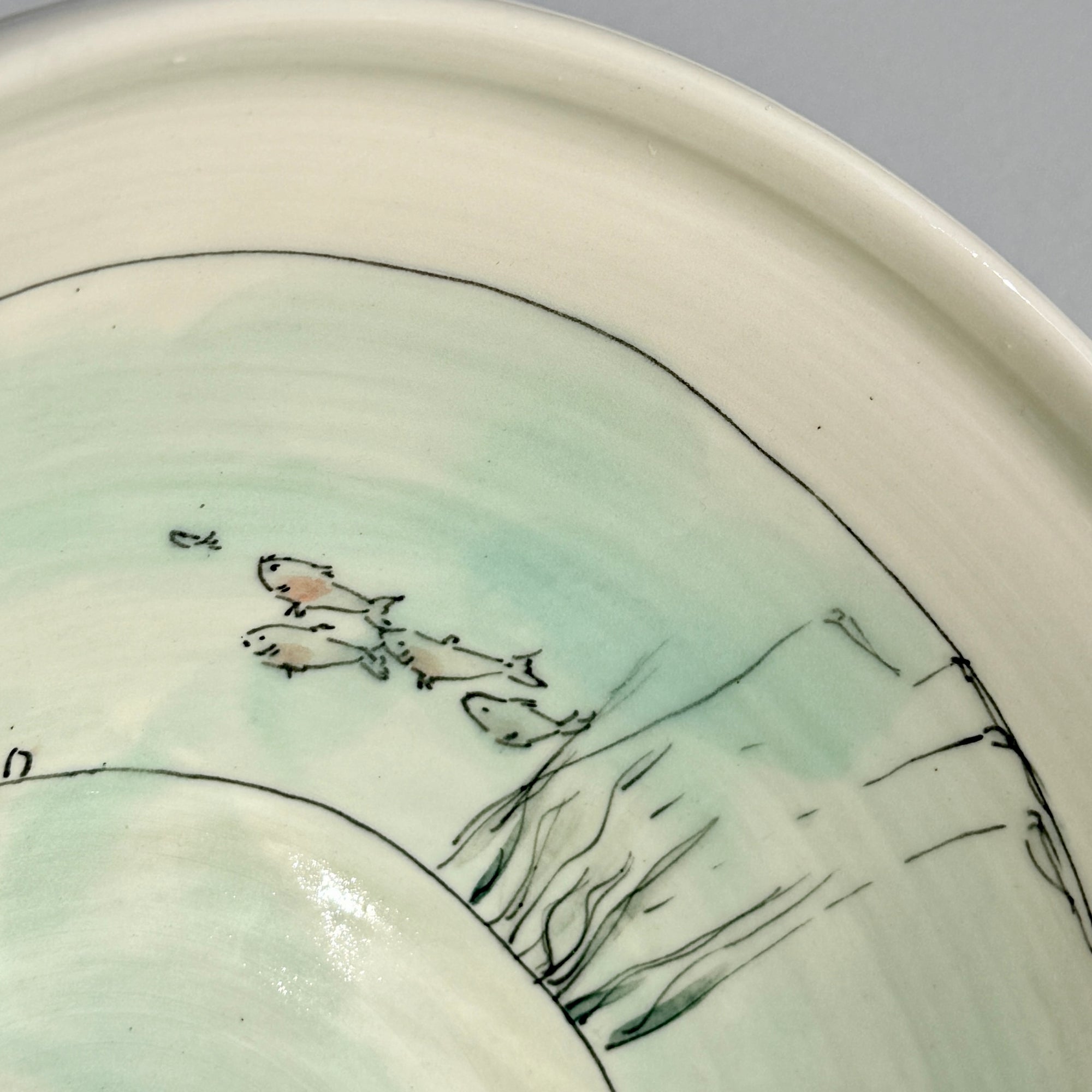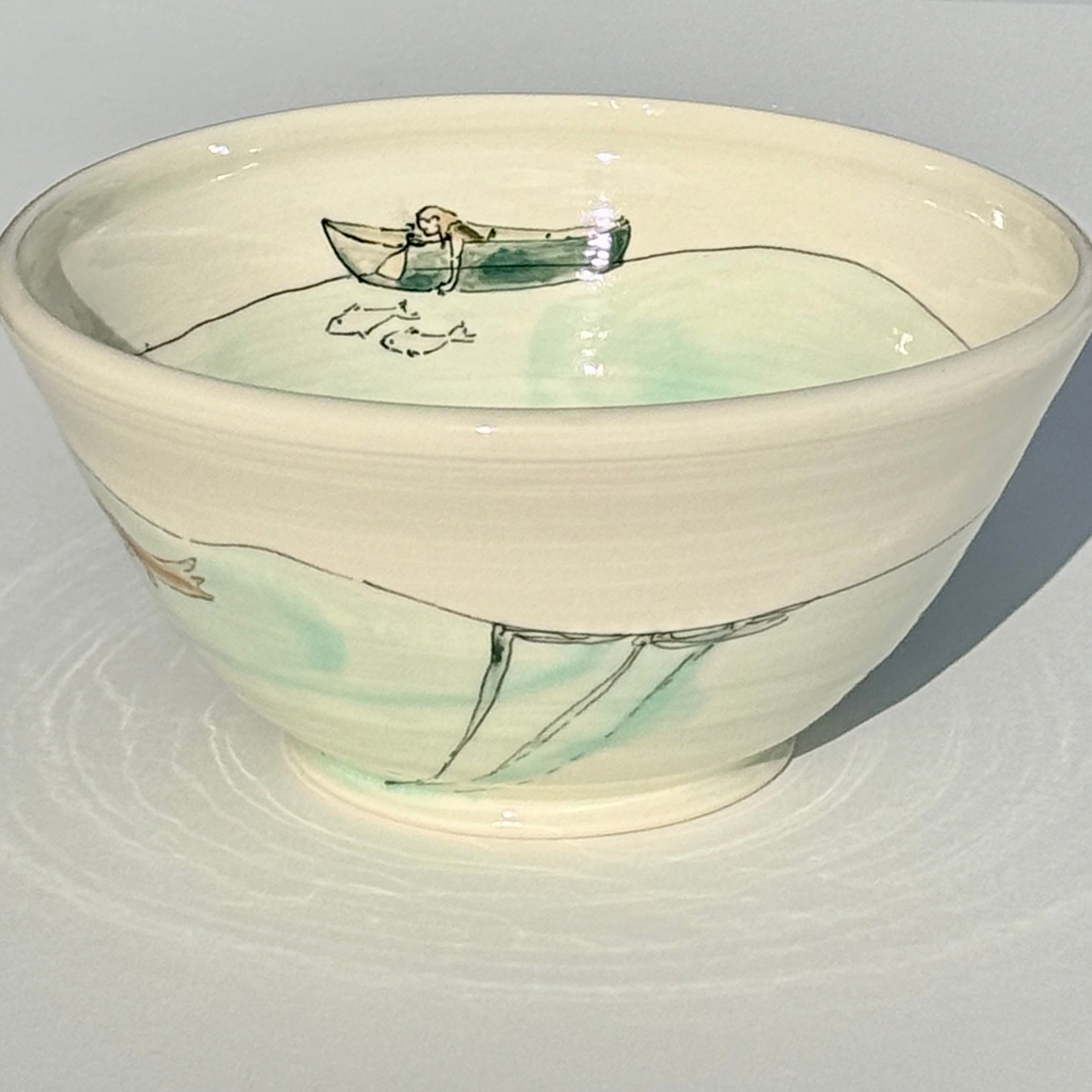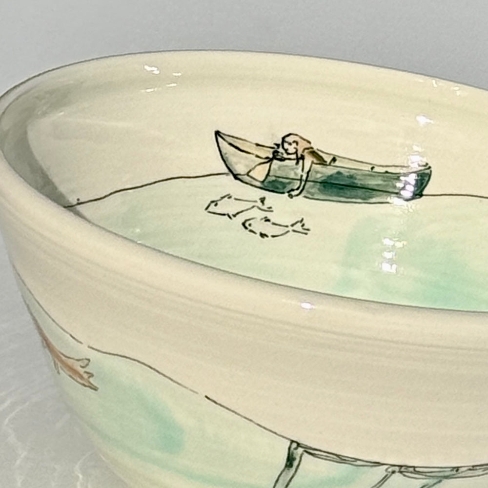 This bowl features a canoer paddling amongst a variety of sea creatures.About 28 centimetres wide and 14 centimetres tall.
