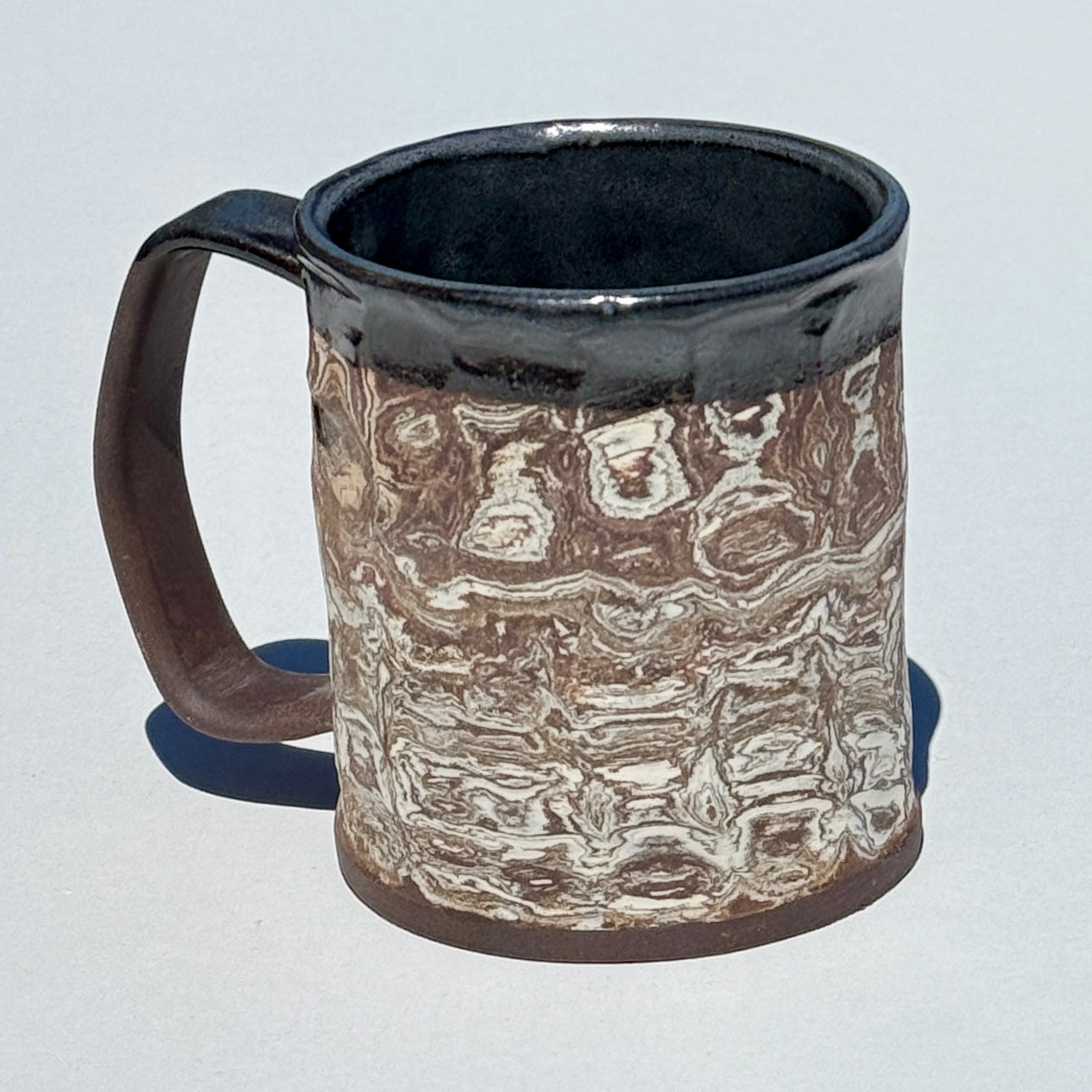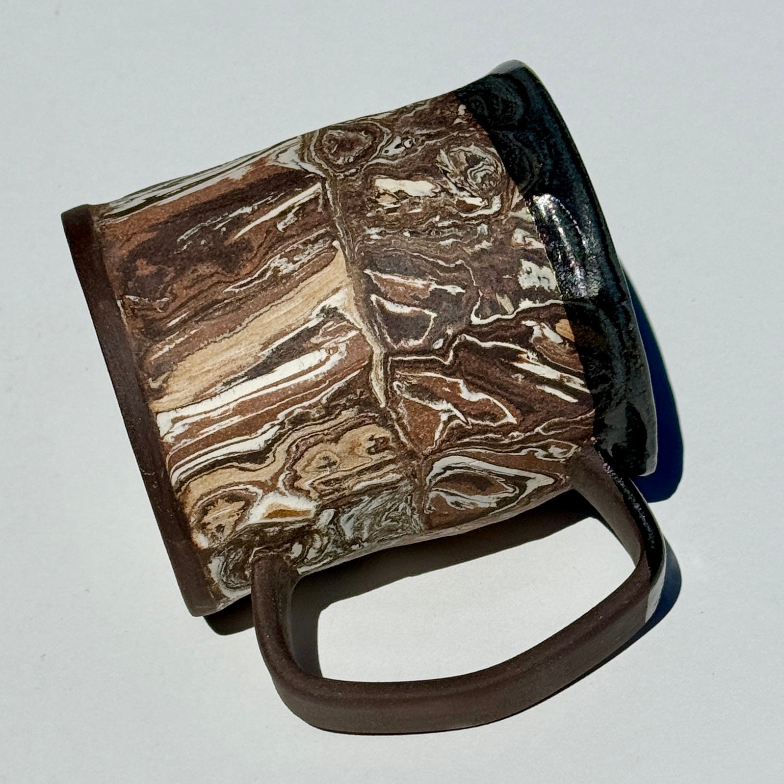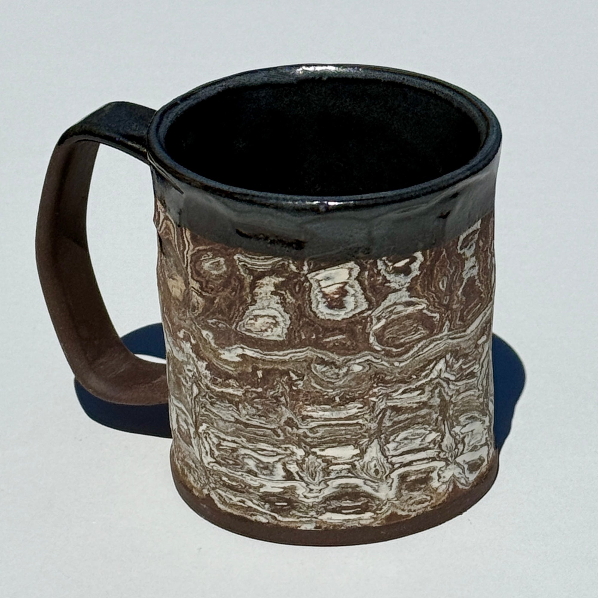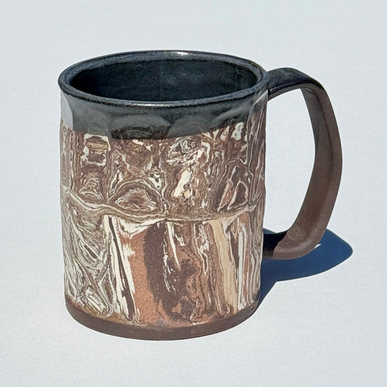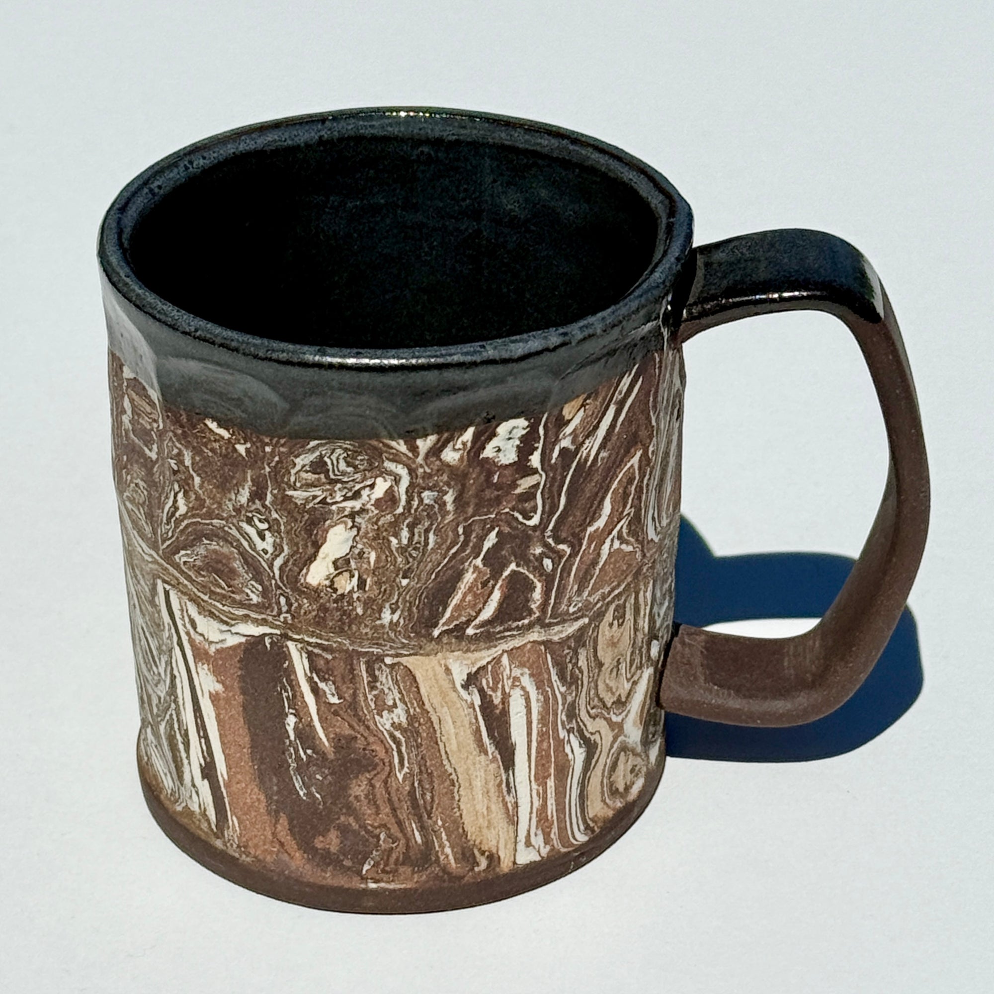 This mug features marbled and striped earth tones. It has a textured, unglazed exterior and a glazed interior.