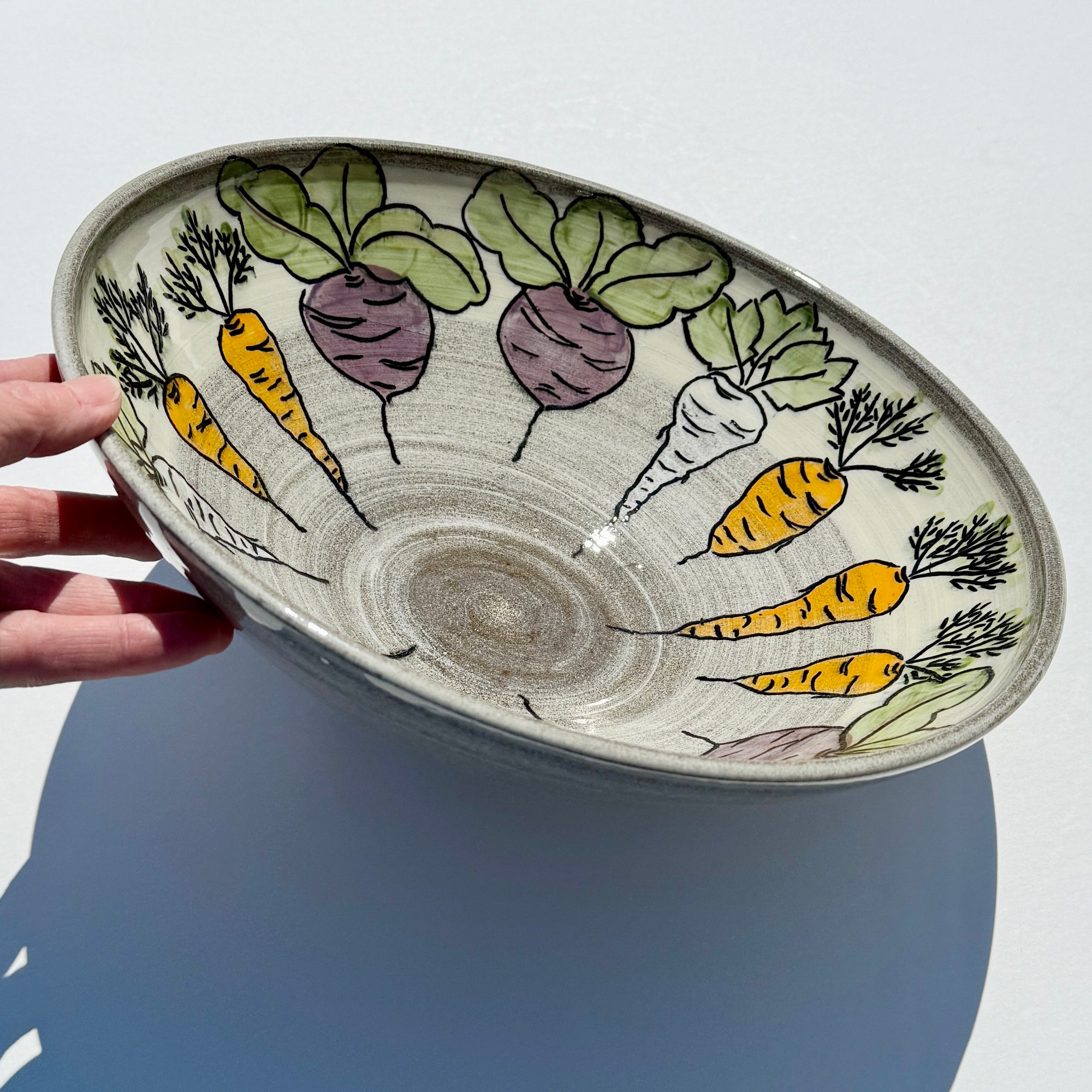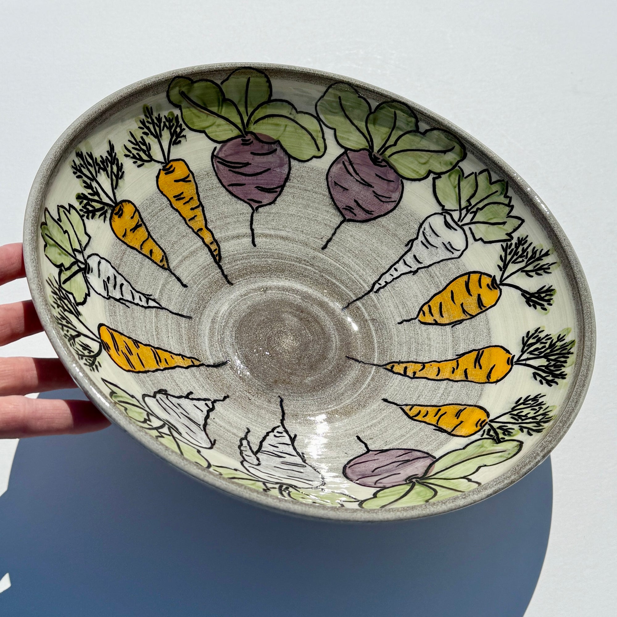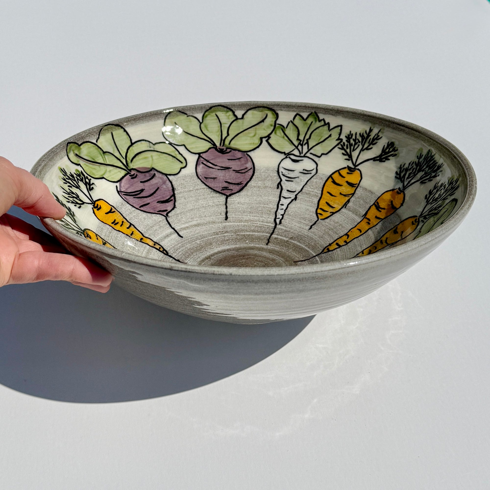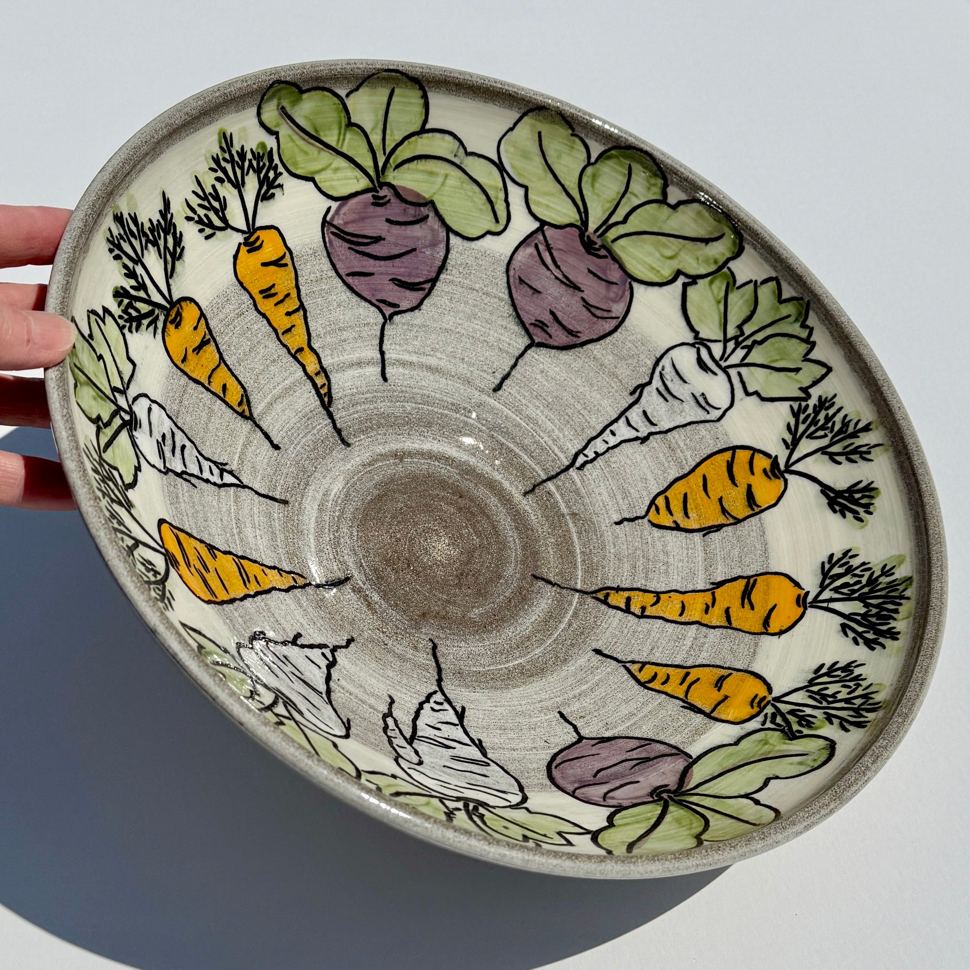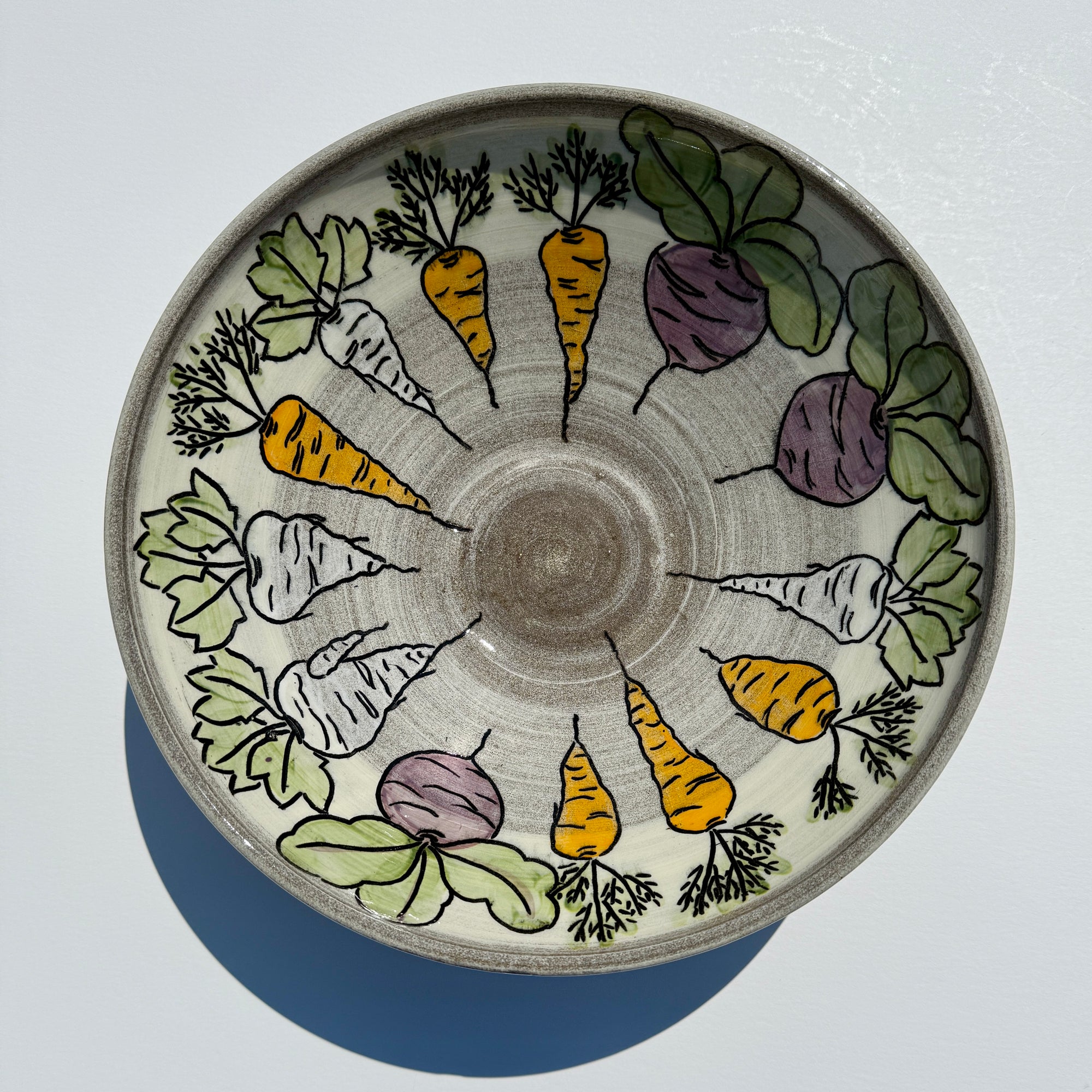 This large bowl made with granite coloured clay is decorated with carrot, parsnip, and turnip plants over white slip.