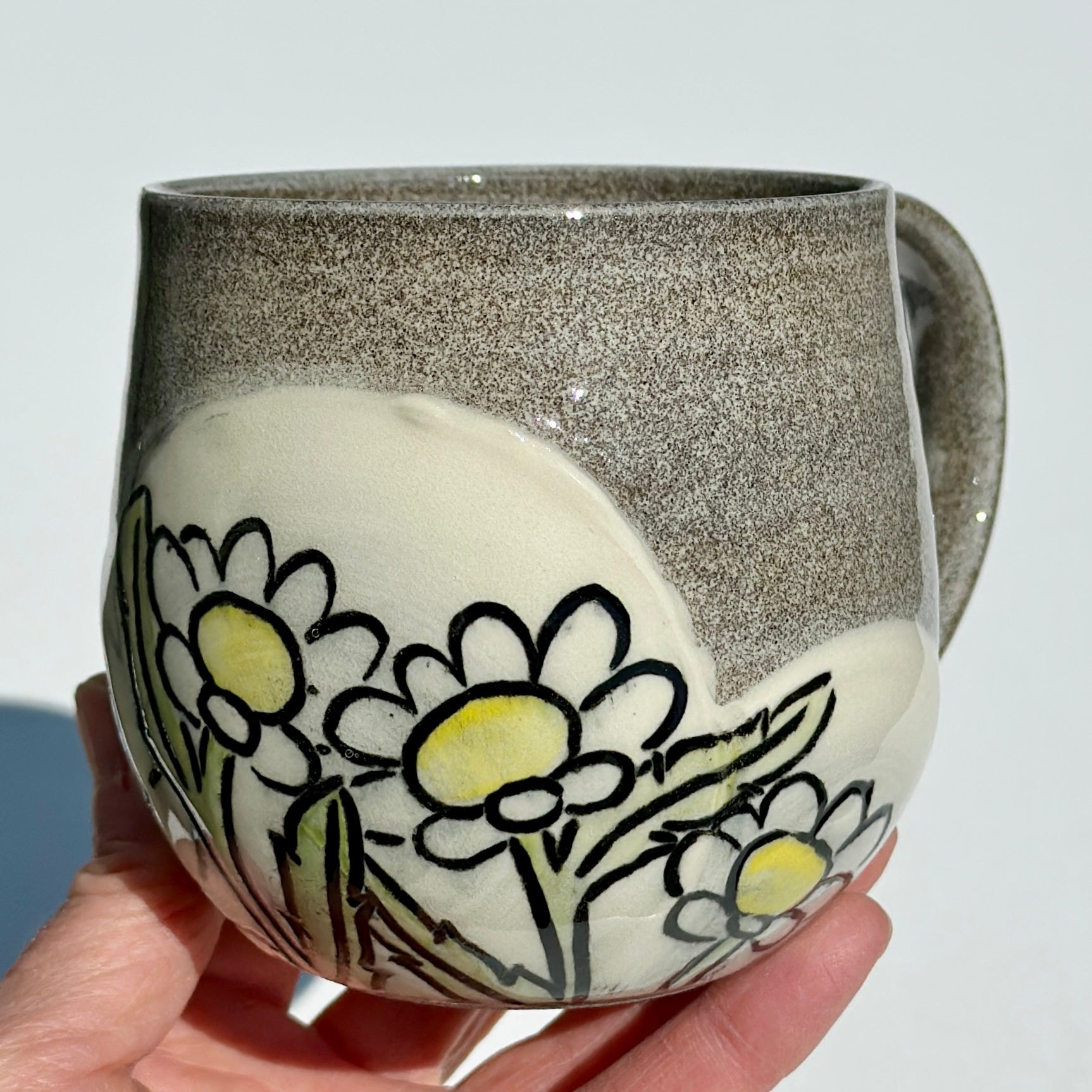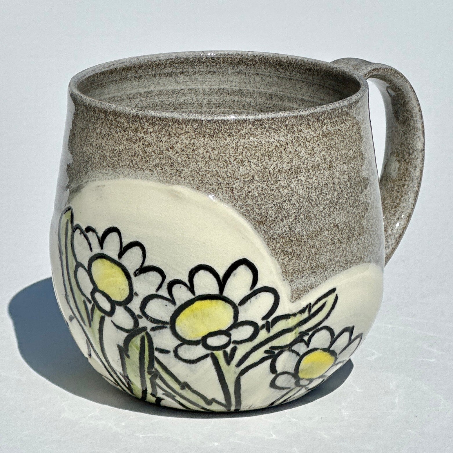 This round mug made with granite coloured clay features flowers over white slip.