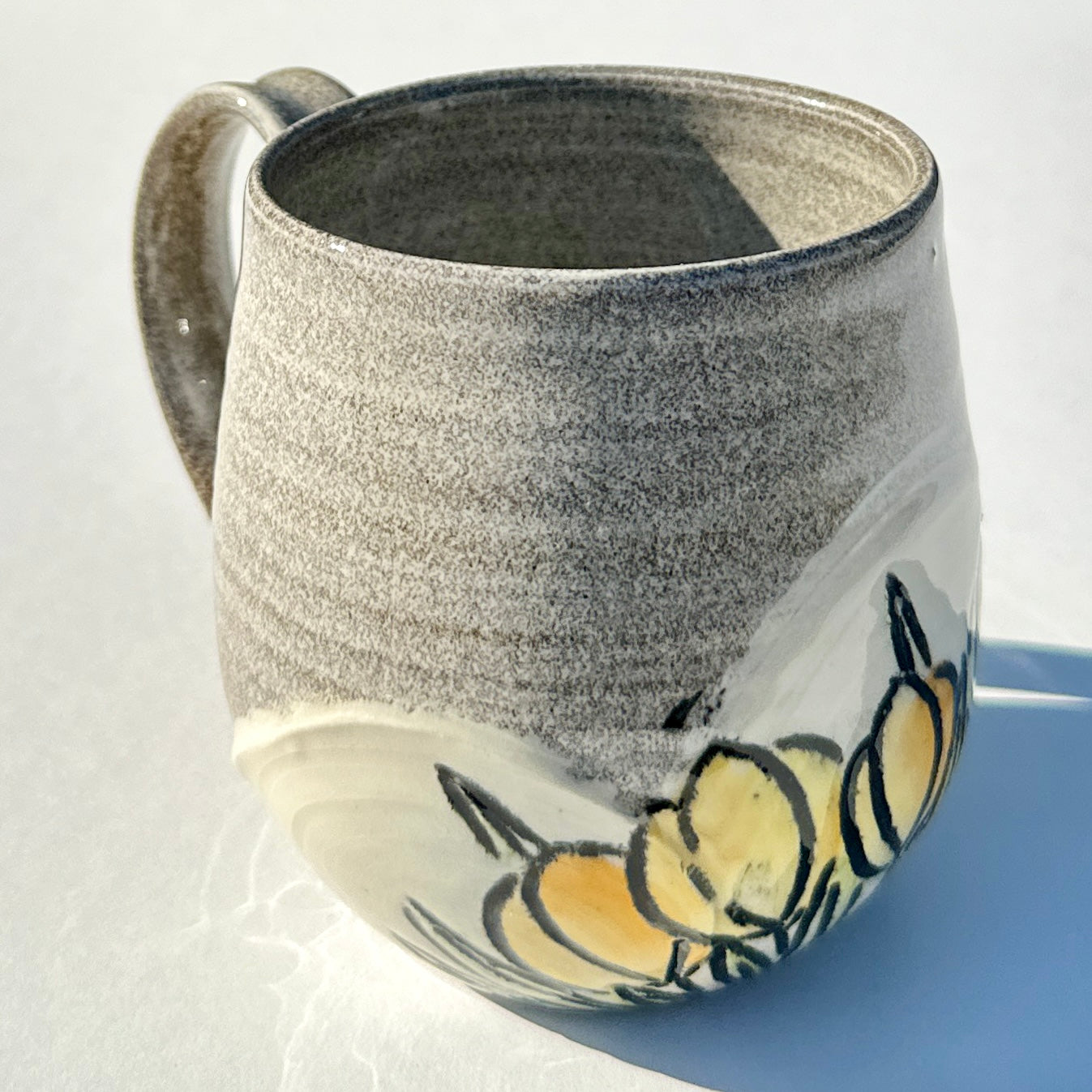 This round mug made with granite coloured clay features flowers over white slip.