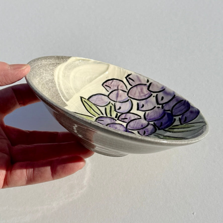 This small bowl made with granite coloured clay is decorated with lupine flowers over white slip.